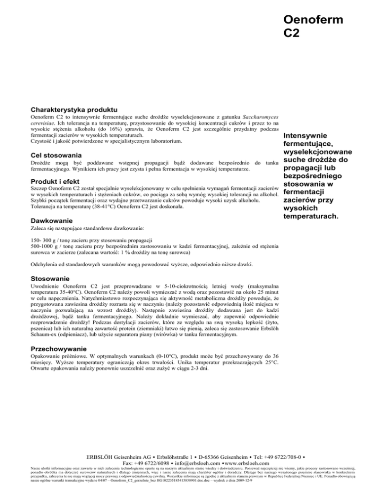 Oenoferm C2 Charakterystyka produktu Oenoferm C2 to intensywnie fermentujące suche drożdże wyselekcjonowane z gatunku Saccharomyces cerevisiae. Ich tolerancja na temperaturę, przystosowanie do wysokiej koncentracji cukrów i przez to na wysokie stężenia alkoholu (do 16%) sprawia, że Oenoferm C2 jest szczególnie przydatny podczas fermentacji zacierów w wysokich temperaturach. Czystość i jakość potwierdzone w specjalistycznym laboratorium. Cel stosowania Drożdże mogą być poddawane wstępnej propagacji bądź dodawane bezpośrednio do tanku fermentacyjnego. Wynikiem ich pracy jest czysta i pełna fermentacja w wysokiej temperaturze. Produkt i efekt Szczep Oenoferm C2 został specjalnie wyselekcjonowany w celu spełnienia wymagań fermentacji zacierów w wysokich temperaturach i stężeniach cukrów, co pociąga za sobą wymóg wysokiej tolerancji na alkohol. Szybki początek fermentacji oraz wydajne przetwarzanie cukrów powoduje wysoki uzysk alkoholu. Tolerancja na temperaturę (38-41°C) Oenoferm C2 jest doskonała. Dawkowanie Intensywnie fermentujące, wyselekcjonowane suche drożdże do propagacji lub bezpośredniego stosowania w fermentacji zacierów przy wysokich temperaturach. Zaleca się następujące standardowe dawkowanie: 150- 300 g / tonę zacieru przy stosowaniu propagacji 500-1000 g / tonę zacieru przy bezpośrednim zastosowaniu w kadzi fermentacyjnej, zależnie od stężenia surowca w zacierze (zalecana wartość: 1 % drożdży na tonę surowca) Odchylenia od standardowych warunków mogą powodować wyższe, odpowiednio niższe dawki. Stosowanie Uwodnienie Oenoferm C2 jest przeprowadzane w 5-10-ciokrotnością letniej wody (maksymalna temperatura 35-40°C). Oenoferm C2 należy powoli wymieszać z wodą oraz pozostawić na około 25 minut w celu napęcznienia. Natychmiastowo rozpoczynająca się aktywność metaboliczna drożdży powoduje, że przygotowana zawiesina drożdży rozrasta się w naczyniu (należy pozostawić odpowiednią ilość miejsca w naczyniu pozwalającą na wzrost drożdży). Następnie zawiesina drożdży dodawana jest do kadzi drożdżowej, bądź tanku fermentacyjnego. Należy dokładnie wymieszać, aby zapewnić odpowiednie rozprowadzenie drożdży! Podczas destylacji zacierów, które ze względu na swą wysoką lepkość (żyto, pszenica) lub ich naturalną zawartość protein (ziemniaki) łatwo się pienią, zaleca się zastosowanie Erbslöh Schaum-ex (odpieniacz), lub użycie separatora piany (wirówka) w tanku fermentacyjnym. Przechowywanie Opakowanie próżniowe. W optymalnych warunkach (0-10°C), produkt może być przechowywany do 36 miesięcy. Wyższe temperatury ograniczają okres trwałości. Unika temperatur przekraczających 25°C. Otwarte opakowania należy ponownie uszczelnić oraz zużyć w ciągu 2-3 dni. ERBSLÖH Geisenheim AG Erbslöhstraße 1 D-65366 Geisenheim Tel: +49 6722/708-0 Fax: +49 6722/6098 [email protected] www.erbsloeh.com Nasze ulotki informacyjne oraz zawarte w nich zalecenia technologiczne oparte są na naszym aktualnym stanie wiedzy i doświadczeniu. Ponieważ najczęściej nie wiemy, jakie procesy zastosowano wcześniej, ponadto obróbka ma dotyczyć surowców naturalnych i dlatego zmiennych, więc i nasze zalecenia mają charakter ogólny i doradczy. Dlatego bez naszego wyrażonego pisemnie stanowiska w konkretnym przypadku, zalecenia te nie mają wiążącej mocy prawnej z odpowiedzialnością cywilną. Wszystkie informacje są zgodne z aktualnym stanem prawnym w Republice Federalnej Niemiec i UE. Ponadto obowiązują nasze ogólne warunki transakcyjne wydane 04/07 – Oenoferm_C2_gorzelnie_bez HG102235185413830901.doc.doc – wydruk z dnia 2009-12-9