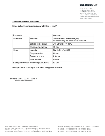 Karta techniczna produktu Kolce zabezpieczające przeciw ptactwu – typ V Wartość Parametr Podstawa Kolce materiał Polikarbonat, przeźroczysty, stabilizowany na promieniowanie UV Zakres temperatur Od -25ºC do +140ºC Długość podstawy 50 cm materiał Stal INOX Aisi 302 Długość kolca 11 cm Średnica kolca 1,3 mm Ilość kolców 40/mb Efektywny obszar ochrony (szerokość) 12 cm Uwaga! Dane dotyczące produktu mogą ulec zmianie. Bielsko-Biała, 20. 11. 2015 r. (miejsce i data wystawienia)