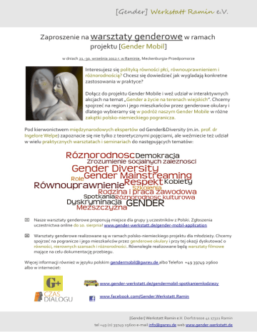 [Gender] Werkstatt Ramin e.V. Zaproszenie na warsztaty genderowe w ramach projektu [Gender Mobil] w dniach 21.-30. września 2012 r. w Raminie, Meckenburgia-Przedpomorze Interesujesz się polityką równości płci, równouprawnieniem i różnorodnością? Chcesz się dowiedzieć jak wygladają konkretne zastosowania w praktyce? Dołącz do projektu Gender Mobile i weź udział w interaktywnych akcjach na temat „Gender a życie na terenach wiejskich”. Chcemy spojrzeć na region i jego mieszkańców przez genderowe okulary i dlatego wybieramy się w podróż naszym Gender Mobile w różne zakątki polsko-niemieckiego pogranicza. Pod kierwonictwem międzynarodowych ekspertów od Gender&Diversity (m.in. prof. dr Ingelore Welpe) zapoznacie się nie tylko z teoretycznymi pojęciami, ale weźmiecie też udział w wielu praktycznych warsztatach i seminariach do następujących tematów: Nasze warsztaty genderowe proponują miejsce dla grupy 3 uczestników z Polski. Zgłoszenia uczestnictwa online do 10. sierpnia! www.gender-werkstatt.de/gender-mobil-application Warsztaty genderowe realizowane są w ramach polsko-niemieckiego projektu dla młodzieży. Chcemy spojrzeć na pogranicze i jego mieszkańców przez genderowe okulary i przy tej okazji dyskutować o równości, nierownych szansach i różnorodności. Równolegle realizowane będą warsztaty filmowe mające na celu dokumentację przebiegu. Więcej informacji również w języku polskim [email protected] albo Telefon +49 39749 29600 albo w interneciet: www.gender-werkstatt.de/gendermobil-spotkaniemlodziezy www.facebook.com/Gender.Werkstatt.Ramin [Gender] Werkstatt Ramin e.V. Dorfstrasse 41 17321 Ramin tel +49 (0) 39749 29600 e-mail [email protected] web www.gender-werkstatt.de