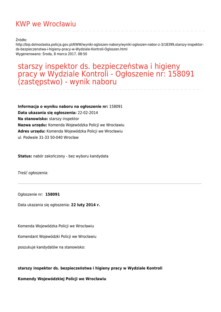 KWP we Wrocławiu Źródło: http://bip.dolnoslaska.policja.gov.pl/KWW/wyniki-ogloszen-nabory/wyniki-ogloszen-nabor-z-3/18399,starszy-inspektords-bezpieczenstwa-i-higieny-pracy-w-Wydziale-Kontroli-Ogloszen.html Wygenerowano: Środa, 8 marca 2017, 08:50 starszy inspektor ds. bezpieczeństwa i higieny pracy w Wydziale Kontroli - Ogłoszenie nr: 158091 (zastępstwo) - wynik naboru Informacja o wyniku naboru na ogłoszenie nr: 158091 Data ukazania się ogłoszenia: 22-02-2014 Na stanowisko: starszy inspektor Nazwa urzędu: Komenda Wojewódzka Policji we Wrocławiu Adres urzędu: Komenda Wojewódzka Policji we Wrocławiu ul. Podwale 31-33 50-040 Wrocław Status: nabór zakończony - bez wyboru kandydata Treść ogłoszenia: Ogłoszenie nr: 158091 Data ukazania się ogłoszenia: 22 luty 2014 r. Komenda Wojewódzka Policji we Wrocławiu Komendant Wojewódzki Policji we Wrocławiu poszukuje kandydatów na stanowisko: starszy inspektor ds. bezpieczeństwa i higieny pracy w Wydziale Kontroli Komendy Wojewódzkiej Policji we Wrocławiu W miesiącu poprzedzającym datę upublicznienia ogłoszenia wskaźnik zatrudnienia osób niepełnosprawnych w urzędzie, w rozumieniu przepisów o rehabilitacji zawodowej i społecznej oraz zatrudnianiu osób niepełnosprawnych jest niższy niż 6% ogłoszenie o naborze w celu zastępstwa nieobecnego członka korpusu służby cywilnej Wymiar etatu: 1 Liczba stanowisk pracy: 1 Adres urzędu: Komenda Wojewódzka Policji we Wrocławiu ul. Podwale 31-33 50-040 Wrocław Miejsce wykonywania pracy: Wrocław Zakres zadań wykonywanych na stanowisku pracy: - tworzenie programów oraz dokumentacji związanej z procesem szkolenia okresowego w zakresie bhp - realizowanie szkoleń okresowych w zakresie bezpieczeństwa i higieny służby i pracy - udział w pracach projektowych dotyczących szkoleń - prowadzenie innych zajęć dydaktycznych w zakresie bhp zgodnie ze zgłoszonymi potrzebami szkoleniowymi - udzielanie wsparcia merytorycznego jednostkom i komórkom organizacyjnym KWP we Wrocławiu w procesie realizacji programów szkoleń w zakresie bhp - zaznajamianie się z analizą stanu bhp i p.poż. oraz ryzyka zawodowego celem zapewnienia pracownikom i funkcjonariuszom aktualnych informacji dotyczących bezpiecznych i higienicznych warunków pracy Warunki pracy Warunki dotyczące charakteru pracy na stanowisku i sposobu wykonywania zadań - praca okresowo wykonywana w terenie - możliwość wyjazdów służbowych Miejsce i otoczenie organizacyjno-techniczne - praca przy oświetleniu sztucznym i naturalnym - narzędzia pracy: komputer (praca przy monitorze ekranowym powyżej 4 godzin dziennie), rzutnik, telefon, fax Wymagania związane ze stanowiskiem pracy niezbędne wykształcenie: wyższe, studia podyplomowe w zakresie bhp doświadczenie zawodowe: 2 lata doświadczenia zawodowego w obszarze bhp pozostałe wymagania niezbędne: - umiejętność interpretacji przepisów i analizowania danych - kreatywność, komunikatywność - umiejętność radzenia sobie w sytuacjach stresowych - terminowość, umiejętność organizowania pracy - umiejętność obsługi urządzeń stosowanych w procesie szkoleń - umiejętności analityczne, organizacyjne i interpersonalne Wymagania dodatkowe: - kurs dla inspektorów ochrony p.poż. - uprawnienia pedagogiczne do kształcenia dorosłych dla osób z wyższym wykształceniem - Wymagane dokumenty i oświadczenia: - życiorys i list motywacyjny - oświadczenie kandydata o wyrażeniu zgody na przetwarzanie danych osobowych do celów rekrutacji, - oświadczenie kandydata o korzystaniu z pełni praw publicznych - oświadczenie kandydata o nieskazaniu prawomocnym wyrokiem za umyślne przestępstwo lub umyślne przestępstwo skarbowe - kopia dokumentów potwierdzających wykształcenie, - kopia dokumentu potwierdzającego posiadanie polskiego obywatelstwa lub oświadczenie o posiadaniu obywatelstwa polskiego Kopie innych dokumentów i oświadczenia: - kopia dokumentu potwierdzającego niepełnosprawność- w przypadku kandydatów, którzy zamierzają skorzystać z pierwszeństwa w zatrudnieniu, w przypadku, gdy znajdą się w gronie najlepszych kandydatów - kopie dokumentów potwierdzających wymagany staż, kwalifikacje itp. Termin składania dokumentów: 28 luty 2014 Miejsce składania dokumentów: Komenda Wojewódzka Policji we Wrocławiu Wydział Kadr i Szkolenia ul. Podwale 31-33 50-040 Wrocław Inne informacje: W aplikacji kandydaci powinni wskazać numer ogłoszenia o naborze. Wysokość proponowanego wynagrodzenia zasadniczego: mnożnik kwoty bazowej 1,250 tj. 2 342,30 zł brutto. Kandydaci, którzy spełnią wymogi formalne określone w ogłoszeniu zostaną poinformowani telefonicznie lub drogą elektroniczną o terminie kolejnego etapu naboru. Aplikacje niekompletne, nie zawierające wskazanych w ogłoszeniu dokumentów i oświadczeń opatrzonych własnoręcznym podpisem kandydata lub złożone/nadesłane po terminie nie będą rozpatrywane. Aplikacje można przesyłać tradycyjną drogą pocztową (znaczenie ma data stempla pocztowego) lub składając w Punkcie Obsługi Interesanta KWP we Wrocławiu. Do udziału w naborze zachęca się osoby niepełnosprawne. KWP we Wrocławiu nie ponosi odpowiedzialności za treść ogłoszeń o prowadzonych naborach, publikowanych w komercyjnych portalach internetowych lub innych źródłach informacji o podobnym charakterze. Metryczka Data publikacji 31.03.2014 Data modyfikacji 16.06.2016 Rejestr zmian Podmiot udostępniający informację: Biuletyn Informacji Publicznej Osoba wytwarzająca/odpowiadająca za informację: Joanna Strąk - Wydział Kadr i Szkolenia Osoba udostępniająca informację: Krzysztof Morzyński - Wydział Prezydialny KWP we Wrocławiu Osoba modyfikująca informację: Krzysztof Morzyński
