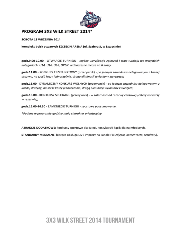 PROGRAM 3X3 WILK STREET 2014* 2014 SOBOTA 13 WRZEŚNIA 2014 kompleks boisk otwartych SZCZECIN ARENA (ul. Szafera 3, w Szczecinie) tur we wszystkich godz.9.00-10.00 - OTWARCIE TURNIEJU - szybka weryfikacja zgłoszeń i start turnieju kategoriach: U14, U16, U18, OPEN. Jednoczesne mecze na 6 koszy. godz.11.00 - KONKURS TRZYPUNKTOWY (przerywnik) - po jednym zawodniku delegowanym z każdej drużyny, na sześć koszy jednocześnie, drogą eliminacji wyłoniony zwycięzca; godz.13.00 - DYNAMICZNY KONKURS WOLNYCH (przerywnik) - po jednym zawodniku delegowanym z każdej drużyny, na sześć koszy jednocześnie, drogą eliminacji wyłoniony zwycięzca; zwycięzca godz.15.00 - KONKURSY SPECJALNE (przerywnik) - w zależności od rezerwy czasowej (cztery konkursy w rezerwie); godz.16.00-16.30 - ZAMKNIĘCIE TURNIEJU - sportowe podsumowanie. *Podane Podane w programie godziny mają charakter orientacyjny. ATRAKCJE DODATKOWE: konkursy sportowe dla dzieci, koszykarski kącik dla najmłodszych. najmłodszych STANDARDY MEDIALNE: bieżąca obsługa LIVE imprezy na kanale FB (zdjęcia, (zdjęcia, komentarze, rezultaty). rezultaty 3X3 WILK STREET 2014 TOURNAMENT