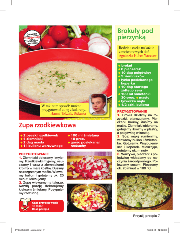 Brokuły pod pierzynką Gotowała pis Przyślij prze redakcyjna kucharka Rodzina czeka na każde z moich nowych dań. Agnieszka Huber, Wrocław ● brokuł ● 8 pieczarek ● 10 dag polędwicy ● 5 ziemniaków ● łyżka posiekanego koperku dag startego żółtego sera ● 100 ml śmietanki 30-proc. ● masło ● łyżeczka mąki ● 1/2 szkl. bulionu ● 10 W taki sam sposób można przygotować zupę z kalarepy. Hanna Tołczyk, Bielanka Zupa rzodkiewkowa ●2 ●4 ●2 ●1 pęczki rzodkiewek ziemniaki dag masła l bulionu warzywnego PRZYGOTOWANIE 1. Ziemniaki obieramy i myjemy. Rzodkiewki myjemy, osuszamy i wraz z ziemniakami kroimy w małą kostkę. Dusimy na rozgrzanym maśle. Wlewamy bulion i gotujemy ok. 20 minut. Miksujemy. 2. Zupę wlewamy na talerze. Każdą porcję dekorujemy kleksem śmietany. Posypujemy rzeżuchą. ● 100 ml śmietany 18-proc. ● garść posiekanej rzeżuchy PRZYGOTOWANIE 1. Brokuł dzielimy na różyczki, blanszujemy. Pieczarki kroimy, dusimy na maśle. Ziemniaki obieramy, gotujemy i kroimy w plastry, a polędwicę w kostkę. 2. Sos: mąkę rumienimy, wlewamy bulion i śmietankę. Gotujemy. Wsypujemy ser i koperek. Mieszając, gotujemy ok. minuty. 3. Warzywa, pieczarki i polędwicę wkładamy do naczynia żaroodpornego. Polewamy sosem. Pieczemy ok. 20 minut w 180 °C. Czas przygotowania 45 minut Ilość porcji 4 Przyślij przepis 7 PP0511s0409_sezon.indd 7 16-03-11 12:08:39