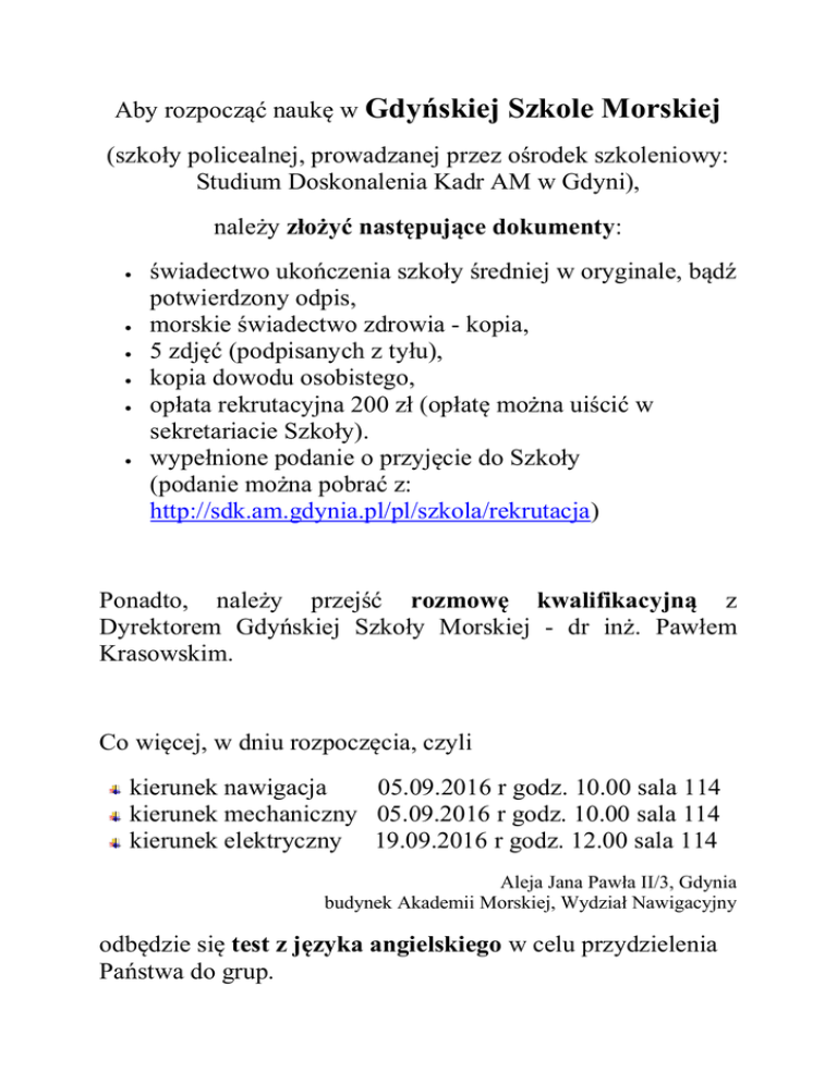 Aby rozpocząć naukę w Gdyńskiej Szkole Morskiej (szkoły policealnej, prowadzanej przez ośrodek szkoleniowy: Studium Doskonalenia Kadr AM w Gdyni), należy złożyć następujące dokumenty: świadectwo ukończenia szkoły średniej w oryginale, bądź potwierdzony odpis, morskie świadectwo zdrowia - kopia, 5 zdjęć (podpisanych z tyłu), kopia dowodu osobistego, opłata rekrutacyjna 200 zł (opłatę można uiścić w sekretariacie Szkoły). wypełnione podanie o przyjęcie do Szkoły (podanie można pobrać z: http://sdk.am.gdynia.pl/pl/szkola/rekrutacja) Ponadto, należy przejść rozmowę kwalifikacyjną z Dyrektorem Gdyńskiej Szkoły Morskiej - dr inż. Pawłem Krasowskim. Co więcej, w dniu rozpoczęcia, czyli kierunek nawigacja 05.09.2016 r godz. 10.00 sala 114 kierunek mechaniczny 05.09.2016 r godz. 10.00 sala 114 kierunek elektryczny 19.09.2016 r godz. 12.00 sala 114 Aleja Jana Pawła II/3, Gdynia budynek Akademii Morskiej, Wydział Nawigacyjny odbędzie się test z języka angielskiego w celu przydzielenia Państwa do grup.