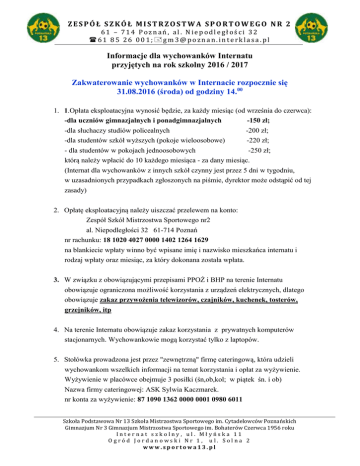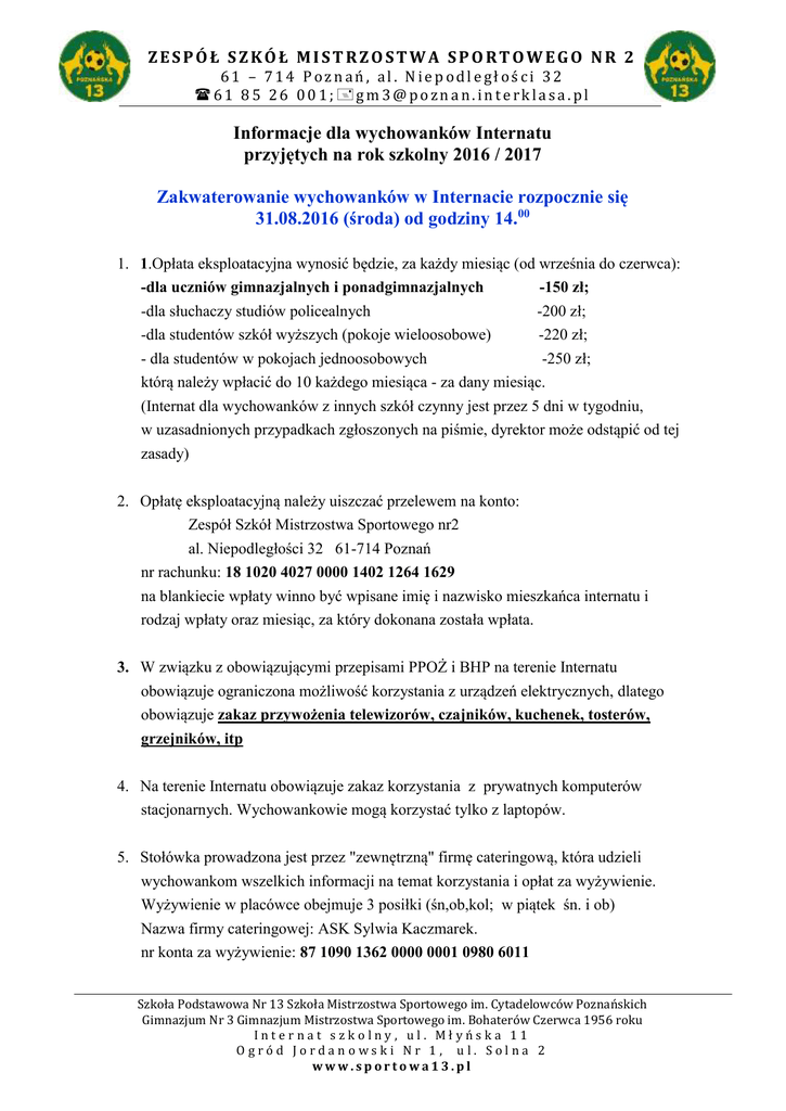 ZESPÓŁ SZKÓŁ MISTRZOSTWA SPORTOWEGO NR 2 61 – 714 Poznań, al. Niepodległości 32 61 85 26 001;[email protected] Informacje dla wychowanków Internatu przyjętych na rok szkolny 2016 / 2017 Zakwaterowanie wychowanków w Internacie rozpocznie się 31.08.2016 (środa) od godziny 14.00 1. 1.Opłata eksploatacyjna wynosić będzie, za każdy miesiąc (od września do czerwca): -dla uczniów gimnazjalnych i ponadgimnazjalnych -150 zł; -dla słuchaczy studiów policealnych -200 zł; -dla studentów szkół wyższych (pokoje wieloosobowe) -220 zł; - dla studentów w pokojach jednoosobowych -250 zł; którą należy wpłacić do 10 każdego miesiąca - za dany miesiąc. (Internat dla wychowanków z innych szkół czynny jest przez 5 dni w tygodniu, w uzasadnionych przypadkach zgłoszonych na piśmie, dyrektor może odstąpić od tej zasady) 2. Opłatę eksploatacyjną należy uiszczać przelewem na konto: Zespół Szkół Mistrzostwa Sportowego nr2 al. Niepodległości 32 61-714 Poznań nr rachunku: 18 1020 4027 0000 1402 1264 1629 na blankiecie wpłaty winno być wpisane imię i nazwisko mieszkańca internatu i rodzaj wpłaty oraz miesiąc, za który dokonana została wpłata. 3. W związku z obowiązującymi przepisami PPOŻ i BHP na terenie Internatu obowiązuje ograniczona możliwość korzystania z urządzeń elektrycznych, dlatego obowiązuje zakaz przywożenia telewizorów, czajników, kuchenek, tosterów, grzejników, itp 4. Na terenie Internatu obowiązuje zakaz korzystania z prywatnych komputerów stacjonarnych. Wychowankowie mogą korzystać tylko z laptopów. 5. Stołówka prowadzona jest przez "zewnętrzną" firmę cateringową, która udzieli wychowankom wszelkich informacji na temat korzystania i opłat za wyżywienie. Wyżywienie w placówce obejmuje 3 posiłki (śn,ob,kol; w piątek śn. i ob) Nazwa firmy cateringowej: ASK Sylwia Kaczmarek. nr konta za wyżywienie: 87 1090 1362 0000 0001 0980 6011 Szkoła Podstawowa Nr 13 Szkoła Mistrzostwa Sportowego im. Cytadelowców Poznańskich Gimnazjum Nr 3 Gimnazjum Mistrzostwa Sportowego im. Bohaterów Czerwca 1956 roku Internat szkolny, ul. Młyńska 11 Ogród Jordanowski Nr 1, ul. Solna 2 www.sportowa13.pl ZESPÓŁ SZKÓŁ MISTRZOSTWA SPORTOWEGO NR 2 61 – 714 Poznań, al. Niepodległości 32 61 85 26 001;[email protected] Ceny posiłków w roku szkolnym 2016/2017 kształtują się następująco: Śniadanie 6.00 zł 6.00-9.00 Obiad 8.00 zł 13.00-17.00 Kolacja 6.00 zł 18.30-20.00 tel. do kuchni 531 537 020 6. Każdy z wychowanków zobowiązany jest do przywiezienia własnej pościeli. 7. Uczniowie Zespołu Szkół Mistrzostwa Sportowego nr 2 uczęszczających do klas prowadzonych z WZPN czyli tzw. kadra okręgu - w szkole są to klasy 1b, 2b, 3b nie wnoszą comiesięcznych opłat eksploatacyjnych na konto szkoły ani za wyżywienie na konto firmy cateringowej- za ich pobyt opłaty wnosi WZPN. Natomiast rodzice uczniów klas 1b, 2b, 3b winni co miesiąc wpłacać 250,00 zł na konto WZPN 05 1090 2734 0000 0001 1804 9485 (Tel. do WZPN 61 8519918, 61 8519608) Rodzice uczniów uczęszczających do klas 1c, 2c, 3c oraz pozostali mieszkańcy z innych szkół sami wpłacają należności za mieszkanie w Internacie i za wyżywienie na odpowiednie konta podane wyżej. Szkoła Podstawowa Nr 13 Szkoła Mistrzostwa Sportowego im. Cytadelowców Poznańskich Gimnazjum Nr 3 Gimnazjum Mistrzostwa Sportowego im. Bohaterów Czerwca 1956 roku Internat szkolny, ul. Młyńska 11 Ogród Jordanowski Nr 1, ul. Solna 2 www.sportowa13.pl