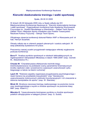 Międzynarodowa Konferencja Naukowa Kierunki doskonalenia treningu i walki sportowej Spała, 28-30 XI 2005 W dniach 28-30 listopada 2005 roku w Spale odbyła się XIV Międzynarodowa Konferencja Naukowa pt. “Kierunki doskonalenia treningu i walki sportowej”. Organizatorem konferencji była Akademia Wychowania Fizycznego im. Józefa Piłsudskiego w Warszawie – Zakład Teorii Sportu, Zakład Teorii i Metodyki Sportu Inwalidów oraz Polskie Towarzystwo Naukowe Kultury Fizycznej – Sekcja Teorii Sportu. Oficjalnego otwarcia konferencji dokonał Rektor AWF w Warszawie prof. dr hab. Henryk Sozański. Obrady odbyły się w czterech sesjach plenarnych i sześciu sekcjach. W sesji plakatowej wystawiono 63 prace. Pracownicy naszej uczelni przygotowali następujące referaty wygłoszone podczas konferencji: Bora P. “Analiza wyników sportowych w skokach lekkoatletycznych na Ogólnopolskich Olimpiadach Młodzieży w latach 1995-2005” (wsp. Ozimek M., Staszkiewicz R.). Chwała W. “Charakterystyka efektywności techniki biegu średniodystansowca na podstawie oceny parametrów kinematycznych środka ciężkości ciała i przestrzenno-czasowych uwarunkowań cyklu biegowego w teście na bieżni ruchomej”. Ljach W. “Wybrane aspekty organizacji przygotowania psychologicznego i nauki trenera (na przykładzie koszykówki)” oraz “Genetyczne uwarunkowania motorycznych zdolności koordynacyjnych i ich znaczenie w doborze kandydatów do sportu” (wsp. W. Starosta). Mirek W. Struktura rzeczowa treningu realizowanego na poziomie morza oraz średniogórskiego a wynik w chodzie sportowym na poziomie klasy MM” (wsp. Kisiel K.). Mleczko E. “Uwarunkowania treningowe wyników w chodzie sportowym polskich olimpijczyków w kategorii juniora” (wsp. G. Sudoł). Ozimek M. “Analiza wyników sportowych w rzutach lekkoatletycznych na Ogólnopolskich Olimpiadach Młodzieży w latach 1995-2005” (wsp. Bora P., Staszkiewicz R.). Rolski Z. “Obciążenia treningowe w rocznym cyklu treningowym i ich wpływ na zmiany parametrów biomechanicznych w stylu zmiennym u 12-13 letnich pływaków i pływaczek” (wsp. Lach K.). Staszkiewicz R. “Parametry kinematyczne opisujące chód sportowy najlepszych zawodników świata” (wsp. Ozimek M., Bora P., Chwała W.). Sterkowicz S. “Diagnoza sprawności motorycznej w judo w świetle rezultatów specyficznego testu SJFT” (wsp. Franchini E.). Obrady w sesji plenarnej prowadził prof. dr hab. W. Ljach, zaś obrady w sekcji A – prof. dr hab. Stanisław Sterkowicz. W sesji plakatowej zaprezentowano następujące prace: Chwała W. “Trójwymiarowa analiza wybranych elementów techniki Karate Kyokushinkai za pomocą systemu Vicon” (wsp. Sokołowski B.). Rolski Z. “Zróżnicowanie wskaźników koordynacyjno-taktycznych i krzywych mleczanowych pod wpływem treningu w górach pływaków i pływaczek stylu klasycznego” (wsp. Lach K.). Rukasz W. “Przyczyny skręceń stawu kolanowego u zawodników judo” (wsp. Sterkowicz S., Lech G.). Sterkowicz S. “Charakterystyka rywalizacji w kolejnych fazach Mistrzostw Świata w Judo – Osaka 2003” (wsp. Lech G., Rukasz W.). Sterkowicz-Przybycień K. “Wiek, rozwój fizyczny i wskaźniki budowy somatycznej zawodniczek gimnastyki (Ateny 2004). Sterkowicz-Przybycień K. “Motywy uprawiania aerobiku sportowego przez studentów i studentki wyższych uczelni” (wsp. Ambroży D.). Sudoł G. “Staż treningowy a poziom wyników sportowych i obciążeń treningowych chodziarza (wsp. Mleczko E.). Komisja w składzie: prof. zw. W. Starosta – przewodniczący, prof. A. Szczęsna-Kaczmarek, prof. T. Gabryś wyróżniła plakat autorstwa Z. Rolskiego i K. Lacha pt. “Zróżnicowanie wskaźników koordynacyjnotechnicznych i krzywych mleczanowych pod wpływem treningu w górach pływaków i pływaczek stylu klasycznego”. Sprawozdanie przygotowali: dr Wojciech Rukasz mgr Katarzyna Sterkowicz-Przybycień