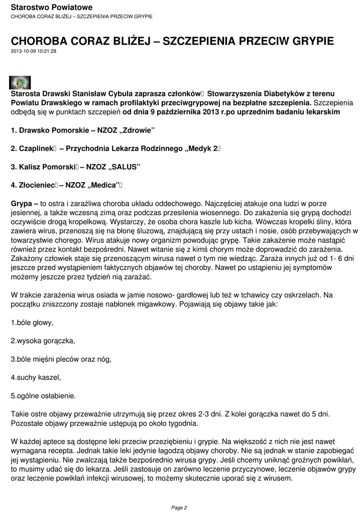 Starostwo Powiatowe CHOROBA CORAZ BLIŻEJ – SZCZEPIENIA PRZECIW GRYPIE CHOROBA CORAZ BLIŻEJ – SZCZEPIENIA PRZECIW GRYPIE 2013-10-09 10:21:28 Starosta Drawski Stanisław Cybula zaprasza członków Stowarzyszenia Diabetyków z terenu Powiatu Drawskiego w ramach profilaktyki przeciwgrypowej na bezpłatne szczepienia. Szczepienia odbędą się w punktach szczepień od dnia 9 października 2013 r.po uprzednim badaniu lekarskim 1. Drawsko Pomorskie – NZOZ „Zdrowie” 2. Czaplinek – Przychodnia Lekarza Rodzinnego „Medyk 2″ 3. Kalisz Pomorski – NZOZ „SALUS” 4. Złocieniec – NZOZ „Medica” Grypa – to ostra i zaraźliwa choroba układu oddechowego. Najczęściej atakuje ona ludzi w porze jesiennej, a także wczesną zimą oraz podczas przesilenia wiosennego. Do zakażenia się grypą dochodzi oczywiście drogą kropelkową. Wystarczy, że osoba chora kaszle lub kicha. Wówczas kropelki śliny, która zawiera wirus, przenoszą się na błonę śluzową, znajdującą się przy ustach i nosie, osób przebywających w towarzystwie chorego. Wirus atakuje nowy organizm powodując grypę. Takie zakażenie może nastąpić również przez kontakt bezpośredni. Nawet witanie się z kimś chorym może doprowadzić do zarażenia. Zakażony człowiek staje się przenoszącym wirusa nawet o tym nie wiedząc. Zaraża innych już od 1- 6 dni jeszcze przed wystąpieniem faktycznych objawów tej choroby. Nawet po ustąpieniu jej symptomów możemy jeszcze przez tydzień nią zarażać. W trakcie zarażenia wirus osiada w jamie nosowo- gardłowej lub też w tchawicy czy oskrzelach. Na początku zniszczony zostaje nabłonek migawkowy. Pojawiają się objawy takie jak: 1.bóle głowy, 2.wysoka gorączka, 3.bóle mięśni pleców oraz nóg, 4.suchy kaszel, 5.ogólne osłabienie. Takie ostre objawy przeważnie utrzymują się przez okres 2-3 dni. Z kolei gorączka nawet do 5 dni. Pozostałe objawy przeważnie ustępują po około tygodnia. W każdej aptece są dostępne leki przeciw przeziębieniu i grypie. Na większość z nich nie jest nawet wymagana recepta. Jednak takie leki jedynie łagodzą objawy choroby. Nie są jednak w stanie zapobiegać jej wystąpieniu. Nie zwalczają także bezpośrednio wirusa grypy. Jeśli chcemy uniknąć groźnych powikłań, to musimy udać się do lekarza. Jeśli zastosuje on zarówno leczenie przyczynowe, leczenie objawów grypy oraz leczenie powikłań infekcji wirusowej, to możemy skutecznie uporać się z wirusem. Page 2 Starostwo Powiatowe CHOROBA CORAZ BLIŻEJ – SZCZEPIENIA PRZECIW GRYPIE Osoby, które najczęściej zapadają na grypę to przede wszystkim osoby po 65 roku życia, a także dzieci i dorośli, którzy cierpią na przewlekłe choroby układu krążenia czy układu oddechowego. Grypa dotyka także osoby cierpiące na przewlekłe choroby nerek, przewlekłe choroby metaboliczne, chorych na immunosupresję, chorych z wirusem HIV czy z nowotworami. Bardzo często na grypę zapadają osoby z zaburzeniami odporności oraz chorujący na infekcje bakteryjne czy wirusowe. Zagrożeni nią są także nosiciele paciorkowców i gronkowców. Nieleczona grypa może prowadzić do powikłań. Należą do nich: zapalenia płuc i oskrzeli, zapalenie ucha, zatok, zespół wstrząsu toksycznego czy też powikłania o charakterze neurologicznym. Według raportów Światowej Organizacji Zdrowia w wyniku powikłań pogrypowych na świecie umiera od 250 tys. do 500 tys. osób rocznie. W Polsce wg różnych statystyk od 500 do 1000 osób. Cześć powikłań rozpoczyna się od razu po chorobie, inne ujawniają się dopiero po tygodniach, a nawet miesiącach. Grypie i jej ciężkim powikłaniom można zapobiegać poprzez wykonywanie szczepień profilaktycznych. Szczepienia są powszechnie uznaną, efektywną i tanią metodą profilaktyki i kontroli grypy. Potwierdzają to zarówno wyniki badań klinicznych, jak również powszechne rekomendacje szczepień WHO, Głównego Inspektora Sanitarnego, Krajowego Ośrodka ds. Grypy. Tylko wspólnymi siłami, dzięki konsekwencji i współpracy będziemy mogli konsekwentnie zmieniać oblicze profilaktyki grypy w Polsce oraz ograniczyć medyczne, społeczne i ekonomiczne skutki grypy. Page 2