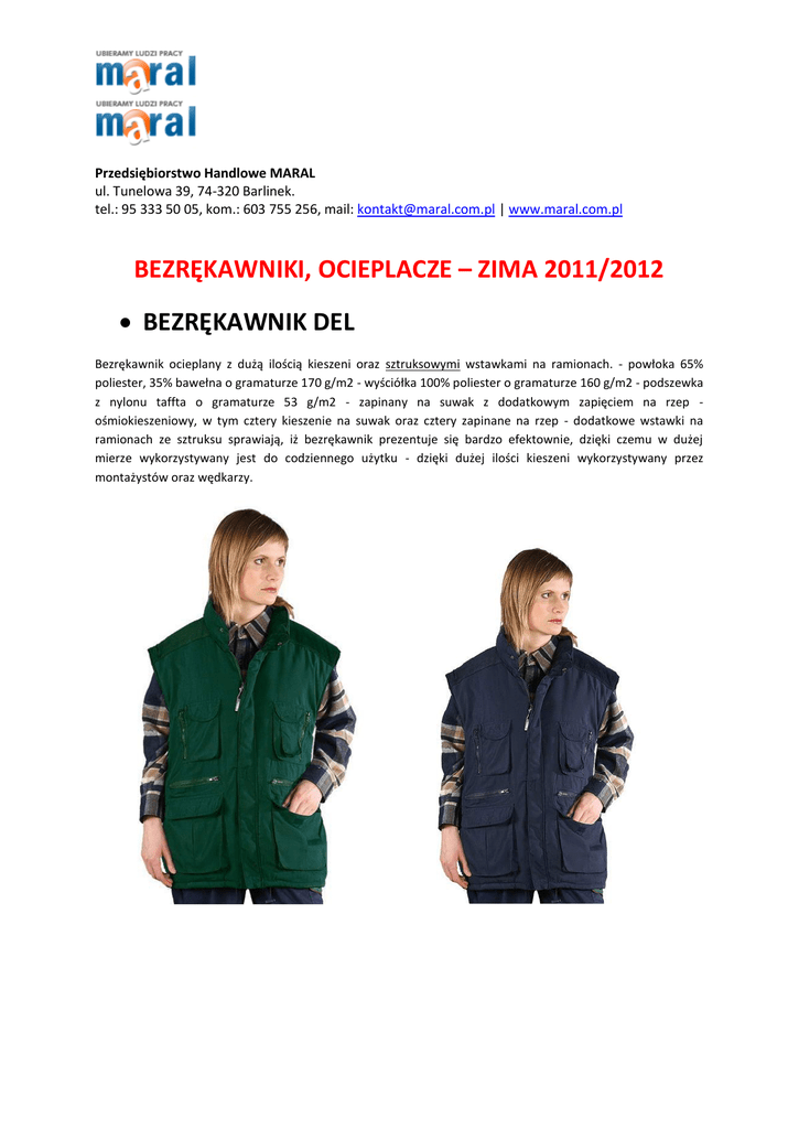 Przedsiębiorstwo Handlowe MARAL ul. Tunelowa 39, 74-320 Barlinek. tel.: 95 333 50 05, kom.: 603 755 256, mail: [email protected] | www.maral.com.pl BEZRĘKAWNIKI, OCIEPLACZE – ZIMA 2011/2012 BEZRĘKAWNIK DEL Bezrękawnik ocieplany z dużą ilością kieszeni oraz sztruksowymi wstawkami na ramionach. - powłoka 65% poliester, 35% bawełna o gramaturze 170 g/m2 - wyściółka 100% poliester o gramaturze 160 g/m2 - podszewka z nylonu taffta o gramaturze 53 g/m2 - zapinany na suwak z dodatkowym zapięciem na rzep ośmiokieszeniowy, w tym cztery kieszenie na suwak oraz cztery zapinane na rzep - dodatkowe wstawki na ramionach ze sztruksu sprawiają, iż bezrękawnik prezentuje się bardzo efektownie, dzięki czemu w dużej mierze wykorzystywany jest do codziennego użytku - dzięki dużej ilości kieszeni wykorzystywany przez montażystów oraz wędkarzy. BEZRĘKAWNIK FOK Bezrękawnik zapewniający ochronę przed chłodem, dzięki podwójnemu systemowi ocieplenia. - powłoka 100% poliester micro-moss - wyściółka 100% poliester o gramaturze 300 g/m2 - podszewka 100% polar o gramaturze 260 g/m2 - zapinany na suwak - po zewnętrznej stronie dwie kieszenie zapinane na suwak - dodatkowa kieszeo od wewnętrznej strony - pikowanie w poprzeczne pasy, zabezpieczające przed przesuwaniem się wyściółki specjalna ocieplina zapewnia miękkośd bezrękawnika i podnosi komfort użytkowania - od wewnątrz ocieplony polarem, dzięki czemu nie groźny jest żaden chłód. BEZRĘKAWNIK KOR Bezrękawnik ocieplany z dużą ilością kieszeni. - powłoka 65% poliester, 35% bawełna - wyściółka 100% poliester o gramaturze 200 g/m2 - podszewka 190T poliester taffta - zasuwany z dodatkowym zapięciem na napy przedłużany tył - po zewnętrznej stronie dwie kieszenie na telefon komórkowy, dwie na suwak oraz dwie na rzep - dodatkowa kieszeo po wewnętrznej stronie - w rękawach od wewnątrz specjalny materiał ze ściągaczem zabezpieczający przed dostawaniem się wiatru - duża ilośd kieszeni pomieści akcesoria wędkarzy, narzędzia montażysty, jak i przybory domowego majstra/. BEZRĘKAWNIK LEEBER HOLMANN – PELI Bezrękawnik ocieplany flanelą. - powłoka 65% poliester, 35% bawełna - wyściółka o gramaturze 220 g/m2 flanelowa podszewka 100% bawełny - zasuwany z dodatkowym zapięciem na napy - przedłużany tył wielokieszeniowy: po zewnętrznej stronie dwie kieszenie na telefon komórkowy, dwie na suwak, dwie na rzep oraz dwie boczne, dodatkowa kieszeo po wewnętrznej stronie - w rękawach od wewnątrz specjalny materiał ze ściągaczem zabezpieczający przed dostaniem się wiatru - duża ilośd kieszeni pomieści akcesoria wędkarzy, narzędzia montażysty, jak i przybory domowego majstra. BEZRĘKAWNIK NEWA Bezrękawnik ocieplany polarem. - powłoka 100% poliester typu pongee 190T o gramaturze 200 g/m2 podszewka 100% polar o gramaturze 260 g/m2 - zapinany na suwak - trzy zasuwane kieszenie po zewnętrznej stronie: dwie boczne i jedna na górze - od wewnątrz dwie zasuwane kieszenie - ściągany na dole gumką specyficzny sposób szycia umożliwia noszenie po obydwu stronach, zarówno z polarem na zewnątrz jak i wewnątrz. BEZRĘKAWNIK ORE Bezrękawnik ocieplany wykonany z tkaniny poliestrowej. - powłoka 100% poliester - wyściółka 100% poliester typu tafta 190T - podszewka 100% poliester o gramaturze 300 g/m2 - zapinany na suwak - pikowany w dużą kratę - dwie boczne kieszenie zapinane na suwak - doskonały dla kobiet, dzięki dopasowanemu fasonowi. BEZRĘKAWNIK BAR Bezrękawnik ocieplany pikowany. - powłoka 65% poliester, 35% bawełna - wyściółka 100% poliester o gramaturze 180 g/m2 - podszewka 190T poliester taffta - zapinany na suwak - pikowanie zabezpiecza przed przesuwaniem się ociepliny - po zewnętrznej stronie dwie kieszenie z dodatkową kieszenią na telefon komórkowy, po wewnętrznej stronie kieszeo na rzep - ściągacz na dole bezrękawnika. Bezrękawniki występują w rozmiarach: M, L, XL, XXL, XXXL, kolorach jak zaprezentowane na grafikach.
