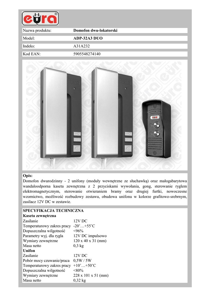 Nazwa produktu: Domofon dwu-lokatorski Model: ADP-32A3 DUO Indeks: A31A232 Kod EAN: 5905548274140 Opis: Domofon dwurodzinny - 2 unifony (moduły wewnętrzne ze słuchawką) oraz małogabarytowa wandaloodporna kaseta zewnętrzna z 2 przyciskami wywołania, gong, sterowanie ryglem elektromagnetycznym, sterowanie otwieraniem bramy oraz drugiej furtki, nowoczesne wzornictwo, możliwość rozbudowy zestawu, obudowa unifonu w kolorze grafitowo-srebrnym, zasilacz 12V DC w zestawie. SPECYFIKACJA TECHNICZNA Kaseta zewnętrzna Zasilanie 12V DC Temperaturowy zakres pracy -20’…+55’C Dopuszczalna wilgotność <96% Parametry wyj. dla rygla 12V DC impulsowo Wymiary zewnętrzne 120 x 40 x 31 (mm) Masa netto 0,3 kg Unifon Zasilanie 12V DC Pobór mocy czuwanie/praca 0,5W / 5W Temperaturowy zakres pracy +10’…+50’C Dopuszczalna wilgotność <80% Wymiary zewnętrzne 228 x 101 x 51 (mm) Masa netto 0,32 kg