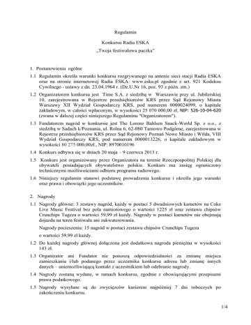 Regulamin Konkursu Radia ESKA „Twoja festiwalowa paczka” 1. Postanowienia ogólne 1.1 Regulamin określa warunki konkursu rozgrywanego na antenie sieci stacji Radia ESKA oraz na stronie internetowej Radia ESKA: www.eska.pl zgodnie z art. 921 Kodeksu Cywilnego - ustawy z dn. 23.04.1964 r. (Dz.U.Nr 16, poz. 93 z późn. zm.) 1.2 Organizatorem konkursu jest Time S.A. z siedzibą w Warszawie przy ul. Jubilerskiej 10, zarejestrowana w Rejestrze przedsiębiorców KRS przez Sąd Rejonowy Miasta Warszawy XII Wydział Gospodarczy KRS, pod numerem 0000024099, o kapitale zakładowym, w całości wpłaconym, w wysokości 25 070 000,00 zł, NIP: 526-10-04-620 (zwana w dalszej części niniejszego Regulaminu "Organizatorem"). 1.3 Fundatorem nagród w konkursie jest The Lorenz Bahlsen Snack-World Sp. z o.o., z siedzibą w Sadach k/Poznania, ul. Rolna 6, 62-080 Tarnowo Podgórne, zarejestrowana w Rejestrze przedsiębiorców KRS przez Sąd Rejonowy Poznań Nowe Miasto i Wilda, VIII Wydział Gospodarczy KRS, pod numerem 0000013226, o kapitale zakładowym w wysokości 80 275 000,00zł., NIP: 8970010196 1.4 Konkurs odbywa się w dniach 20 maja – 9 czerwca 2013 r. 1.5 Konkurs jest organizowany przez Organizatora na terenie Rzeczpospolitej Polskiej dla obywateli posiadających obywatelstwo polskie. Konkurs ma zasięg ograniczony technicznymi możliwościami odbioru programu radiowego. 1.6 Niniejszy regulamin stanowi podstawę prowadzenia konkursu i określa jego warunki oraz prawa i obowiązki jego uczestników. 2. Nagrody 1.1 Nagrody główne: 3 zestawy nagród, każdy w postaci 5 dwudniowych karnetów na Coke Live Music Festival bez pola namiotowego o wartości 1225 zł oraz zestawu chipsów Crunchips Tugeza o wartości 59,99 zł każdy. Nagrody w postaci karnetów nie obejmują dojazdu na teren festiwalu ani zakwaterowania. Nagrody pocieszenia: 15 nagród w postaci zestawu chipsów Crunchips Tugeza o wartości 59,99 zł każdy. 1.2 Do każdej nagrody głównej dołączona jest dodatkowa nagroda pieniężna w wysokości 143 zł. 1.3 Organizator ani Fundator nie ponoszą odpowiedzialności za zmianę miejsca zamieszkania i/lub podanego przez uczestnika konkursu adresu lub zmianę innych danych – uniemożliwiającą kontakt z uczestnikiem lub odebranie nagrody. 1.4 Nagrody zostaną wydane, w ramach konkursu, zgodnie z obowiązującymi przepisami prawa podatkowego. 1.5 Nagrody wysyłane są do zwycięzców kurierem najpóźniej 7 dni roboczych po zakończeniu konkursu. 1/4 1.6 Słuchacze, którzy nie odbiorą nagród do 28 czerwca 2013 roku tracą prawo do tych nagród i ich odbioru. 1.7 Odpowiedzialność z tytułu rękojmi za wady nagród rzeczowych spoczywa na sprzedawcy lub podmiocie, który udostępnił Organizatorowi nagrody, lub innym podmiocie przez niego wskazanym, a odpowiedzialność z tytułu gwarancji na podmiocie wskazanym w treści gwarancji (gwarant). Zdobywca nagrody będzie dochodził zaspokojenia roszczeń z powyższych tytułów bezpośrednio od sprzedawcy nagród (lub od podmiotu wskazanego przez Organizatora) i od gwaranta. 3 Zasady konkursu 3.1 W konkursie mogą brać udział osoby zarejestrowane w klubie Radia ESKA, które w dniu zgłoszenia mają ukończone 13 lat. 3.2 Konkurs trwa od 20 maja do 9 czerwca 2013 r. 3.3 Słuchacze zgłaszają się do konkursu poprzez wypełnienie formularza na stronie konkursowej pod adresem www.eska.pl/impreska, zawierającego pytanie otwarte „Dlaczego chcesz przeżyć z Twoją paczką muzyczną Tugezę na Coke Live Music Festival?” 3.4 Konkurs podzielony jest na trzy rundy: I runda 20 – 26 maja 2013 r. II runda 27 maja – 2 czerwca 2013 r. III runda 3 – 9 czerwca 2013 r. 3.5 W każdej rundzie odbywa się 6 wejść konkursowych. Każde z wejść zorganizowane jest codziennie z wyjątkiem soboty, między 20:00 a 24:00. 3.6 Laureatem nagrody głównej zostaje uczestnik, który zwycięży w wejściu konkursowym ostatniego dnia rundy. 3.7 Laureatem nagrody pocieszenia zostaje uczestnik, który przegra walkę w każdym z wejść konkursowych. 3.8 W czasie wejścia konkursowego DJ prezentuje uczestnikom konkursu fragment hitu, stworzonego przez dwóch wykonawców. Zadaniem uczestników jest prawidłowe odgadnięcie obu wykonawców. 3.9 Uczestnik zgłasza się do odpowiedzi przez wciśnięcie dowolnego klawisza w swoim telefonie komórkowym lub krzyknięcie swojego imienia. 3.10 Zwycięzcą wejścia konkursowego jest uczestnik, który jako pierwszy w ciągu 15 sekund od zgłoszenia prawidłowo odgadnie obu wykonawców prezentowanego hitu. 3.11 Jeśli uczestnik odpowie błędnie lub nie udzieli odpowiedzi, zwycięzcą tego wejścia automatycznie zostaje drugi uczestnik. 3.12 W przypadku, gdy żaden z uczestników nie zgłosi się do odpowiedzi DJ wywołuje do odpowiedzi osobę, która jako pierwsza wysłała swoje zgłoszenie do konkursu. 3.13 Do pierwszego wejścia konkursowego każdej rundy komisja konkursowa wybiera dwóch autorów najciekawszych zgłoszeń. 2/4 3.14 W każdym kolejnym wejściu konkursowym danej rundy bierze udział zwycięzca wejścia konkursowego, które odbyło się poprzedniego dnia oraz nowy uczestnik, który najciekawiej odpowiedział na pytanie zgłoszeniowe. 3.15 Jeżeli prowadzącemu nie uda się po 3 krotnej próbie skontaktować z którymkolwiek uczestnikiem, to podejmuje on próbę wywołania do odpowiedzi kolejnej osoby, która najciekawiej odpowiedziała na pytanie zgłoszeniowe. Ta procedura jest powtarzana aż do momentu skontaktowania się z uczestnikiem. 3.16 Uczestnicy do wszystkich wejść konkursowych w każdej z rund wyłaniani są spośród zgłoszeń, nadesłanych od początku trwania konkursu. 3.17 Wyborem autorów najciekawszych zgłoszeń zajmuje się komisja konkursowa w składzie: Krzysztof Jankowski, Grzegorz Wilk i Agata Walęcka: 3.17 Werdykt komisji konkursowej jest werdyktem ostatecznym w zakresie wyników konkursu. 3.18Nad prawidłowością przebiegu akcji i pracy komisji konkursowej czuwaj