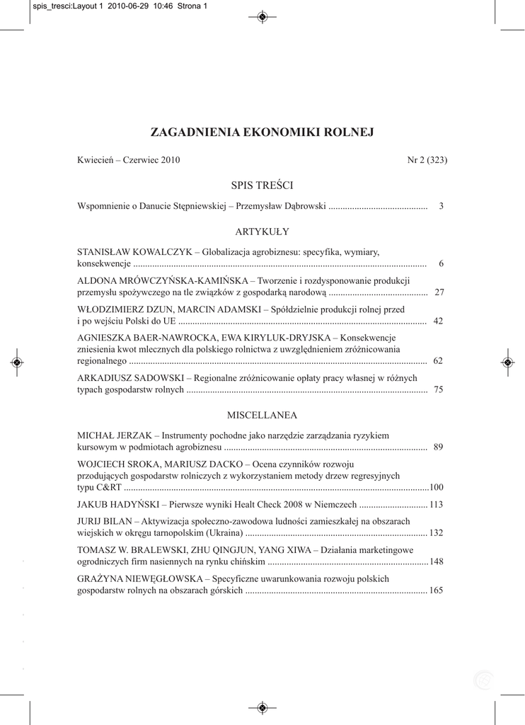 spis_tresci:Layout 1 2010-06-29 10:46 Strona 1 ZAGADNIENIA EKONOMIKI ROLNEJ Kwiecień – Czerwiec 2010 Nr 2 (323) SPIS TREŚCI Wspomnienie o Danucie Stępniewskiej – Przemysław Dąbrowski .......................................... 3 ARTYKUŁY STANISŁAW KOWALCZYK – Globalizacja agrobiznesu: specyfika, wymiary, konsekwencje ............................................................................................................................ 6 ALDONA MRÓWCZYŃSKA-KAMIŃSKA – Tworzenie i rozdysponowanie produkcji przemysłu spożywczego na tle związków z gospodarką narodową .......................................... 27 WŁODZIMIERZ DZUN, MARCIN ADAMSKI – Spółdzielnie produkcji rolnej przed i po wejściu Polski do UE ......................................................................................................... 42 AGNIESZKA BAER-NAWROCKA, EWA KIRYLUK-DRYJSKA – Konsekwencje zniesienia kwot mlecznych dla polskiego rolnictwa z uwzględnieniem zróżnicowania regionalnego .............................................................................................................................. 62 ARKADIUSZ SADOWSKI – Regionalne zróżnicowanie opłaty pracy własnej w różnych typach gospodarstw rolnych ...................................................................................................... 75 MISCELLANEA MICHAŁ JERZAK – Instrumenty pochodne jako narzędzie zarządzania ryzykiem kursowym w podmiotach agrobiznesu ...................................................................................... 89 WOJCIECH SROKA, MARIUSZ DACKO – Ocena czynników rozwoju przodujących gospodarstw rolniczych z wykorzystaniem metody drzew regresyjnych typu C&RT .................................................................................................................................100 JAKUB HADYŃSKI – Pierwsze wyniki Healt Check 2008 w Niemczech ............................. 113 - - - - - JURIJ BILAN – Aktywizacja społeczno-zawodowa ludności zamieszkałej na obszarach wiejskich w okręgu tarnopolskim (Ukraina) ............................................................................. 132 TOMASZ W. BRALEWSKI, ZHU QINGJUN, YANG XIWA – Działania marketingowe ogrodniczych firm nasiennych na rynku chińskim ....................................................................148 GRAŻYNA NIEWĘGŁOWSKA – Specyficzne uwarunkowania rozwoju polskich gospodarstw rolnych na obszarach górskich ............................................................................. 165 spis_tresci:Layout 1 2010-06-29 10:46 Strona 2 KOSZTY I DOCHODOWOŚĆ ALDONA SKARŻYŃSKA, IRENA AUGUSTYŃSKA-GRZYMEK, MARCIN CHOLEWA, MARIUSZ DZIWULSKI, KRZYSZTOF ZMARZŁOWSKI, ARKADIUSZ ORŁOWSKI – Koszty jednostkowe i dochody wybranych produktów w 2008 roku – wyniki badań w systemie AGROKOSZTY .....................................................................................................180 STRESZCZENIA ROZPRAW DOKTORSKICH ANNA FABISIAK – Adaptacja sektora rolnego krajów Europy Środkowej i Wschodniej w procesie integracji z Unią Europejską ....................................................................................207 ANNA MURAWSKA – Rozwój społeczno-ekonomiczny a poziom życia w gospodarstwach domowych w Polsce ....................................................................................213 RECENZJE – POLEMIKI ANDRZEJ CZYŻEWSKI – Adam Czudec: Ekonomiczne uwarunkowania rozwoju wielofunkcyjnego rolnictwa .......................................................................................................220 BIBLIOGRAFIA Książki ekonomiczno-rolnicze – oprac. M.M. ........................................................................... 224 - - - - - Artykuły ekonomiczno-rolnicze – oprac. Zespół ....................................................................... 227 spis_tresci:Layout 1 2010-06-29 10:46 Strona 3 PROBLEMS OF AGRICULTURAL ECONOMICS April – June 2010 No 2 (323) CONTENTS In memory of Danuta Stepniewska – Przemysław Dąbrowski ................................................. 3 ARTICLES STANISŁAW KOWALCZYK – Globalisation of agribusiness – characteristics, dimensions, consequences.............................................................................................................................. 6 ALDONA MRÓWCZYŃSKA-KAMIŃSKA – Food industry output and its allocation in the context of the links with the national economy .............................................................. 27 WŁODZIMIERZ DZUN, MARCIN ADAMSKI – Agricultural cooperatives before and after Poland’s accession to the EU ..................................................................................... 42 AGNIESZKA BAER-NAWROCKA, EWA KIRYLUK-DRYJSKA – Consequences of milk quota abolition for the Polish agriculture with focus on the regional differentiation .. 62 ARKADIUSZ SADOWSKI – Regional differentiation in own labour costs in various types of agricultural holdings ............................................................................................................. 75 MISCELLANEA MICHAŁ JERZAK – Derivatives as foreign exchange risk management tools in the agribusiness ..................................................................................................................... 89 WOJCIECH SROKA, MARIUSZ DACKO – Evaluation of development factors in the leading agricultural holdings using the method of regression trees (C&RT) ................. 100 JAKUB HADYŃSKI – First results of the Health Check 2008 in Germany ........................... 113 JURIJ BILAN – Social and professional activity of the rural areas population in Tarnopol District (Ukraine) ..................................................................................................................... 132 - - - - - TOMASZ W. BRALEWSKI, ZHU QINGJUN, YANG XIWA – Marketing actions of the gardening seed companie