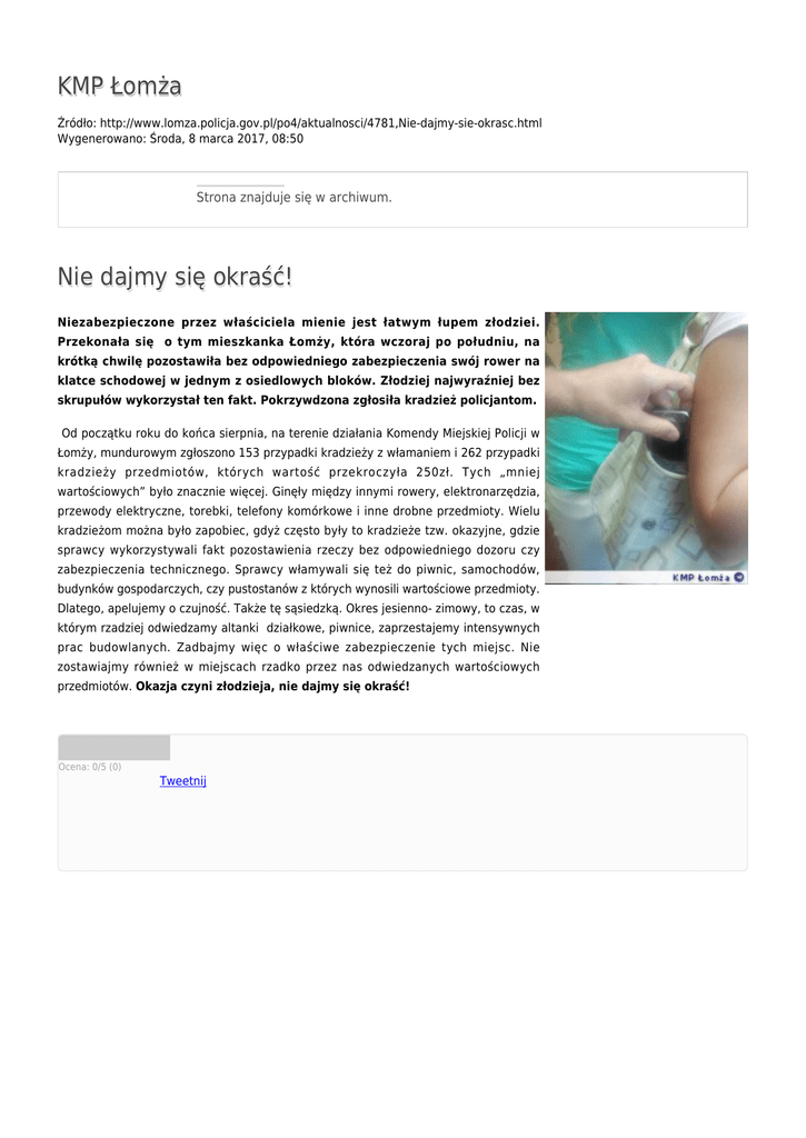 KMP Łomża Źródło: http://www.lomza.policja.gov.pl/po4/aktualnosci/4781,Nie-dajmy-sie-okrasc.html Wygenerowano: Środa, 8 marca 2017, 08:50 Strona znajduje się w archiwum. Nie dajmy się okraść! Niezabezpieczone przez właściciela mienie jest łatwym łupem złodziei. Przekonała się o tym mieszkanka Łomży, która wczoraj po południu, na krótką chwilę pozostawiła bez odpowiedniego zabezpieczenia swój rower na klatce schodowej w jednym z osiedlowych bloków. Złodziej najwyraźniej bez skrupułów wykorzystał ten fakt. Pokrzywdzona zgłosiła kradzież policjantom. Od początku roku do końca sierpnia, na terenie działania Komendy Miejskiej Policji w Łomży, mundurowym zgłoszono 153 przypadki kradzieży z włamaniem i 262 przypadki kradzieży przedmiotów, których wartość przekroczyła 250zł. Tych „mniej wartościowych” było znacznie więcej. Ginęły między innymi rowery, elektronarzędzia, przewody elektryczne, torebki, telefony komórkowe i inne drobne przedmioty. Wielu kradzieżom można było zapobiec, gdyż często były to kradzieże tzw. okazyjne, gdzie sprawcy wykorzystywali fakt pozostawienia rzeczy bez odpowiedniego dozoru czy zabezpieczenia technicznego. Sprawcy włamywali się też do piwnic, samochodów, budynków gospodarczych, czy pustostanów z których wynosili wartościowe przedmioty. Dlatego, apelujemy o czujność. Także tę sąsiedzką. Okres jesienno- zimowy, to czas, w którym rzadziej odwiedzamy altanki działkowe, piwnice, zaprzestajemy intensywnych prac budowlanych. Zadbajmy więc o właściwe zabezpieczenie tych miejsc. Nie zostawiajmy również w miejscach rzadko przez nas odwiedzanych wartościowych przedmiotów. Okazja czyni złodzieja, nie dajmy się okraść! Ocena: 0/5 (0) Tweetnij