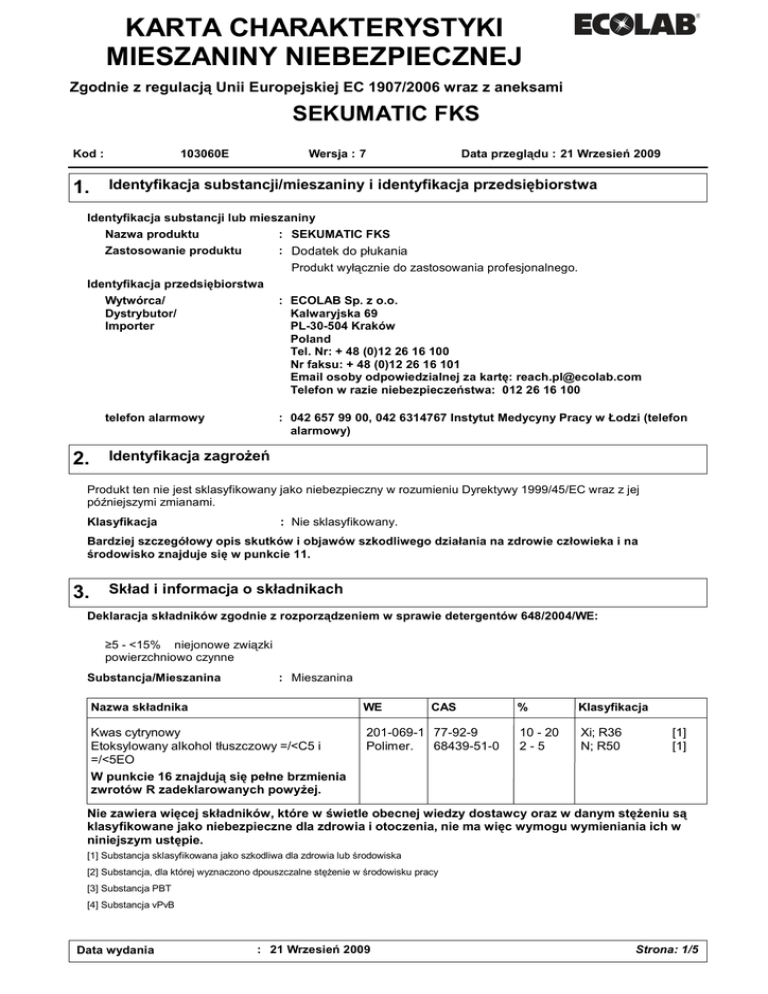 KARTA CHARAKTERYSTYKI MIESZANINY NIEBEZPIECZNEJ Zgodnie z regulacją Unii Europejskiej EC 1907/2006 wraz z aneksami SEKUMATIC FKS Kod : 1. 103060E Wersja : 7 Data przeglądu : 21 Wrzesień 2009 Identyfikacja substancji/mieszaniny i identyfikacja przedsiębiorstwa Identyfikacja substancji lub mieszaniny Nazwa produktu : SEKUMATIC FKS Zastosowanie produktu : Dodatek do płukania Produkt wyłącznie do zastosowania profesjonalnego. Identyfikacja przedsiębiorstwa Wytwórca/ Dystrybutor/ Importer telefon alarmowy 2. : ECOLAB Sp. z o.o. Kalwaryjska 69 PL-30-504 Kraków Poland Tel. Nr: + 48 (0)12 26 16 100 Nr faksu: + 48 (0)12 26 16 101 Email osoby odpowiedzialnej za kartę: [email protected] Telefon w razie niebezpieczeństwa: 012 26 16 100 : 042 657 99 00, 042 6314767 Instytut Medycyny Pracy w Łodzi (telefon alarmowy) Identyfikacja zagrożeń Produkt ten nie jest sklasyfikowany jako niebezpieczny w rozumieniu Dyrektywy 1999/45/EC wraz z jej późniejszymi zmianami. Klasyfikacja : Nie sklasyfikowany. Bardziej szczegółowy opis skutków i objawów szkodliwego działania na zdrowie człowieka i na środowisko znajduje się w punkcie 11. 3. Skład i informacja o składnikach Deklaracja składników zgodnie z rozporządzeniem w sprawie detergentów 648/2004/WE: ≥5 - <15% niejonowe związki powierzchniowo czynne Substancja/Mieszanina : Mieszanina Nazwa składnika WE CAS Kwas cytrynowy Etoksylowany alkohol tłuszczowy =/<C5 i =/<5EO W punkcie 16 znajdują się pełne brzmienia zwrotów R zadeklarowanych powyżej. 201-069-1 77-92-9 Polimer. 68439-51-0 % Klasyfikacja 10 - 20 2-5 Xi; R36 N; R50 [1] [1] Nie zawiera więcej składników, które w świetle obecnej wiedzy dostawcy oraz w danym stężeniu są klasyfikowane jako niebezpieczne dla zdrowia i otoczenia, nie ma więc wymogu wymieniania ich w niniejszym ustępie. [1] Substancja sklasyfikowana jako szkodliwa dla zdrowia lub środowiska [2] Substancja, dla której wyznaczono dpouszczalne stężenie w środowisku pracy [3] Substancja PBT [4] Substancja vPvB Data wydania : 21 Wrzesień 2009 Strona: 1/5 SEKUMATIC FKS Najwyższe dopuszczalne stężenia i natężenia czynników szkodliwych dla zdrowia w środowisku pracy, jeśli są dostępne, są wymienione w punkcie 8. 4. Pierwsza pomoc Pierwsza pomoc Droga oddechowa : Wynieść narażoną osobę na świeże powietrze. Może być niebezpiecznym dla osoby udzielającej sztucznego oddychania usta usta. Bezzwłocznie zasięgnąć porady medycznej. Droga pokarmowa : Przemyć usta wodą. Wynieść narażoną osobę na świeże powietrze. Nie wywoływać wymiotów, jeśli nie jest to zalecane przez personel medyczny. Bezzwłocznie zasięgnąć porady medycznej. Kontakt ze skórą : Skażoną skórę umyć mydłem i wodą. Zdjąć skażoną odzież i buty. Należy dokładnie zmyć zanieczyszczone ubranie wodą przed jego zdjęciem lub założyć rękawice. Należy kontynuować płukanie przez co najmniej 10 minut. Bezzwłocznie zasięgnąć porady medycznej. Kontakt z oczami. : Bezzwłocznie zasięgnąć porady medycznej. Natychmiast przepłukać oczy dużą ilością wody, od czasu do czasu podnosząc górna i dolna powiekę. Szczególne sposoby leczenia : Brak. Bardziej szczegółowy opis skutków i objawów szkodliwego działania na zdrowie człowieka i na środowisko znajduje się w punkcie 11. 5. Postępowanie w przypadku pożaru Środki gaśnicze - Odpowiednie : W przypadku pożaru zastosować zraszania wodą (mgłą), użyć piany oraz suchych środków chemicznych lub CO2. Środki gaśnicze : Nie znane. Nieodpowiednie Środki ochrony indywidualnej dla strażaków 6. : Strażacy powinni nosić odpowiednie urządzenia ochronne oraz indywidualne aparaty oddechowe (SCBA) z maska zakrywającą całą twarz działająca w obszarze podwyższonego ciśnienia. Postępowanie w przypadku niezamierzonego uwolnienia do środowiska Indywidualne środki ostrożności : Nie udzielać zezwolenia na wejście - niepotrzebnemu i nie zabezpieczonemu personelowi. Nie dotykać, ani nie przechodzić, po rozlanym materiale. Unikać wdychania par lub mgły. Zapewnić właściwą wentylację. Zabezpieczenia środowiskowe : Należy unikać uwolnienia rozlanego/rozsypanego materiału, jego spływania/rozprzestrzeniania do gleby lub kontaktu z glebą, wodami powierzchniowymi i gruntowymi, drenami i kanalizacją. Małe rozlanie/rozproszenie : Rozcieńczyć wodą i zebrać ścierką jeżeli rozpuszcza się w wodzie lub zaadsorbować obojętnym suchym materiałem i umieścić we właściwym pojemniku na odpady. Duże rozlanie : Zabezpieczyć ujścia kanalizacji, instalacji wodnych oraz wejścia do piwnic i obszarów zamkniętych. Rozlane lub rozsypane substancje, należy zebrać za pomocą niepalnych substancji, takich jak: piasek, ziemia, wermikulit, ziemia okrzemkowa. Następnie umieścić w pojemnikach i utylizować zgodnie z miejscowymi przepisami (patrz punkt 13). Uwolniony materiał może zostać zneutralizowany węglanem sodu, wodorowęglanem sodu lub wodorotlenkiem sodowym. Patrz także: punkt 8. zawiera informacje nt środków ochrony indywidualnej, a punkt 13. sposób postępowania z odpadami. 7. Postępowanie z substancją/mieszaniną i jej/jego magazynowanie Postępowanie z substancją lub : Nie dopuścić, do przedostania się do oczu, na skórę lub ubranie. Nie spożywać. Jeśli w normalnych warunkach użytkowania materiał stanowi preparatem zagrożenie dla dróg oddechowych, należy stosować odpowiednią wentylację lub nosić aparat oddechowy. Trzymać z daleka od zasad. Po pracy należy dokładnie umyć ręce mydłem i wodą. Data wydania : 21 Wrzesień 2009 Strona: 2/5 SEKUMATIC FKS Magazynowanie : Należy przechowywać zgodnie z miejscowymi przepisami. Przechowywać w oryginalnym opakowaniu, zdala od promieni słonecznych; w suchym, chłodnym i dobrze wentylowanym pomieszczeniu; zdala od niezgodnych materiałów (patrz punkt 10), napojów i jedzenia. Trzymać oddzielnie od zasad. Pojemnik powinien pozosta