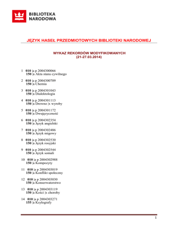 JĘZYK HASEŁ PRZEDMIOTOWYCH BIBLIOTEKI NARODOWEJ WYKAZ REKORDÓW MODYFIKOWANYCH (21-27.03.2014) 1 010 |a p 2004300066 150 |a Akta stanu cywilnego 2 010 |a p 2004300709 150 |a Chemia 3 010 |a p 2004301043 150 |a Dialektologia 4 010 |a p 2004301113 150 |a Drewno |x wyroby 5 010 |a p 2004301172 150 |a Dwujęzyczność 6 010 |a p 2004302354 150 |a Język angielski 7 010 |a p 2004302486 150 |a Język migowy 8 010 |a p 2004302530 150 |a Język rosyjski 9 010 |a p 2004302544 150 |a Język somali 10 010 |a p 2004302988 150 |a Kompozyty 11 010 |a p 2004303019 150 |a Konflikt społeczny 12 010 |a p 2004303030 150 |a Konserwatorstwo 13 010 |a p 2004303119 150 |a Kości |x choroby 14 010 |a p 2004303271 155 |a Ksylografy 1 15 010 |a p 2004303370 150 |a Kwasy organiczne 16 010 |a p 2004303746 155 |a Literatura żydowska 17 010 |a p 2004303955 150 |a Marketing 18 010 |a p 2004304014 150 |a Matematyka 19 010 |a p 2004304072 150 |a Zawody medyczne 20 010 |a p 2004304248 150 |a Mitologia grecka 21 010 |a p 2004305113 150 |a Środki masowego przekazu 22 010 |a p 2004305581 150 |a Układ nerwowy |x choroby 23 010 |a p 2004305661 150 |a Wady rozwojowe 24 010 |a p 2004305698 150 |a Postać biblijna 25 010 |a p 2004305734 150 |a Weterynaria 26 010 |a p 2004305736 150 |a Weterynarze 27 010 |a p 2004306004 150 |a Wojsko 28 010 |a p 2004306078 150 |a Wychowanie |x metody 29 010 |a p 2004306248 150 |a Zawód 30 010 |a p 2004306303 150 |a Zielenice 31 010 |a p 2004306347 150 |a Zniewaga 32 010 |a p 2004306516 155 |a Muzyka elektroniczna 33 010 |a p 2004306521 155 |a Muzyka komputerowa 34 010 |a p 2004306636 150 |a Nauczyciele 2 35 010 |a p 2004307108 150 |a Palmy 36 010 |a p 2004307270 155 |a Pieśń (muz.) 37 010 |a p 2004308123 150 |a Rekiny 38 010 |a p 2004308389 150 |a Ryby morskie 39 010 |a p 2004308390 150 |a Ryby słodkowodne 40 010 |a p 2004308530 150 |a Seksuologia 41 010 |a p 2004308666 150 |a Restytucja (prawo) 42 010 |a p 2004308767 150 |a Internet 43 010 |a p 2004309631 150 |a Wojsko |z Polska |y 19 w. 44 010 |a p 2004309647 155 |a Mszały 45 010 |a p 2004309941 151 |a Krakowsko-Częstochowska, Wyżyna 46 010 |a p 2004310221 150 |a Orzeczenie sądowe 47 010 |a p 2004311483 150 |a Duszpasterstwo nadzwyczajne 48 010 |a p 2004312250 150 |a Kurierzy 49 010 |a p 2004312488 155 |a Muzyka wiolonczelowa 50 010 |a p 2004312826 151 |a Będkowska, Dolina 51 010 |a p 2004313307 155 |a Anegdoty węgierskie 52 010 |a p 2004314441 150 |a Nauczanie |x metody 53 010 |a p 2004315068 110 2. |a Lietuvos demokratu partija 3 54 010 |a p 2004315071 150 |a Partie polityczne |z Litwa |y 1901-1918 r. 55 010 |a p 2004315525 150 |a Teatr amerykański 56 010 |a p 2004315920 155 |a Literatura młodzieżowa hebrajska 57 010 |a p 2004316641 155 |a Opowiadanie hebrajskie 58 010 |a p 2004319126 151 |a Bułgaria |x kultura 59 010 |a p 2004320191 110 2. |a Zjednoczenie Polskie Rzymsko-Katolickie w Ameryce 60 010 |a p 2004320303 150 |a Jaskinie |z Polska 61 010 |a p 2004320433 150 |a Mięśnie |x choroby 62 010 |a p 2004324391 110 2. |a Duchacy 63 010 |a p 2004327003 150 |a Trzonkooczne 64 010 |a p 2004400292 151 |a Athos (Grecja) 65 010 |a p 2004400695 151 |a Łańcut (woj. podkarpackie ; okręg) 66 010 |a p 2004409267 100 1. |a Jokiel, Jan |d (1906-1996) 67 010 |a p 2004415788 100 1. |a Marchwicki, Zdzisław |d (1927-1974) 68 010 |a p 2004416580 100 1. |a Pękalski, Leszek Jacek |d (1966- ) 69 010 |a p 2004417790 100 1. |a Kolessa, Fìlaret Mihajlovič |d (1871-1947) 70 010 |a p 2004421262 110 2. |a Gosudarstvennaâ publičnaâ istoričeskaâ biblioteka Rossii 71 010 |a p 2004422434 110 2. |a Uniwersytet Opolski 72 010 |a p 2004422939 151 |a Jesionik (Czechy ; okręg) 73 010 |a p 2004425927 100 0. |a Rab-gsal-zla-ba, Dis-mgo Mkhyen-brtse |d (1910-1991) 4 74 010 |a p 2004434503 100 1. |a Leuderode, Johannes |d (1592-1665) 75 010 |a p 2004437321 110 2. |a Wojskowa Składnica Tranzytowa (Wolne Miasto Gdańsk) 76 010 |a p 2004439939 151 |a Jednorożec (woj. mazowieckie ; okręg) 77 010 |a p 2004444149 151 |a Jesionik (Czechy) 78 010 |a p 2004444179 100 1. |a Dłużniewski, Henek 79 010 |a p 2004444201 100 0. |a Atanazy Brzeski |c (św. ; |d ca 1597-1648) 80 010 |a p 2004502544 150 |a Aminy |x fizyka |x badanie 81 010 |a p 2004513700 150 |a Budownictwo |z Belgia |y od 1945 r. 82 010 |a p 2004518999 151 |a Skierniewice (woj. łódzkie ; okręg) |x miejsca pamięci 83 010 |a p 2004519807 150 |a Czas pracy |x przemysł |x badanie 84 010 |a p 2004521509 150 |a Dach |x materiały 85 010 |a p 2004539013 150 |a Genom |x botanika |x doświadczalnictwo 86 010 |a p 2004547756 150 |a Hutnictwo |x energochłonność |x badanie 87 010 |a p 2004550348 150 |a Instalacje |x obsługa i eksploatacja 88 010 |a p 2004551957 150 |a Jabłoń |x uprawa |x metody |x doświadczalnictwo |z Polska 89 010 |a p 2004553128 150 |a Język arabski |x dialekty i regionalizmy |z Egipt 90 010 |a p 2004553129 150 |a Język arabski |x dialekty i regionalizmy |z Irak 91 010 |a p 2004558386 150 |a Katecheza |y 1-4 w. 92 010 |a p 2004558387 150 |a Katecheza |y 1-2 w. 5 93 010 |a p 2004558388 150 |a Katecheza |z Polska |y 1944-1989 r. 94 010 |a p 2004558390 150 |a Katecheza |x katolicyzm |y 20 w. 95 010 |a p 2004558404 150 |a Katecheza |x katolicyzm |z Polska |y 16-17 w. 96 010 |a p 2004558405 150 |a Katecheza |x katolicyzm |z Polska |y 18 w. 97 010 |a p 2004558406 150 |a Katecheza |x katolicyzm |z Hiszpania |y 19 w. 98 010 |a p 2004558408 150 |a Katecheza |x katolicyzm |z Polska |y 1944-1989 r. 99 010 |a p 2004558411 150 |a Katecheza |x katolicyzm |z Stany Zjednoczone |y 20 w. 100 010 |a p 2004562022 150 |a Komunikacja miejska |x wyposażenie |x bezpieczeństwo 101 010 |a p 2004566031 150 |a Kościół katolicki |x socjologia |z Czechosłowacja |y 1945-1992 r. 102 010 |a p 2004567794 150 |a Kryształy |x badanie |x automatyzacja 103 010 |a p 2004585015 150 |a Metale |x stosowanie |x drukarstwo i edytorstwo 104 010 |a p 2004586612 150 |a Mieszkania |x higiena |x badanie 105 010 |a