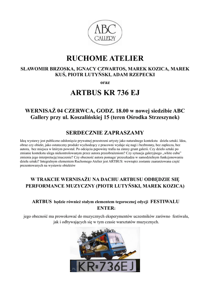 RUCHOME ATELIER SŁAWOMIR BRZOSKA, IGNACY CZWARTOS, MAREK KOZICA, MAREK KUŚ, PIOTR LUTYŃSKI, ADAM RZEPECKI oraz ARTBUS KR 736 EJ WERNISAŻ 04 CZERWCA, GODZ. 18.00 w nowej siedzibie ABC Gallery przy ul. Koszalińskiej 15 (teren Ośrodka Strzeszynek) SERDECZNIE ZAPRASZAMY Ideą wystawy jest publiczne odsłonięcie prywatnej przestrzeni artysty jako naturalnego kontekstu dzieła sztuki. Idea, obraz czy obiekt, jako ostateczny produkt wychodzący z pracowni wydaje się nagi i bezbronny, bez zaplecza, bez autora, bez miejsca w którym powstał. Po odcięciu pępowiny trafia na zimny grunt galerii. Czy dzieło sztuki po zmianie kontekstu ulega niekontrolowanym przez autora przeobrażeniom? Czy sytuacja galeryjnego „white cubu” zmienia jego interpretację/znaczenie? Czy obecność autora pomaga/ przeszkadza w samodzielnym funkcjonowaniu dzieła sztuki? Integralnym elementem Ruchomego Atelier jest ARTBUS: wewnątrz zostanie zaaranżowana część prezentowanych na wystawie obiektów W TRAKCIE WERNISAŻU NA DACHU ARTBUSU ODBĘDZIE SIĘ PERFORMANCE MUZYCZNY (PIOTR LUTYŃSKI, MAREK KOZICA) ARTBUS będzie również stałym elementem tegorocznej edycji FESTIWALU ENTER: jego obecność ma prowokować do muzycznych eksperymentów uczestników zarówno festiwalu, jak i odbywających się w tym czasie warsztatów muzycznych.