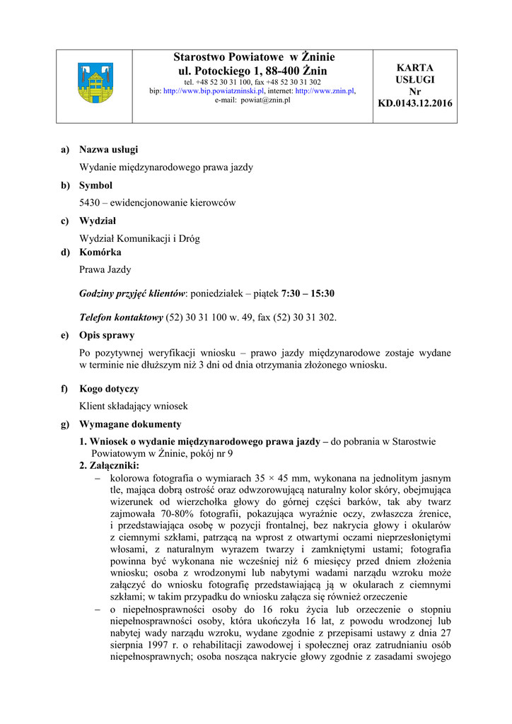 Starostwo Powiatowe w Żninie ul. Potockiego 1, 88-400 Żnin tel. +48 52 30 31 100, fax +48 52 30 31 302 bip: http://www.bip.powiatzninski.pl, internet: http://www.znin.pl, e-mail: [email protected] KARTA USŁUGI Nr KD.0143.12.2016 a) Nazwa usługi Wydanie międzynarodowego prawa jazdy b) Symbol 5430 – ewidencjonowanie kierowców c) Wydział Wydział Komunikacji i Dróg d) Komórka Prawa Jazdy Godziny przyjęć klientów: poniedziałek – piątek 7:30 – 15:30 Telefon kontaktowy (52) 30 31 100 w. 49, fax (52) 30 31 302. e) Opis sprawy Po pozytywnej weryfikacji wniosku – prawo jazdy międzynarodowe zostaje wydane w terminie nie dłuższym niż 3 dni od dnia otrzymania złożonego wniosku. f) Kogo dotyczy Klient składający wniosek g) Wymagane dokumenty 1. Wniosek o wydanie międzynarodowego prawa jazdy – do pobrania w Starostwie Powiatowym w Żninie, pokój nr 9 2. Załączniki: − kolorowa fotografia o wymiarach 35 × 45 mm, wykonana na jednolitym jasnym tle, mająca dobrą ostrość oraz odwzorowującą naturalny kolor skóry, obejmująca wizerunek od wierzchołka głowy do górnej części barków, tak aby twarz zajmowała 70-80% fotografii, pokazująca wyraźnie oczy, zwłaszcza źrenice, i przedstawiająca osobę w pozycji frontalnej, bez nakrycia głowy i okularów z ciemnymi szkłami, patrzącą na wprost z otwartymi oczami nieprzesłoniętymi włosami, z naturalnym wyrazem twarzy i zamkniętymi ustami; fotografia powinna być wykonana nie wcześniej niż 6 miesięcy przed dniem złożenia wniosku; osoba z wrodzonymi lub nabytymi wadami narządu wzroku może załączyć do wniosku fotografię przedstawiającą ją w okularach z ciemnymi szkłami; w takim przypadku do wniosku załącza się również orzeczenie − o niepełnosprawności osoby do 16 roku życia lub orzeczenie o stopniu niepełnosprawności osoby, która ukończyła 16 lat, z powodu wrodzonej lub nabytej wady narządu wzroku, wydane zgodnie z przepisami ustawy z dnia 27 sierpnia 1997 r. o rehabilitacji zawodowej i społecznej oraz zatrudnianiu osób niepełnosprawnych; osoba nosząca nakrycie głowy zgodnie z zasadami swojego wyznania może załączyć do wniosku fotografię przedstawiającą ją w nakryciu głowy, o ile wizerunek twarzy jest w pełni widoczny - w takim przypadku do wniosku załącza się zaświadczenie o przynależności do wspólnoty wyznaniowej zarejestrowanej w Rzeczypospolitej Polskiej; dopuszcza się załączanie zdjęcia wykonanego techniką cyfrową zapisanego na zewnętrznym nośniku danych; − Kserokopia posiadanego ważnego krajowego prawa jazdy wydanego przez polski organ, − Dowód opłaty za wydanie międzynarodowego prawa jazdy 3. Do wglądu: − Dokument tożsamości ze zdjęciem h) Miejsce składania pism Starostwo Powiatowe w Żninie - parter, pokój nr 9 i) Termin i sposób załatwienia Od momentu złożenia dokumentów w terminie - do 3 dni. j) Opłaty Wydanie międzynarodowego prawa jazdy - 35,00 zł Opłata administracyjna: - wpłaty uiszcza się w kasie Starostwa Powiatowego w Żninie, parter – kasa czynna w godzinach od 7:45 do 14:30 lub przelewem - Bank Spółdzielczy „PAŁUKI” w Żninie, ul. 700–lecia 41, nr konta 80 8181 0000 0001 4717 2000 0004 Pełnomocnictwo – 17,00 zł Powyższe pełnomocnictwo wymagane jest w przypadku, gdy strona nie może osobiście stawić się w urzędzie. Pełnomocnictwo nie podlega opłacie, jeżeli udzielone jest małżonkowi, rodzeństwu, wstępnemu lub zstępnemu. Sposób oraz miejsce uiszczenia opłaty skarbowej: - konto bankowe Gminy Żnin ul. 700-lecia 39, 88-400 Żnin, numer konta bankowego: Bank Spółdzielczy „Pałuki” w Żninie 47 8181 0000 0001 2742 2000 0038 k) Podstawa prawna • Ustawa z dnia 5 stycznia 2011 roku o kierujących pojazdami • Ustawa z dnia 14 czerwca 1960 r. Kodeks Postępowania Administracyjnego • Rozporządzenie Ministra Infrastruktury i Budownictwa w sprawie wydawania dokumentów stwierdzających uprawnienia do kierowania pojazdami z dnia 24 lutego 2016 r • Ustawa z dnia 16 listopada 2006 r. o opłacie skarbowej. l) Tryb odwoławczy Od decyzji służy stronie odwołanie do Samorządowego Kolegium Odwoławczego w Bydgoszczy za pośrednictwem Starosty Żnińskiego, w terminie 14 dni od daty doręczenia decyzji stronie. m) Inne informacje Tomasz Michalczak – kierownik wydziału pokój nr 1 , tel. (52) 30 31 100 w. 32, e-mail: [email protected] Leszek Grzeczka – inspektor pokój nr 9, tel. (52) 30 31 100 w. 49, e-mail: [email protected] Wojciech Przyborowski – podinspektor pokój nr 9, tel (52) 30 31 100 w. 49 lub 58, e-mail: [email protected]