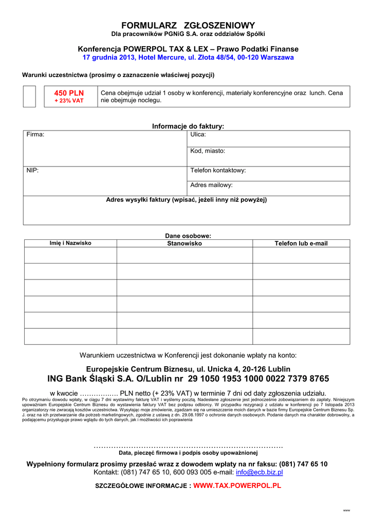 FORMULARZ ZGŁOSZENIOWY Dla pracowników PGNiG S.A. oraz oddziałów Spółki Konferencja POWERPOL TAX & LEX – Prawo Podatki Finanse 17 grudnia 2013, Hotel Mercure, ul. Złota 48/54, 00-120 Warszawa Warunki uczestnictwa (prosimy o zaznaczenie właściwej pozycji) 450 PLN Cena obejmuje udział 1 osoby w konferencji, materiały konferencyjne oraz lunch. Cena nie obejmuje noclegu. + 23% VAT Informacje do faktury: Firma: Ulica: Kod, miasto: NIP: Telefon kontaktowy: Adres mailowy: Adres wysyłki faktury (wpisać, jeżeli inny niż powyżej) Imię i Nazwisko Dane osobowe: Stanowisko Telefon lub e-mail Warunkiem uczestnictwa w Konferencji jest dokonanie wpłaty na konto: Europejskie Centrum Biznesu, ul. Unicka 4, 20-126 Lublin ING Bank Śląski S.A. O/Lublin nr 29 1050 1953 1000 0022 7379 8765 w kwocie ………….…. PLN netto (+ 23% VAT) w terminie 7 dni od daty zgłoszenia udziału. Po otrzymaniu dowodu wpłaty, w ciągu 7 dni wystawimy fakturę VAT i wyślemy pocztą. Nadesłane zgłoszenie jest jednocześnie zobowiązaniem do zapłaty. Niniejszym upoważniam Europejskie Centrum Biznesu do wystawienia faktury VAT bez podpisu odbiorcy. W przypadku rezygnacji z udziału w konferencji po 7 listopada 2013 organizatorzy nie zwracają kosztów uczestnictwa. Wysyłając moje zmówienie, zgadzam się na umieszczenie moich danych w bazie firmy Europejskie Centrum Biznesu Sp. J. oraz na ich przetwarzanie dla potrzeb marketingowych, zgodnie z ustawą z dn. 29.08.1997 o ochronie danych osobowych. Podanie danych ma charakter dobrowolny, a podającemu przysługuje prawo wglądu do tych danych, jak i możliwości ich poprawienia …………………………………………………………………. Data, pieczęć firmowa i podpis osoby upoważnionej Wypełniony formularz prosimy przesłać wraz z dowodem wpłaty na nr faksu: (081) 747 65 10 Kontakt: (081) 747 65 10, 600 093 005 e-mail: [email protected] SZCZEGÓŁOWE INFORMACJE : WWW.TAX.POWERPOL.PL www
