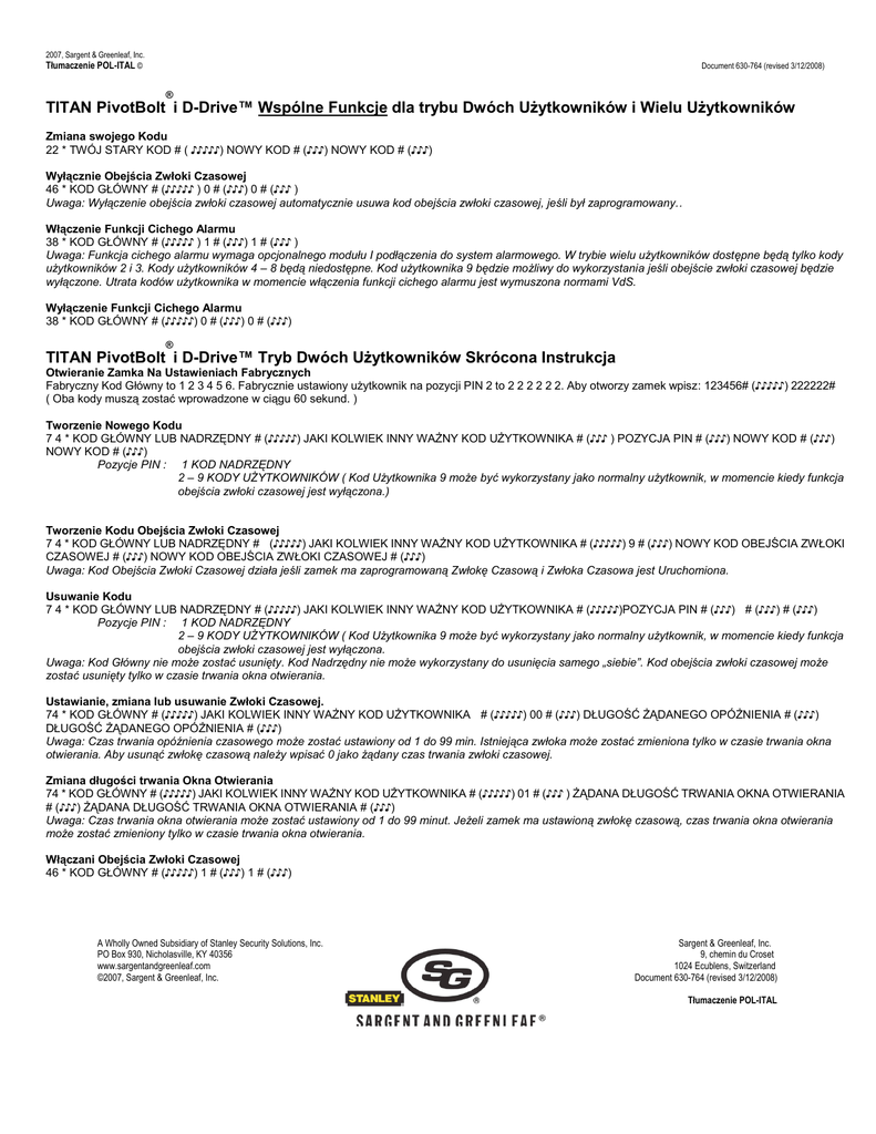2007, Sargent & Greenleaf, Inc. Tłumaczenie POL-ITAL © Document 630-764 (revised 3/12/2008) ® TITAN PivotBolt i D-Drive™ Wspólne Funkcje dla trybu Dwóch Użytkowników i Wielu Użytkowników Zmiana swojego Kodu 22 * TWÓJ STARY KOD # ( ♪♪♪♪♪) NOWY KOD # (♪♪♪) NOWY KOD # (♪♪♪) Wyłącznie Obejścia Zwłoki Czasowej 46 * KOD GŁÓWNY # (♪♪♪♪♪ ) 0 # (♪♪♪) 0 # (♪♪♪ ) Uwaga: Wyłączenie obejścia zwłoki czasowej automatycznie usuwa kod obejścia zwłoki czasowej, jeśli był zaprogramowany.. Włączenie Funkcji Cichego Alarmu 38 * KOD GŁÓWNY # (♪♪♪♪♪ ) 1 # (♪♪♪) 1 # (♪♪♪ ) Uwaga: Funkcja cichego alarmu wymaga opcjonalnego modułu I podłączenia do system alarmowego. W trybie wielu użytkowników dostępne będą tylko kody użytkowników 2 i 3. Kody użytkowników 4 – 8 będą niedostępne. Kod użytkownika 9 będzie możliwy do wykorzystania jeśli obejście zwłoki czasowej będzie wyłączone. Utrata kodów użytkownika w momencie włączenia funkcji cichego alarmu jest wymuszona normami VdS. Wyłączenie Funkcji Cichego Alarmu 38 * KOD GŁÓWNY # (♪♪♪♪♪) 0 # (♪♪♪) 0 # (♪♪♪) ® TITAN PivotBolt i D-Drive™ Tryb Dwóch Użytkowników Skrócona Instrukcja Otwieranie Zamka Na Ustawieniach Fabrycznych Fabryczny Kod Główny to 1 2 3 4 5 6. Fabrycznie ustawiony użytkownik na pozycji PIN 2 to 2 2 2 2 2 2. Aby otworzy zamek wpisz: 123456# (♪♪♪♪♪) 222222# ( Oba kody muszą zostać wprowadzone w ciągu 60 sekund. ) Tworzenie Nowego Kodu 7 4 * KOD GŁÓWNY LUB NADRZĘDNY # (♪♪♪♪♪) JAKI KOLWIEK INNY WAŻNY KOD UŻYTKOWNIKA # (♪♪♪ ) POZYCJA PIN # (♪♪♪) NOWY KOD # (♪♪♪) NOWY KOD # (♪♪♪) Pozycje PIN : 1 KOD NADRZĘDNY 2 – 9 KODY UŻYTKOWNIKÓW ( Kod Użytkownika 9 może być wykorzystany jako normalny użytkownik, w momencie kiedy funkcja obejścia zwłoki czasowej jest wyłączona.) Tworzenie Kodu Obejścia Zwłoki Czasowej 7 4 * KOD GŁÓWNY LUB NADRZĘDNY # (♪♪♪♪♪) JAKI KOLWIEK INNY WAŻNY KOD UŻYTKOWNIKA # (♪♪♪♪♪) 9 # (♪♪♪) NOWY KOD OBEJŚCIA ZWŁOKI CZASOWEJ # (♪♪♪) NOWY KOD OBEJŚCIA ZWŁOKI CZASOWEJ # (♪♪♪) Uwaga: Kod Obejścia Zwłoki Czasowej działa jeśli zamek ma zaprogramowaną Zwłokę Czasową i Zwłoka Czasowa jest Uruchomiona. Usuwanie Kodu 7 4 * KOD GŁÓWNY LUB NADRZĘDNY # (♪♪♪♪♪) JAKI KOLWIEK INNY WAŻNY KOD UŻYTKOWNIKA # (♪♪♪♪♪)POZYCJA PIN # (♪♪♪) # (♪♪♪) # (♪♪♪) Pozycje PIN : 1 KOD NADRZĘDNY 2 – 9 KODY UŻYTKOWNIKÓW ( Kod Użytkownika 9 może być wykorzystany jako normalny użytkownik, w momencie kiedy funkcja obejścia zwłoki czasowej jest wyłączona. Uwaga: Kod Główny nie może zostać usunięty. Kod Nadrzędny nie może wykorzystany do usunięcia samego „siebie”. Kod obejścia zwłoki czasowej może zostać usunięty tylko w czasie trwania okna otwierania. Ustawianie, zmiana lub usuwanie Zwłoki Czasowej. 74 * KOD GŁÓWNY # (♪♪♪♪♪) JAKI KOLWIEK INNY WAŻNY KOD UŻYTKOWNIKA # (♪♪♪♪♪) 00 # (♪♪♪) DŁUGOŚĆ ŻĄDANEGO OPÓŻNIENIA # (♪♪♪) DŁUGOŚĆ ŻĄDANEGO OPÓŻNIENIA # (♪♪♪) Uwaga: Czas trwania opóźnienia czasowego może zostać ustawiony od 1 do 99 min. Istniejąca zwłoka może zostać zmieniona tylko w czasie trwania okna otwierania. Aby usunąć zwłokę czasową należy wpisać 0 jako żądany czas trwania zwłoki czasowej. Zmiana długości trwania Okna Otwierania 74 * KOD GŁÓWNY # (♪♪♪♪♪) JAKI KOLWIEK INNY WAŻNY KOD UŻYTKOWNIKA # (♪♪♪♪♪) 01 # (♪♪♪ ) ŻĄDANA DŁUGOŚĆ TRWANIA OKNA OTWIERANIA # (♪♪♪) ŻĄDANA DŁUGOŚĆ TRWANIA OKNA OTWIERANIA # (♪♪♪) Uwaga: Czas trwania okna otwierania może zostać ustawiony od 1 do 99 minut. Jeżeli zamek ma ustawioną zwłokę czasową, czas trwania okna otwierania może zostać zmieniony tylko w czasie trwania okna otwierania. Włączani Obejścia Zwłoki Czasowej 46 * KOD GŁÓWNY # (♪♪♪♪♪) 1 # (♪♪♪) 1 # (♪♪♪) A Wholly Owned Subsidiary of Stanley Security Solutions, Inc. PO Box 930, Nicholasville, KY 40356 www.sargentandgreenleaf.com ©2007, Sargent & Greenleaf, Inc. Sargent & Greenleaf, Inc. 9, chemin du Croset 1024 Ecublens, Switzerland Document 630-764 (revised 3/12/2008) Tłumaczenie POL-ITAL ® TITAN PivotBolt i D-Drive™ Wielu Użytkowników Skrócona Instrukcja Otwieranie Zamka Na Ustawieniach Fabrycznych Fabryczny Kod Główny to 1 2 3 4 5 6. Aby otworzy zamek wpisz: 123456# Zmiana z Wielu Użytkowników na Dwa Kody (Ta nieodwracalna zmiana musi zostać dokonana przed pierwszą zmiana fabrycznego KODU GŁÓWNEGO. Po tej zmianie należy używać Skróconą Instrukcję Tryb Dwóch Użytkowników.) 76 * 1 2 3 4 5 6 # (♪♪♪♪♪) 1 # (♪♪♪) 1 # (♪♪♪) Uwaga: Użytkownik 2 zostanie automatycznie dodany, jako kod 2 2 2 2 2 2, a kod MRC zostanie wyłączony. Tworzenie Nowego Kodu 7 4 * KOD GŁÓWNY LUB NADRZĘDNY # (♪♪♪♪♪) POZYCJA PIN # (♪♪♪) NOWY KOD # (♪♪♪) NOWY KOD # (♪♪♪) Pozycje PIN : 1 KOD NADRZĘDNY 2 – 9 KODY UŻYTKOWNIKÓW ( Kod Użytkownika 9 może być wykorzystany jako normalny użytkownik, w momencie kiedy funkcja obejścia zwłoki czasowej jest wyłączona.) Tworzenie Kodu Obejścia Zwłoki Czasowej 7 4 * KOD GŁÓWNY LUB NADRZĘDNY # (♪♪♪♪♪) 9 # (♪♪♪ ) NOWY KOD OBEJŚCIA ZWŁOKI CZASOWEJ # (♪♪♪) NOWY KOD OBEJŚCIA ZWŁOKI CZASOWEJ # (♪♪♪) Uwaga: Kod Obejścia Zwłoki Czasowej działa jeśli zamek ma zaprogramowaną Zwłokę Czasową i Zwłoka Czasowa jest Uruchomiona. Usuwanie Kodu 7 4 * KOD GŁÓWNY LUB NADRZĘDNY # (♪♪♪♪♪) POZYCJA PIN # (♪♪♪) # (♪♪♪) # (♪♪♪) Pozycje PIN : 1 KOD NADRZĘDNY 2 – 9 KODY UŻYTKOWNIKÓW ( Kod Użytkownika 9 może być wykorzystany jako normalny użytkownik, w momencie kiedy funkcja obejścia zwłoki czasowej jest wyłączona.) Uwaga: Kod Gł