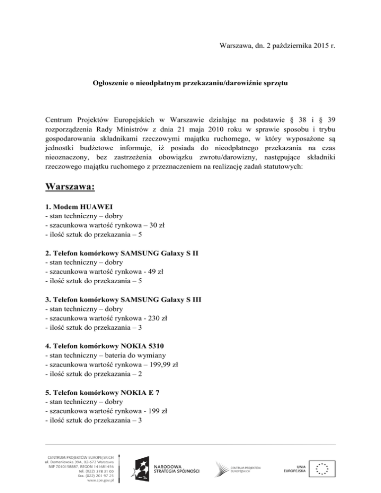 Warszawa, dn. 2 października 2015 r. Ogłoszenie o nieodpłatnym przekazaniu/darowiźnie sprzętu Centrum Projektów Europejskich w Warszawie działając na podstawie § 38 i § 39 rozporządzenia Rady Ministrów z dnia 21 maja 2010 roku w sprawie sposobu i trybu gospodarowania składnikami rzeczowymi majątku ruchomego, w który wyposażone są jednostki budżetowe informuje, iż posiada do nieodpłatnego przekazania na czas nieoznaczony, bez zastrzeżenia obowiązku zwrotu/darowizny, następujące składniki rzeczowego majątku ruchomego z przeznaczeniem na realizację zadań statutowych: Warszawa: 1. Modem HUAWEI - stan techniczny – dobry - szacunkowa wartość rynkowa – 30 zł - ilość sztuk do przekazania – 5 2. Telefon komórkowy SAMSUNG Galaxy S II - stan techniczny – dobry - szacunkowa wartość rynkowa - 49 zł - ilość sztuk do przekazania – 5 3. Telefon komórkowy SAMSUNG Galaxy S III - stan techniczny – dobry - szacunkowa wartość rynkowa - 230 zł - ilość sztuk do przekazania – 3 4. Telefon komórkowy NOKIA 5310 - stan techniczny – bateria do wymiany - szacunkowa wartość rynkowa – 199,99 zł - ilość sztuk do przekazania – 2 5. Telefon komórkowy NOKIA E 7 - stan techniczny – dobry - szacunkowa wartość rynkowa - 199 zł - ilość sztuk do przekazania – 3 6. Fotel obrotowy FLITE - stan techniczny – dobry - szacunkowa wartość rynkowa - 60 zł - ilość sztuk do przekazania – 25 7. Lodówka Amica - stan techniczny – dobry - szacunkowa wartość rynkowa - 140 zł - ilość sztuk do przekazania – 4 8. Pendrive Kingston - stan techniczny – bardzo dobry - szacunkowa wartość rynkowa - 12 zł - ilość sztuk do przekazania – 13 Wrocław: 1. Fotel obrotowy FLITE - stan techniczny – dobry - szacunkowa wartość rynkowa - 60 zł - ilość sztuk do przekazania – 14 Wnioski o nieodpłatne przekazanie/darowiznę składnika majątku ruchomego spełniającego wymogi określone w § 38 i § 39 rozporządzenia Rady Ministrów z dnia 21 maja 2010 roku w sprawie sposobu i trybu gospodarowania składnikami rzeczowymi majątku ruchomego, w który wyposażone są jednostki budżetowe; należy kierować do p.o. Dyrektora Centrum Projektów Europejskich do dnia 12 października 2015 roku na adres: Centrum Projektów Europejskich, ul. Domaniewska 39a, 02-672 Warszawa. Osoba do kontaktu: Joanna Jansson, Tel. 22 378 31 12 Załącznik nr 1 do ogłoszenia …………….. dnia……….. ………………………………………….. pieczęć jednostki składającej wniosek Wniosek o nieodpłatne przekazanie/darowiznę* składników majątkowych 1. Nazwa, siedziba, adres jednostki występującej o nieodpłatne otrzymanie/darowiznę nw. składnika majątku ruchomego: ....................................................................................................................................................... ....................................................................................................................................................... ..................................................................................................................................... ................................................................................................................................................. 2. Wskazanie składnika majątku ruchomego, o który występuje jednostka: ………………………………………………………………………………………………… ………………………………………………………………………………………………… ………………………………………………………………………………………… 3. Uzasadnienie potrzeb i sposobu wykorzystania składnika majątku: ....................................................................................................................................................... ....................................................................................................................................................... ..................................................................................................................................... ....................................................................................................................................................... ........................................................................................................................................... ....................................................................................................................................................... ....................................................................................................................................................... ..................................................................................................................................... ....................................................................................................................................................... ........................................................................................................................................... 4. Oświadczam, że otrzymany składnik majątku ruchomego zostanie odebrany w terminie i miejscu wskazanym w protokole zdawczo-odbiorczym. …………………….. Miejscowość i data *niepotrzebne skreślić ……………………………….. pieczęć i podpis kierownika jednostki