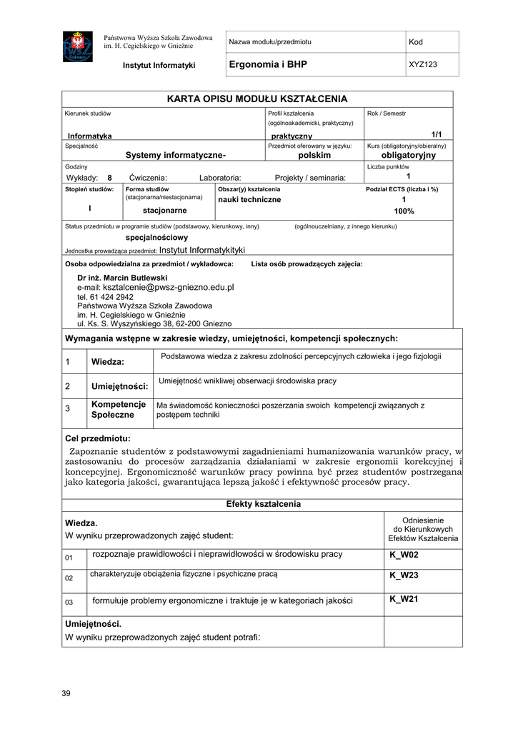 Państwowa Wyższa Szkoła Zawodowa im. H. Cegielskiego w Gnieźnie Instytut Informatyki Nazwa modułu/przedmiotu Kod Ergonomia i BHP XYZ123 KARTA OPISU MODUŁU KSZTAŁCENIA Kierunek studiów Profil kształcenia Rok / Semestr (ogólnoakademicki, praktyczny) Informatyka 1/1 praktyczny Specjalność Przedmiot oferowany w języku: Systemy informatyczne- polskim Godziny Kurs (obligatoryjny/obieralny) obligatoryjny Liczba punktów Wykłady: 8 Stopień studiów: I Ćwiczenia: Laboratoria: Forma studiów (stacjonarna/niestacjonarna) Obszar(y) kształcenia Podział ECTS (liczba i %) nauki techniczne 1 100% stacjonarne Status przedmiotu w programie studiów (podstawowy, kierunkowy, inny) Liczba punktów 1 Projekty / seminaria: (ogólnouczelniany, z innego kierunku) specjalnościowy Jednostka prowadząca przedmiot: Instytut Informatykityki Osoba odpowiedzialna za przedmiot / wykładowca: xx xxx Lista osób prowadzących zajęcia: Dr inż. Marcin Butlewski e-mail: [email protected] tel. 61 424 2942 Państwowa Wyższa Szkoła Zawodowa im. H. Cegielskiego w Gnieźnie ul. Ks. S. Wyszyńskiego 38, 62-200 Gniezno Wymagania wstępne w zakresie wiedzy, umiejętności, kompetencji społecznych: 1 Wiedza: 2 Umiejętności: 3 Kompetencje Społeczne Podstawowa wiedza z zakresu zdolności percepcyjnych człowieka i jego fizjologii Umiejętność wnikliwej obserwacji środowiska pracy Ma świadomość konieczności poszerzania swoich kompetencji związanych z postępem techniki Cel przedmiotu: Zapoznanie studentów z podstawowymi zagadnieniami humanizowania warunków pracy, w zastosowaniu do procesów zarządzania działaniami w zakresie ergonomii korekcyjnej i koncepcyjnej. Ergonomiczność warunków pracy powinna być przez studentów postrzegana jako kategoria jakości, gwarantująca lepszą jakość i efektywność procesów pracy. Efekty kształcenia Wiedza. W wyniku przeprowadzonych zajęć student: 01 02 03 rozpoznaje prawidłowości i nieprawidłowości w środowisku pracy charakteryzuje obciążenia fizyczne i psychiczne pracą formułuje problemy ergonomiczne i traktuje je w kategoriach jakości Umiejętności. W wyniku przeprowadzonych zajęć student potrafi: 39 Odniesienie do Kierunkowych Efektów Kształcenia K_W02 K_W23 K_W21 Ergonomia i BHP 01 diagnozować zagrożenia środowiska pracy K_U11 02 proponować rozwiązania zmniejszające obciążenia fizyczne i psychiczne K_U11 uwzględnić kryteria ergonomiczne przy doborze urządzeń K_U17 K_U18 03 Kompetencje społeczne. W wyniku przeprowadzonych zajęć student zdobędzie następujące kompetencje: 01 rozumie potrzebę permanentnego kształcenia się i przekazywania w sposób zrozumiały informacji z najbliższym otoczeniem w działalności zawodowej. K_K01 02 rozumie pozatechniczne ( w tym ekologiczne) skutki swojego działania i jego wpływu na środowisko, szczególnie w zakresie elektrotechniki. K_K02 potrafi zidentyfikować i ocenić skutki nieprawidłowości ergonomicznych K_K05 03 Sposoby sprawdzenia efektów kształcenia Wykład: Zaliczenie pisemne – pisemny opis wskazanego środowiska pracy i jego ergonomiczna analiza Studenci identyfikują zagrożenia dla wskazanego środowiska pracy i proponują rozwiązania zgodnie z uzyskana wiedzą w ramach przedmiotu. Treści programowe Geneza ergonomii na tle rozwoju techniki i nauki. Nauki składowe i charakter ergonomii. Ergonomia a bhp – aspekty ekonomiczne. System człowiek – obiekt techniczny i jego otoczenie. Interpretacja systemu jako stanowiska pracy. Cel i zakres działalności ergonomicznej. Współczesne nurty badań ergonomicznych. Metody diagnozowania ergonomicznego. Analiza fizycznych obciążeń pracą i gospodarka cieplna organizmu. Analiza obciążeń psychicznych związanych z pracą. Zasady optymalizacji obciążeń. Procesy percepcji i przetwarzania informacji. Zasady doboru urządzeń sygnalizacyjnych i sterowniczych. Kształtowanie parametrów przestrzennych stanowiska pracy oraz maszyn i narzędzi ręcznych w oparciu o dane antropometryczne. Ocena i kształtowanie środowiska pracy (drgania mechaniczne, hałas, mikroklimat, oświetlenie, promieniowanie szkodliwe, zanieczyszczenia powietrza). Zasady projektowania ergonomicznego. Przykłady ergonomicznego projektowania stanowisk: obróbczych, montażowych, dyspozytorskich, komputerowych. Ergonomia ludzi starszych i niepełnosprawnych. Literatura podstawowa: 1. Tytyk E., Projektowanie ergonomiczne. Wyd. Naukowe PWN, Warszawa-Poznań, 2001 2. Horst W. (red.), Ergonomia z elementami bezpieczeństwa pracy. Przewodnik do ćwiczeń laboratoryjnych. Wyd. Politechniki Poznańskiej, Poznań, 2006 40 Ergonomia i BHP Literatura uzupełniająca: 1. Górska E., Diagnoza ergonomiczna stanowisk pracy. Oficyna Wydawnicza Politechniki Warszawskiej, Warszawa, 1998 2. Jabłoński J. (red.), Ergonomia produktu. Ergonomiczne zasady projektowania produktów. Wyd. Politechniki Poznańskiej, Poznań, 2006 Obciążenie pracą studenta forma aktywności Godzin ECTS Łączny nakład pracy 301) 2 Zajęcia wymagające indywidualnego kontaktu z nauczycielem 202) 2 Zajęcia o charakterze praktycznym 1 pkt ECTS 25-30 h pracy studenta – do określenia poszczególnych składowych przyjęto: 1. łączne obciążenie studenta 2. —zajęcia dydaktyczne {w+c+L+p} + konsultacje +egzamin; dla stacjonarnych liczba godzin > 50 % godzin z poz1. KOMEK_2014_PraktST_v4_1.doc 41