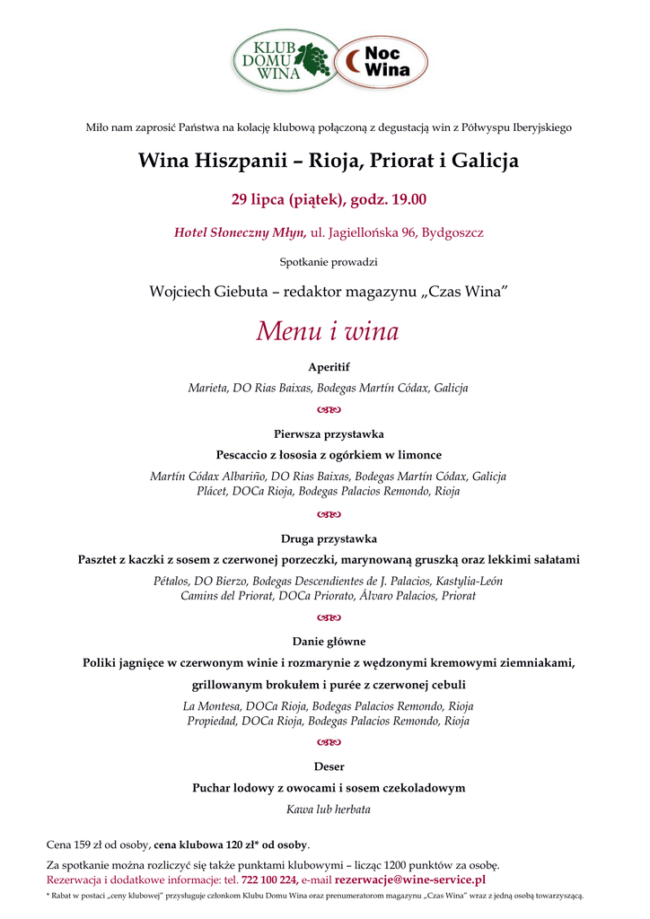 Miło nam zaprosić Państwa na kolację klubową połączoną z degustacją win z Półwyspu Iberyjskiego Wina Hiszpanii – Rioja, Priorat i Galicja 29 lipca (piątek), godz. 19.00 Hotel Słoneczny Młyn, ul. Jagiellońska 96, Bydgoszcz Spotkanie prowadzi Wojciech Giebuta – redaktor magazynu „Czas Wina” Menu i wina Aperitif Marieta, DO Rias Baixas, Bodegas Martín Códax, Galicja Pierwsza przystawka Pescaccio z łososia z ogórkiem w limonce Martín Códax Albariño, DO Rias Baixas, Bodegas Martín Códax, Galicja Plácet, DOCa Rioja, Bodegas Palacios Remondo, Rioja Druga przystawka Pasztet z kaczki z sosem z czerwonej porzeczki, marynowaną gruszką oraz lekkimi sałatami Pétalos, DO Bierzo, Bodegas Descendientes de J. Palacios, Kastylia-León Camins del Priorat, DOCa Priorato, Álvaro Palacios, Priorat Danie główne Poliki jagnięce w czerwonym winie i rozmarynie z wędzonymi kremowymi ziemniakami, grillowanym brokułem i purée z czerwonej cebuli La Montesa, DOCa Rioja, Bodegas Palacios Remondo, Rioja Propiedad, DOCa Rioja, Bodegas Palacios Remondo, Rioja Deser Puchar lodowy z owocami i sosem czekoladowym Kawa lub herbata Cena 159 zł od osoby, cena klubowa 120 zł* od osoby. Za spotkanie można rozliczyć się także punktami klubowymi – licząc 1200 punktów za osobę. Rezerwacja i dodatkowe informacje: tel. 722 100 224, e-mail [email protected] * Rabat w postaci „ceny klubowej” przysługuje członkom Klubu Domu Wina oraz prenumeratorom magazynu „Czas Wina” wraz z jedną osobą towarzyszącą.