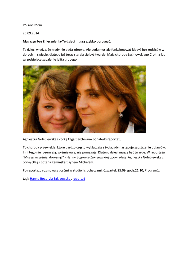 Polskie Radio 25.09.2014 Magazyn bez Znieczulenia-Te dzieci muszą szybko dorosnąć. Te dzieci wiedzą, że nigdy nie będą zdrowe. Ale będą musiały funkcjonować kiedyś bez rodziców w dorosłym świecie, dlatego już teraz starają się być twarde. Mają chorobę Leśniowskiego Crohna lub wrzodziejące zapalenie jelita grubego. Agnieszka Gołębiewska z córką Olgą z archiwum bohaterki reportażu To choroby przewlekłe, które bardzo często wykluczają z życia, gdy następuje zaostrzenie objawów. Inni tego nie rozumieją, wyśmiewają, nie pomagają. Dlatego dzieci muszą być twarde. W reportażu "Muszą wcześniej dorosnąć" - Hanny Bogoryja-Zakrzewskiej opowiadają Agnieszka Gołębiewska z córką Olgą i Bożena Kamińska z synem Michałem. Po reportażu rozmowa z gośćmi w studio i słuchaczami. Czwartek 25.09, godz.21.10, Program1. tagi: Hanna Bogoryja Zakrzewska , reportaż
