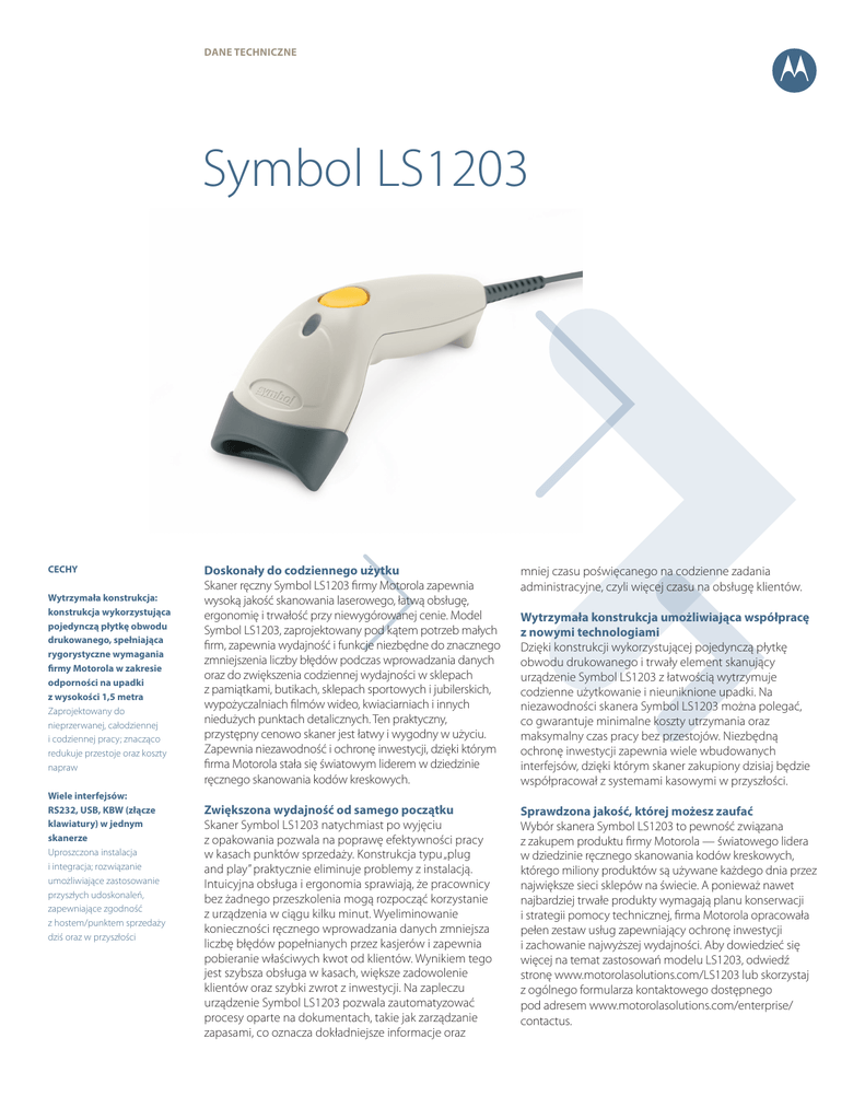 DANE techniczne Symbol LS1203 CECHY Wytrzymała konstrukcja: konstrukcja wykorzystująca pojedynczą płytkę obwodu drukowanego, spełniająca rygorystyczne wymagania firmy Motorola w zakresie odporności na upadki z wysokości 1,5 metra Zaprojektowany do nieprzerwanej, całodziennej i codziennej pracy; znacząco redukuje przestoje oraz koszty napraw Wiele interfejsów: RS232, USB, KBW (złącze klawiatury) w jednym skanerze Uproszczona instalacja i integracja; rozwiązanie umożliwiające zastosowanie przyszłych udoskonaleń, zapewniające zgodność z hostem/punktem sprzedaży dziś oraz w przyszłości Doskonały do codziennego użytku Skaner ręczny Symbol LS1203 firmy Motorola zapewnia wysoką jakość skanowania laserowego, łatwą obsługę, ergonomię i trwałość przy niewygórowanej cenie. Model Symbol LS1203, zaprojektowany pod kątem potrzeb małych firm, zapewnia wydajność i funkcje niezbędne do znacznego zmniejszenia liczby błędów podczas wprowadzania danych oraz do zwiększenia codziennej wydajności w sklepach z pamiątkami, butikach, sklepach sportowych i jubilerskich, wypożyczalniach filmów wideo, kwiaciarniach i innych niedużych punktach detalicznych. Ten praktyczny, przystępny cenowo skaner jest łatwy i wygodny w użyciu. Zapewnia niezawodność i ochronę inwestycji, dzięki którym firma Motorola stała się światowym liderem w dziedzinie ręcznego skanowania kodów kreskowych. mniej czasu poświęcanego na codzienne zadania administracyjne, czyli więcej czasu na obsługę klientów. Zwiększona wydajność od samego początku Skaner Symbol LS1203 natychmiast po wyjęciu z opakowania pozwala na poprawę efektywności pracy w kasach punktów sprzedaży. Konstrukcja typu „plug and play” praktycznie eliminuje problemy z instalacją. Intuicyjna obsługa i ergonomia sprawiają, że pracownicy bez żadnego przeszkolenia mogą rozpocząć korzystanie z urządzenia w ciągu kilku minut. Wyeliminowanie konieczności ręcznego wprowadzania danych zmniejsza liczbę błędów popełnianych przez kasjerów i zapewnia pobieranie właściwych kwot od klientów. Wynikiem tego jest szybsza obsługa w kasach, większe zadowolenie klientów oraz szybki zwrot z inwestycji. Na zapleczu urządzenie Symbol LS1203 pozwala zautomatyzować procesy oparte na dokumentach, takie jak zarządzanie zapasami, co oznacza dokładniejsze informacje oraz Sprawdzona jakość, której możesz zaufać Wybór skanera Symbol LS1203 to pewność związana z zakupem produktu firmy Motorola — światowego lidera w dziedzinie ręcznego skanowania kodów kreskowych, którego miliony produktów są używane każdego dnia przez największe sieci sklepów na świecie. A ponieważ nawet najbardziej trwałe produkty wymagają planu konserwacji i strategii pomocy technicznej, firma Motorola opracowała pełen zestaw usług zapewniający ochronę inwestycji i zachowanie najwyższej wydajności. Aby dowiedzieć się więcej na temat zastosowań modelu LS1203, odwiedź stronę www.motorolasolutions.com/LS1203 lub skorzystaj z ogólnego formularza kontaktowego dostępnego pod adresem www.motorolasolutions.com/enterprise/ contactus. Wytrzymała konstrukcja umożliwiająca współpracę z nowymi technologiami Dzięki konstrukcji wykorzystującej pojedynczą płytkę obwodu drukowanego i trwały element skanujący urządzenie Symbol LS1203 z łatwością wytrzymuje codzienne użytkowanie i nieuniknione upadki. Na niezawodności skanera Symbol LS1203 można polegać, co gwarantuje minimalne koszty utrzymania oraz maksymalny czas pracy bez przestojów. Niezbędną ochronę inwestycji zapewnia wiele wbudowanych interfejsów, dzięki którym skaner zakupiony dzisiaj będzie współpracował z systemami kasowymi w przyszłości. DANE techniczne Symbol LS1203 Ergonomiczna konstrukcja hybrydowa o eleganckiej, lekkiej, doskonale wyważonej obudowie Maksymalna wygoda codziennego użytkowania, redukuje zmęczenie użytkownika Intuicyjne skanowanie; konstrukcja umożliwiający bezproblemowe podłączanie („plug and play”) Praktycznie eliminuje czas instalacji oraz szkoleń, umożliwiając uzyskanie szybszego zwrotu z inwestycji Wysokiej jakości skaner laserowy 1D (jednowymiarowy) — skanowanie wyzwalane lub funkcja Auto-Scan™ (tryb ciągły) Dokładne skanowanie już za pierwszym razem; natychmiastowa gotowość do następnego skanowania Dane techniczne urządzenia Symbol LS1203 Warunki użytkowania Dane fizyczne Wymiary: 2,4 cala (wys.) x 7,1 cala (dł.) x 2,4 cala 6,2 cm (wys.) x 18 cm (dł.) x 6 cm (szer.) Waga (bez kabla): około 4,3 uncji (122 g) Temperatura robocza: od 32° do 122°F/od 0° do 50°C Temperatura przechowywania: -40° do 158°F / -40° do 70°C Napięcie i natężenie: 5 +/-10% V (prąd stały) przy 100 mA (tryb gotowości <35 mA) Wilgotność: wilgotność względna od 5% do 95%, bez kondensacji Źródło zasilania: zasilanie od hosta lub zasilanie zewnętrzne Kolor: biały lub czarno-szary Wytrzymałość na uszkodzenia: odporność na wielokrotne upuszczenie z wysokości 5 stóp/1,524 m na twarde podłoże Prędkość skanowania: 100 odczytów na sekundę Odporność na typowe światło: sztuczne w pomieszczeniu i naturalne światło na zewnątrz (bezpośrednie oświetlenie przez słońce). Światło lamp fluorescencyjnych, jarzeniowych, żarowych, rtęciowych, sodowych, LED4: 450 stopoświec (4844 luksów) Światło słoneczne: 8000 stopoświec (86 111 luksów) Typowe zastosowanie patrz tabela poniżej Odległość: Głośność sygnalizatora wybierana przez użytkownika (trzy poziomy) dźwiękowego: Min. kontrast wydruków: minimalny współczynnik odbicia 30% Dźwięk sygnalizatora wybierany przez użytkownika (trzy dźwięki) dźwiękowego: Charakterystyka działania Typ skanera: dwukierunkowy Źródło światła (laser): dioda laserowa 650 nm Obrót (przechylenie):1 ± 30° od naturalnego położenia Nachylenie:2 ± 65° Ustawienie ukośne (odchylenie):3 ± 60° Specyfikacja ele