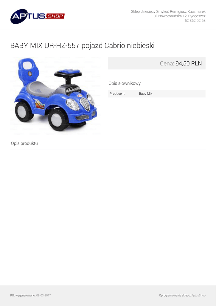 Sklep dziecięcy Smykuś Remigiusz Kaczmarek ul. Nowotoruńska 12, Bydgoszcz 52 362 02 63 BABY MIX UR-HZ-557 pojazd Cabrio niebieski Cena: 94,50 PLN Opis słownikowy Producent Baby Mix Opis produktu Plik wygenerowano: 08-03-2017 Powered by TCPDF (www.tcpdf.org) Oprogramowanie sklepu: AptusShop