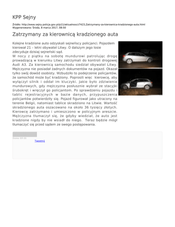 KPP Sejny Źródło: http://www.sejny.policja.gov.pl/p11/aktualnosci/7423,Zatrzymany-za-kierownica-kradzionego-auta.html Wygenerowano: Środa, 8 marca 2017, 08:50 Zatrzymany za kierownicą kradzionego auta Kolejne kradzione auto odzyskali sejneńscy policjanci. Pojazdem kierował 21 – letni obywatel Litwy. O dalszym jego losie zdecyduje dzisiaj sejneński sąd. W nocy z piątku na sobotę mundurowi patrolując drogę prowadzącą w kierunku Litwy zatrzymali do kontroli drogowej Audi A3. Za kierownicą samochodu siedział obywatel Litwy. Mężczyzna nie posiadał żadnych dokumentów na pojazd. Okazał tylko swój dowód osobisty. Wzbudziło to podejrzenie policjantów, że samochód może być kradziony. Poprosili więc kierowcę, aby wyłączył silnik i oddał im kluczyki. Jakie było zdziwienie mundurowych, gdy mężczyzna posłusznie wybrał ze stacyjki śrubokręt i wręczył go policjantom. Po sprawdzeniu pojazdu i tablic rejestracyjnych w bazie danych, przypuszczenia policjantów potwierdziły się. Pojazd figurował jako utracony na terenie Belgii, natomiast tablice skradziono na Litwie. Wartość skradzionego auta oszacowano na około 36 tysięcy złotych. Kierowcę zatrzymano i umieszczono w policyjnym areszcie. Mężczyzna tłumaczył się, że gdyby wiedział, że auto jest kradzione nigdy by nie wsiadł do niego. Teraz będzie mógł tłumaczyć się przed sądem ze swego postępowania. Ocena: 0/5 (0) Tweetnij