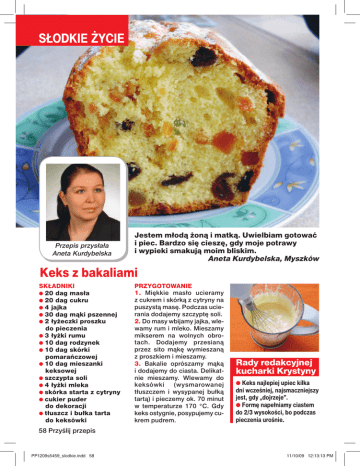 SŁODKIE ŻYCIE Przepis przysłała Aneta Kurdybelska Jestem młodą żoną i matką. Uwielbiam gotować i piec. Bardzo się cieszę, gdy moje potrawy i wypieki smakują moim bliskim. Aneta Kurdybelska, Myszków Keks z bakaliami SKŁADNIKI ● 20 dag masła ● 20 dag cukru ● 4 jajka ● 30 dag mąki pszennej ● 2 łyżeczki proszku do pieczenia ● 3 łyżki rumu ● 10 dag rodzynek ● 10 dag skórki pomarańczowej ● 10 dag mieszanki keksowej ● szczypta soli ● 4 łyżki mleka ● skórka starta z cytryny ● cukier puder do dekoracji ● tłuszcz i bułka tarta do keksówki PRZYGOTOWANIE 1. Miękkie masło ucieramy z cukrem i skórką z cytryny na puszystą masę. Podczas ucierania dodajemy szczyptę soli. 2. Do masy wbijamy jajka, wlewamy rum i mleko. Mieszamy mikserem na wolnych obrotach. Dodajemy przesianą przez sito mąkę wymieszaną z proszkiem i mieszamy. 3. Bakalie oprószamy mąką i dodajemy do ciasta. Delikatnie mieszamy. Wlewamy do keksówki (wysmarowanej tłuszczem i wysypanej bułką tartą) i pieczemy ok. 70 minut w temperaturze 170 °C. Gdy keks ostygnie, posypujemy cukrem pudrem. Rady redakcyjnej kucharki Krystyny ● Keks najlepiej upiec kilka dni wcześniej, najsmaczniejszy jest, gdy „dojrzeje”. ● Formę napełniamy ciastem do 2/3 wysokości, bo podczas pieczenia urośnie. 58 Przyślij przepis PP1209s5459_slodkie.indd 58 11/10/09 12:13:13 PM