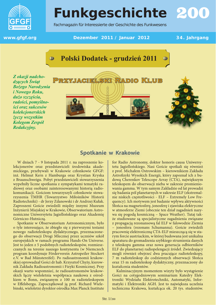Funkgeschichte : Fachmagazin fur Interessierte der Geschichte des Funkwesens 200 www.gfgf.org Dezember 2011 / Januar 2012 34. Jahrgang Polski Dodatek - grudzień 2011 Z okazji nadchodzących Świąt Bożego Narodzenia i Nowego Roku, dużo szczęścia, radości, pomyślności oraz sukcesów kolekcjonerskich życzy wszystkim Kolegom Zespół Redakcyjny. Przyjacielski Radio Klub Spotkanie w Krakowie W dniach 7 - 9 listopada 2011 r. na zaproszenie kolekcjonerów oraz przedstawicieli środowiska akademickiego, przebywali w Krakowie członkowie GFGF: inż. Helmut Kern z Hamburga oraz Krystian Kryska z Braunschweigu. Pobyt przedstawicieli stowarzyszenia wypełniły liczne spotkania z sympatykami tematyki radiowej oraz osobami zainteresowanymi historią radiokomunikacji. Gościom towarzyszyli członkowie stowarzyszenia TMHR (Towarzystwo Miłośników Historii Radiotechniki) - dr Jerzy Zdanowski i dr Andrzej Kułak. Zaproszeni Goście zwiedzili między innymi Muzeum Inżynierii Miejskiej w Krakowie, Obserwatorium Astronomiczne Uniwersytetu Jagiellońskiego oraz Akademię Górniczo-Hutniczą. Spotkanie w Obserwatorium Astronomicznym, było o tyle interesujące, że zbiegło się z pierwszymi testami nowego radioteleskopu dydaktycznego, przeznaczonego do obserwacji Drogi Mlecznej przez uczniów szkół europejskich w ramach programu Hands-On Universe. Jest to jeden z 5 podobnych radioteleskopów, rozmieszczanych na terenie naszego kontynentu (w Niemczech program koordynuje Förderverein Astropeiler Stockert e.V. w Bad Münstereifel). Po radioastronomii krakowskiej oprowadzał Gości dr hab. Krzysztof Chyży, kierownik Zakładu Radioastronomii i Fizyki Kosmicznej. Przy okazji warto wspomnieć, że radioastronomów krakowskich łączy wieloletnia współpraca naukowa z ośrodkiem w Bonn, związanym z 100 m radioteleskopem w Effelsbergu. Zapoczątkował ją prof. Richard Wielebinski, wieloletni dyrektor ośrodka Max Planck Institute for Radio Astronomy, doktor honoris causa Uniwersytetu Jagiellońskiego. Nasi Goście spotkali się również z prof. Michałem Ostrowskim – kierownikiem Zakładu Astrofizyki Wysokich Energii, który zapoznał ich z budową Cherenkov Telescope Array (CTA), największym teleskopem do obserwacji nieba w zakresie promieniowania gamma. W tym samym Zakładzie od lat prowadzi się badania pól planetarnych w zakresie ELF (ekstremalnie niskich częstotliwości - ELF – Extremely Low Frequency). Ich motywem jest badanie wpływu aktywności Słońca na magnetosferę, jonosferę i zjawiska elektryczne w atmosferze Ziemi (obecnie ten dział zagadnień nazywa się pogodą kosmiczną – Space Weather). Tutaj także studiowane są specjalistyczne zagadnienia związane z propagacją rezonansową fal ELF w falowodzie Ziemia – jonosfera (rezonans Schumanna). Goście zwiedzili pracownię elektroniczną CTA-ELF mieszczącą się w starym forcie austriackim, w której budowana jest unikalna aparatura do gromadzenia szybkiego strumienia danych z teleskopu gamma oraz nowa generacja odbiorników ELF do planetarnej radiopelengacji źródeł. Zwiedzający mogli również obejrzeć dwa pracujące radioteleskopy, 7 m radioteleskop do codziennych obserwacji Słońca oraz 15 m radioteleskop dydaktyczny, przeznaczony do kształcenia studentów. Kulminacyjnym momentem wizyty było wystąpienie Gości na cotygodniowym seminarium Katedry Elektroniki Wydziału Elektrotechniki, Automatyki, Informatyki i Elektroniki AGH. Jest to największa uczelnia techniczna Krakowa, kształcąca ok. 20 tys. studentów. Str. 1/200 Katedrę Elektroniki opuszcza rocznie kilkudziesięciu absolwentów, w tym spora grupa specjalistów w dziedzinie radiokomunikacji. Przy Katedrze działa Koło Radiowe skupiające studentów i absolwentów. W ramach seminarium inż. Helmut Kern wygłosił niezmiernie interesujący wykład o wczesnych systemach łączności bezprzewodowej. Wykład bogato ilustrowany fotografiami urządzeń historycznych, dotyczył analizy układowej pierwszych urządzeń nadawczych i detekcyjnych oraz pomiarów prowadzonych na oryginalnych eksponatach i budowanych specjalnie do tego celu replikach. Po referacie, który wzbudził ogromne zainteresowanie słuchaczy, pracownicy Katedry i zaproszeni goście wzięli udział w pokazie działania replik wczesnych urządzeń nadawczych i układów odbiorczych. Repliki nadajnika i odbiornika telegrafii bezprzewodowej systemu Brauna z 1898 r, układ odbiorczy oparty na kohererze, detektor magnetyczny Marconiego z 1902 r czy wierne kopie wczesnych lamp europejskich, wykonane przez inż. Helmuta Kerna i Pana Krystiana Kryskę, należą do unikalnych urządzeń tego rodzaju na świecie. Pokaz łączności radiowej odbył się w pobliskim Muzeum Historii AGH i Historii Techniki, w sali o długości sięgającej 100 m. Był to pierwszy tego rodzaju pokaz w Polsce, drugi w Europie (po pokazie w Hannowerze w 2009 roku). Efektywność działania telegraficznego łącza radiowego, zasilanego z niewielkich baterii, wzbudziła podziw i uznanie zgromadzonych. Rozgorzała dyskusja, dotycząca parametrów urządzeń historycznych, stosowanych w radiokomunikacji oraz metod ich badania. Wszyscy byli pod wrażeniem perfekcyjnego wykonania aparatur i ich pełnej funkcjonalności. P. Krystian Kryska opisał zasady, którymi kierują się autorzy przy budowie replik i omówił sposoby odtwarzania technologii historycznych, poszukiwania starych materiałów oraz metody ich obróbki. Godnymi podziwu przykładami omawianej szkoły rekonstrukcji były demonstrowana kopia lampy von Liebena, odpowiadająca parametrami i wyglądem lampie historycznej, działający - stosowany na Titanicu detektor magnetyczny Marconiego, czy też kopie wczesnych lamp amerykańskich (Lee Forest) i europejskich (Telefunkena oraz lamp francuskich). Referat i pokazy aparatury zgromadziły wielką liczbę uczestników i odbiły się szerokim echem na uczelni. Dyskusjom nie było końca, gorączka ogarnęła zarówno 