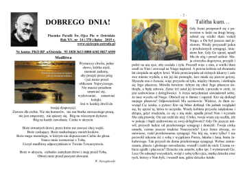 - 2 - DOBREGO DNIA! Pisemko Parafii Św. Ojca Pio w Ostródzie Rok XV, nr 14 ( 370 ) lipiec 2015 r. www.ojciecpio.ostroda.pl Nr konta: PKO BP o/Ostróda 93 1020 3613 0000 6102 0027 6550 Modlitwa Wystarczy chwila, jedno słowo, krótka myśl, moment zadumy, aby przejść przez próg i już stoisz przed obliczem Najwyższego. Nie musisz przedtem umawiać się, wydzwaniać, zamawiać kolejki. Jest w każdej chwili do twojej dyspozycji. Zawsze dla ciebie. Nie ma humorów, nie ma biurka zarzuconego pracą, nie jest zmęczony, nie spieszy się. Bóg na wiecznym dyżurze. Bóg na każde zawołanie. Czeka w ukryciu. Boże otwartych drzwi, przez które nie zawsze chcę wejść. Boże czekający. Boże nasłuchujący moich kroków. Boże mego monologu, w którym nie dopuszczam Ciebie do głosu. Naucz mnie rozmawiać z Tobą. Uczyń modlitwę odpoczynkiem w Twoim Towarzystwie. Boże w ukryciu, cichutko zamykam drzwi i staję przed Tobą. Obroń mnie przed pustymi słowami. W. Niewęgłowski Talitha kum… Gdy Jezus przeprawił się z powrotem w łodzi na drugi brzeg, zebrał się wielki tłum wokół Niego, a On był jeszcze nad jeziorem. Wtedy przyszedł jeden z przełożonych synagogi, imieniem Jair. Gdy Go ujrzał, upadł Mu do nóg i prosił usilnie: Moja córeczka dogorywa, przyjdź i połóż na nią ręce, aby ocalała i żyła. Poszedł więc z nim, a wielki tłum szedł za Nim i zewsząd na Niego napierał. A pewna kobieta od dwunastu lat cierpiała na upływ krwi. Wiele przecierpiała od różnych lekarzy i całe swe mienie wydała, a nic jej nie pomogło, lecz miała się jeszcze gorzej. Słyszała ona o Jezusie, więc przyszła od tyłu, między tłumem, i dotknęła się Jego płaszcza. Mówiła bowiem: żebym się choć Jego płaszcza dotknęła, a będę zdrowa. Zaraz też ustał jej krwotok i poczuła w ciele, że jest uzdrowiona z dolegliwości. A Jezus natychmiast uświadomił sobie, że moc wyszła od Niego. Obrócił się w tłumie i zapytał: Kto się dotknął mojego płaszcza? Odpowiedzieli Mu uczniowie: Widzisz, że tłum zewsząd Cię ściska, a pytasz: Kto się Mnie dotknął. On jednak rozglądał się, by ujrzeć tę, która to uczyniła. Wtedy kobieta przyszła zalękniona i drżąca, gdyż wiedziała, co się z nią stało, upadła przed Nim i wyznała Mu całą prawdę. On zaś rzekł do niej: Córko, twoja wiara cię ocaliła, idź w pokoju i bądź uzdrowiona ze swej dolegliwości! Gdy On jeszcze mówił, przyszli ludzie od przełożonego synagogi i donieśli: Twoja córka umarła, czemu jeszcze trudzisz Nauczyciela? Lecz Jezus słysząc, co mówiono, rzekł przełożonemu synagogi: Nie bój się, wierz tylko! I nie pozwolił nikomu iść z sobą z wyjątkiem Piotra, Jakuba i Jana, brata Jakubowego. Tak przyszli do domu przełożonego synagogi. Wobec zamieszania, płaczu i głośnego zawodzenia, wszedł i rzekł do nich: Czemu robicie zgiełk i płaczecie? Dziecko nie umarło, tylko śpi. I wyśmiewali Go. Lecz On odsunął wszystkich, wziął z sobą tylko ojca, matkę dziecka oraz tych, którzy z Nim byli, i wszedł tam, gdzie dziecko leżało. -3Ująwszy dziewczynkę za rękę, rzekł do niej: Talitha kum, to znaczy: Dziewczynko, mówię ci, wstań! Dziewczynka natychmiast wstała i chodziła, miała bowiem dwanaście lat. I osłupieli wprost ze zdumienia. Przykazał im też z naciskiem, żeby nikt o tym nie wiedział, i polecił, aby jej dano jeść. (Mk 5,21-43) TYLKO UWIERZ Jest to chyba jedna z najbardziej przejmujących scen ewangelicznych, której nie sposób stawiać sobie przed oczami bez łez wzruszenia i ściśnięcia gardła (…)Ale elementem, który nas chyba najbardziej porusza, jest postawa ojca. Nawet, gdyby Boga miało nie być, to na ten jeden raz należałoby Go wymyślić, aby zadośćuczynić błaganiu tego ojca. Ale Bóg jest i dlatego nie trzeba niczego wymyślać. Wystarczy, a raczej: trzeba, uwierzyć w fakty, w to, co Jezus wtedy zrobił.(…) Bo co by było, gdyby uzdrawiał każdego chorego? Szybko byśmy się przyzwyczaili, że tak być musi, że Bóg jest po to, by interweniować za każdym razem, gdy sobie tego zażyczymy, albo gdy zawiedziemy i coś popsujemy. Tak było do chwili grzechu pierworodnego: człowiek miał raj na ziemi, nie znał chorób ni śmierci, a jednak nie potrafił tego uszanować. Więc i tym razem pewnie byśmy Boga nie uszanowali. Jednakże pomimo wszystko, Bóg jest Panem życia i śmierci. Dla Niego nie ma sytuacji niemożliwych i gdy chce, może przywrócić zdrowie i życie każdemu. Ale nie na pstryknięcie palcem. Takie wskrzeszenie do nowego życia wymaga naszej wiary. Jezus wprost o tym powiedział: „Nie bój się, tylko wierz!” Do zmartwychwstania potrzebna jest wiara! Zdobądźmy się na taką wiarę, a może też staniemy się uczestnikami czy świadkami cudu? Ale wiara na miarę zmartwychwstania musi być bezwarunkowa, to znaczy, nie może ustać nawet wtedy, gdy dziecko nie zmartwychwstanie natychmiast. Autentyczna wiara w zmartwychwstanie daje gwarancje, że powstanie z martwych nastąpi po Sądzie Ostatecznym. To powinno wystarczyć, by na razie nie utracić nadziei. Wybór trzeba pozostawić Bogu, nie stawiając Mu żadnych warunków. On zobaczy, co zrobić, a my nie bójmy się, tylko wierzmy. Ks. Mariusz Pohl -4- Wakacje to dla dorosłych czas urlopów i regeneracji sił potrzebnych do dalszej pracy zawodowej, a dla dzieci to dwa miesiące bez szkoły, książek i sprawdzianów. Wyjeżdżamy wtedy do różnych zakątków naszego kraju, odwiedzamy rodzinę i przyjaciół, a osoby lepiej sytuowane decydują się często na wyjazd za granice naszej ojczyzny, aby spędzić miło jakiś czas nad lazurowym morzem lub powędrować w wysokie góry. Często w okresie wakacyjnym osoby dorosłe i dzieci, choć przyznają się do Kościoła katolickiego, robią sobie wakacje również w dziedzinie obowiązków religijnych. Wystarczy, że w miejscowości, w której wypoczywamy nie ma kościoła w zas