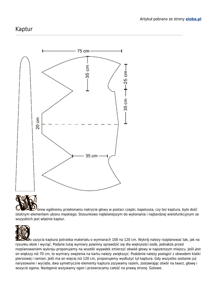 Artykuł pobrano ze strony eioba.pl Kaptur brew ogólnemu przekonaniu nakrycie głowy w postaci czapki, kapelusza, czy tez kaptura, było dość istotnym elementem ubioru męskiego. Stosunkowo najłatwiejszym do wykonania i najbardziej wielofunkcyjnym ze wszystkich jest właśnie kaptur. o uszycia kaptura potrzeba materiału o wymiarach 100 na 120 cm. Wykrój należy rozplanować tak, jak na rysunku obok i wyciąć. Podane tutaj wymiary powinny sprawdzić się dla większości osób, jednakże przed rozplanowaniem wykroju proponujemy na wszelki wypadek zmierzyć obwód głowy w najszerszym miejscu. Jeśli jest on większy niż 70 cm, to wymiary zwężenia na karku należy zwiększyć. Podobnie należy postąpić z obwodem klatki piersiowej i ramion. Jeśli ma on więcej niż 120 cm, proponujemy wydłużyć tył kaptura. Gdy wszystko zostanie już narysowane i wycięte, dwa symetryczne elementy kaptura zszywamy razem, zostawiając otwór na twarz, głowę i wszycie ogona. Następnie wszywamy ogon i przewracamy całość na prawą stronę. Gotowe. większości wypadków rzeczy szyte z wełny były podszywane lnem, futrem, albo wełną w kontrastującym kolorze. Podszycie wykonujemy w ten sam sposób, tylko należy pamiętać, że najpierw zszywamy podszycie z wierzchnią warstwą materiału (i wywracamy na prawą stronę), a dopiero potem całość. czywiście, istnieją różne wariacje. Jeśli brakuje materiału, to można nie doszywać ogona (choć należy pamiętać, że np. we Francji jego długość oznaczała pozycję społeczną), jeśli ogon ma służyć za szalik to można go nieco poszerzyć. Dół kaptura można ozdobić np. blankami, doszyć guzy itp. Zachęcamy do eksperymentów. aptur można nosić na wiele różnych sposobów. Oprócz zwykłego założenia go na ramiona można podwinąć otwór na twarz aż do zwężenia na karku i założyć tak powstałą czapkę na głowę. Ogon może w tym wypadku służyć za szalik albo zwisać gdzieś z boku. W XV wieku kaptur stopniowo wychodził z użycia, natomiast pojawiły się czapki i czaperony o podobnym wyglądzie. Bibliografia 1. M. Gutowska-Rychlewska, Historia ubiorów, Ossolineum, Wrocław-Warszawa-Kraków 1968 2. Krystyna Turska, Ubiór dworski w Polsce w dobie pierwszych Jagiellonów, Polska Akademia Nauk, Instytut Historii Kultury Materialnej, Ossolineum, Wrocław-Warszawa-Kraków-Gdańsk-Łódź 1987, ISBN 83-04-02623-6 3. E. Wagner, Z. Drobná, J.Durdík, Tracht, Wehr und Waffen, Artia Praha, 1960 Źródła ilustracji 1. E. Wagner, Z. Drobná, J.Durdík, Tracht, Wehr und Waffen 2. Wykrój autora Autor: Bartłomiej Przedruk ze strony: http://bog.webd.pl/stroje/wykroje/kaptur1.html Artykuł pobrano ze strony eioba.pl