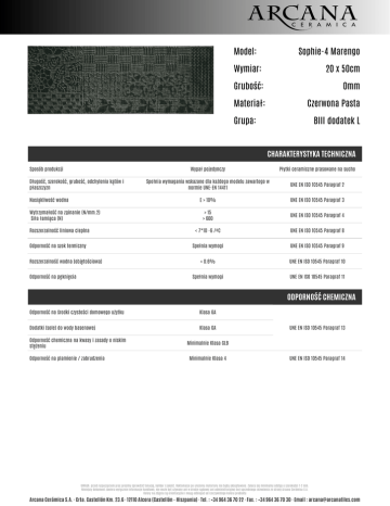 Model: Sophie-4 Marengo Wymiar: 20 x 50cm Grubość: 0mm Materiał: Czerwona Pasta Grupa: BIII dodatek L CHARAKTERYSTYKA TECHNICZNA Sposób produkcji Długość, szerokość, grubość, odchylenia kątów i płaszczyzn Nasiąkliwość wodna Wytrzymałość na zginanie (N/mm.2) Siła łamiąca (N) Rozszerzalność liniowa cieplna Odporność na szok termiczny Rozszerzalność wodna (objętościowa) Odporność na pęknięcia Wypał pojedynczy Płytki ceramiczne prasowane na sucho Spełnia wymagania wskazane dla każdego modelu zawartego w normie UNE-EN 14411 UNE EN ISO 10545 Paragraf 2 E > 10% UNE EN ISO 10545 Paragraf 3 > 15 > 600 UNE EN ISO 10545 Paragraf 4 < 7*10 -6 /ºC UNE EN ISO 10545 Paragraf 8 Spełnia wymogi UNE EN ISO 10545 Paragraf 9 < 0.6% UNE EN ISO 10545 Paragraf 10 Spełnia wymogi UNE EN ISO 10545 Paragraf 11 ODPORNOŚĆ CHEMICZNA Odporność na środki czystości domowego użytku Klasa GA Dodatki (sole) do wody basenowej Klasa GA Odporność chemiczna na kwasy i zasady o niskim stężeniu Odporność na plamienie / zabrudzenia UNE EN ISO 10545 Paragraf 13 Minimalnie Klasa GLB Minimalnie Klasa 4 UNE EN ISO 10545 Paragraf 14 UWAGA: przed rozpoczęciem prac prosimy sprawdzić tonację, kaliber i jakość. Reklamacje po ułożeniu materiału nie będą akceptowane. Zaleca się minimalny odstęp o szerokości 1-2 mm. Niniejszy dokument zawiera wyłącznie informacje handlowe, nie może być używany ani w drodze sądowej ani administracyjnej bez uprzedniego zezwolenia ze strony Arcana Ceràmica S.A. Kolory na zdjęciu są orientacyjne i mogą odbiegać od rzeczywistego koloru produktu Arcana Cerámica S.A. · Crta. Castellón Km. 23.6 · 12110 Alcora (Castellón - Hiszpania) · Tel. : +34 964 36 70 22 · Fax. : +34 964 36 70 30 · Email : [email protected] Powered by TCPDF (www.tcpdf.org)
