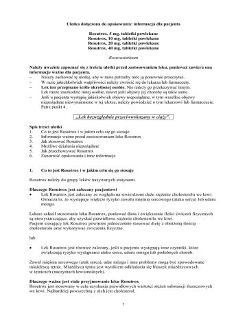 Ulotka dołączona do opakowania: informacja dla pacjenta Rosutrox, 5 mg, tabletki powlekane Rosutrox, 10 mg, tabletki powlekane Rosutrox, 20 mg, tabletki powlekane Rosutrox, 40 mg, tabletki powlekane Rosuvastatinum Należy uważnie zapoznać się z treścią ulotki przed zastosowaniem leku, ponieważ zawiera ona informacje ważne dla pacjenta. Należy zachować tę ulotkę, aby w razie potrzeby móc ją ponownie przeczytać. W razie jakichkolwiek wątpliwości należy zwrócić się do lekarza lub farmaceuty. Lek ten przepisano ściśle określonej osobie. Nie należy go przekazywać innym. Lek może zaszkodzić innej osobie, nawet jeśli objawy jej choroby są takie same. Jeśli u pacjenta wystąpią jakiekolwiek objawy niepożądane, w tym wszelkie objawy niepożądane niewymienione w tej ulotce, należy powiedzieć o tym lekarzowi lub farmaceucie. Patrz punkt 4. „Lek bezwzględnie przeciwwskazany w ciąży”. Spis treści ulotki 1. Co to jest Rosutrox i w jakim celu się go stosuje 2. Informacje ważne przed zastosowaniem leku Rosutrox 3. Jak stosować Rosutrox 4. Możliwe działania niepożądane 5. Jak przechowywać Rosutrox 6. Zawartość opakowania i inne informacje 1. Co to jest Rosutrox i w jakim celu się go stosuje Rosutrox należy do grupy leków nazywanych statynami. Dlaczego Rosutrox jest zalecany pacjentowi Lek Rosutrox jest zalecany ze względu na stwierdzone duże stężenie cholesterolu we krwi. Oznacza to, że występuje większe ryzyko zawału mięśnia sercowego (ataku serca) lub udaru mózgu. Lekarz zalecił stosowanie leku Rosutrox, ponieważ dieta i zwiększenie ilości ćwiczeń fizycznych są niewystarczające, aby uzyskać prawidłowe stężenie cholesterolu we krwi. Pacjent stosujący lek Rosutrox powinien jednocześnie stosować dietę z obniżoną ilością cholesterolu oraz wykonywać ćwiczenia fizyczne. lub Lek Rosutrox jest również zalecany, jeśli u pacjenta występują inne czynniki, które zwiększają ryzyko wystąpienia ataku serca, udaru mózgu lub podobnych chorób. Zawał mięśnia sercowego (atak serca), udar mózgu i inne problemy mogą być spowodowane miażdżycą tętnic. Miażdżyca tętnic jest wynikiem odkładania się blaszek miażdżycowych w tętnicach (naczyniach krwionośnych). Dlaczego ważne jest stałe przyjmowanie leku Rosutrox Rosutrox jest stosowany w celu uzyskania prawidłowych wartości stężeń substancji tłuszczowych we krwi. Najbardziej powszechną z nich jest cholesterol. 1 We krwi są różne rodzaje cholesterolu, tzw. „zły” cholesterol (LDL-C) i „dobry” cholesterol (HDL-C). Rosutrox może powodować zmniejszenie stężenia „złego” cholesterolu i zwiększenie stężenia „dobrego” cholesterolu. Działanie leku Rosutrox polega na hamowaniu produkcji „złego” cholesterolu w organizmie. Pomaga on także w usuwaniu „złego” cholesterolu z krwi. U większości osób zwiększone stężenie cholesterolu nie zmienia samopoczucia, ponieważ nie powoduje żadnych objawów. Jednak jeśli pacjent nie leczy się, dochodzi do odkładania złogów substancji tłuszczowych w ścianach naczyń krwionośnych i ich zwężenia. Czasami może dojść do zablokowania zwężonego naczynia krwionośnego, przerwania dopływu krwi do serca lub mózgu i w konsekwencji do zawału serca lub udaru mózgu. Uzyskanie prawidłowych wartości stężenia cholesterolu we krwi zmniejsza ryzyko zawału serca, udaru mózgu lub podobnych chorób. Nawet jeśli po zastosowaniu leku Rosutrox stężenie cholesterolu we krwi będzie prawidłowe, należy go nadal stosować. Zapobiega to ponownemu zwiększaniu się stężenia cholesterolu, powodującego odkładanie się substancji tłuszczowych w naczyniach. Należy przerwać stosowanie leku, jeśli tak zaleci lekarz lub jeśli pacjentka zajdzie w ciążę. 2. Informacje ważne przed zastosowaniem leku Rosutrox Kiedy nie stosować leku Rosutrox jeśli pacjent ma uczulenie na rozuwastatynę lub którykolwiek z pozostałych składników tego leku (wymienionych w punkcie 6), jeśli pacjentka jest w ciąży lub karmi piersią. Jeśli kobieta stosująca Rosutrox zajdzie w ciążę, powinna natychmiast przerwać stosowanie leku i poinformować lekarza. Kobiety stosujące Rosutrox powinny stosować skuteczne metody zapobiegania ciąży. jeśli u pacjenta występuje choroba wątroby, jeśli u pacjenta występuje ciężka choroba nerek, jeśli u pacjenta występują częste lub niewiadomego pochodzenia dolegliwości lub bóle mięśni, jeśli pacjent przyjmuje cyklosporynę (lek stosowany np. po przeszczepie narządów). Jeśli którakolwiek z wymienionych wyżej sytuacji dotyczy pacjenta lub pacjent ma wątpliwości, należy ponownie skontaktować się z lekarzem. Ponadto, NIE NALEŻY stosować leku Rosutrox 40 mg (największa dawka) jeśli u pacjenta występuje umiarkowanie nasilona choroba nerek (w przypadku wątpliwości należy zapytać lekarza), jeśli u pacjenta występują zaburzenia czynności tarczycy, jeśli u pacjenta występują częste lub niewiadomego pochodzenia dolegliwości lub bóle mięśni, jeśli u pacjenta lub członków jego rodziny stwierdzano choroby mięśni lub wcześniej podczas stosowania leków zmniejszających stężenie substancji tłuszczowych występowały zaburzenia ze strony mięśni, jeśli pacjent regularnie pije duże ilości alkoholu, jeśli pacjent pochodzi z Azji (Japończycy, Chińczycy, Filipińczycy, Wietnamczycy, Koreańczycy i Hindusi), jeśli pacjent stosuje leki z grupy fibratów, tzn. inne leki zmniejszające stężenie cholesterolu. Jeśli którakolwiek z wymienionych wyżej sytuacji dotyczy pacjenta (lub pacjent ma wątpliwości), należy ponownie skontaktować się z lekarzem. 2 Ostrzeżenia i środki ostrożności Przed rozpoczęciem stosowania leku Rosutrox należy skonsultować się z lekarzem lub farmaceutą: jeśli u pacjenta występują choroby nerek, jeśli u pacjenta występują choroby wątroby, jeśli u pacjenta występują częs