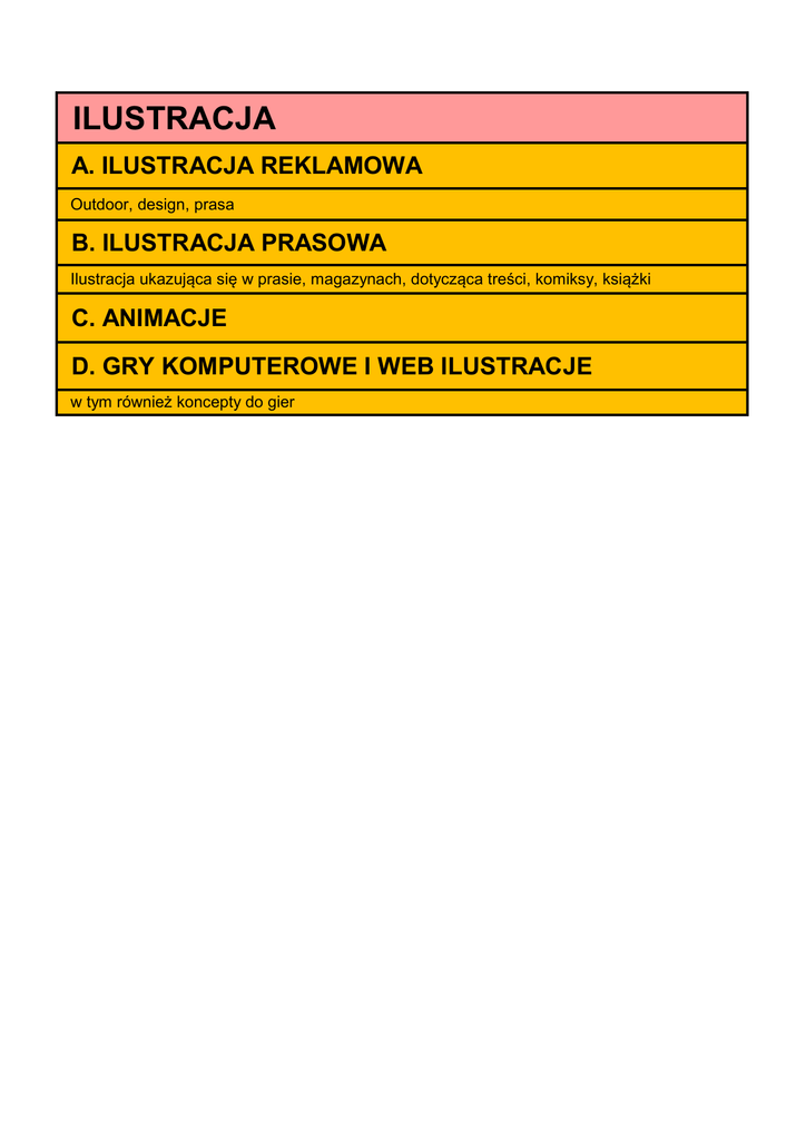 ILUSTRACJA A. ILUSTRACJA REKLAMOWA Outdoor, design, prasa B. ILUSTRACJA PRASOWA Ilustracja ukazująca się w prasie, magazynach, dotycząca treści, komiksy, książki C. ANIMACJE D. GRY KOMPUTEROWE I WEB ILUSTRACJE w tym również koncepty do gier