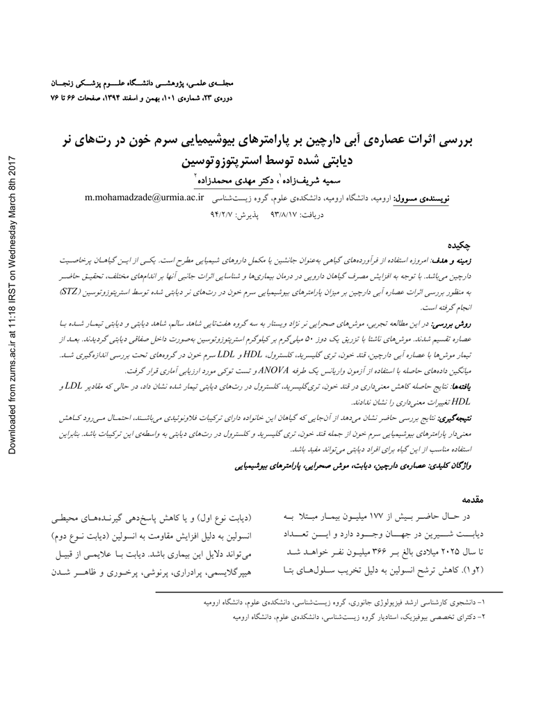 ƱŚººŬƳŻƾĪººƃżěƭƺºººƬƗƵŚĮººƄƳřŵƾººƄƷƹĦěƾºưƬƗƽƶººƬŬƯ Downloaded from zums.ac.ir at 11:18 IRST on Wednesday March 8th 2017 ìëŚţë뚌ŰƠƇæèîéŶƴƠſřƹƲưƸŝæåæƽƵŹŚưƃ çèƽƵŹ ƹŵ źƳƽŚƷšŹ ŹŵƱƺųƭźſƾƿŚǀưǀƃƺǀŝƽŚƷźŤƯřŹŚěźŝƲǀģŹřŵƾŝōįƵŹŚƈƗ šřźŧřƾſŹźŝ ƲǀſƺţƹŻƺŤěźŤſřƎſƺţƵŶƃƾŤŝŚƿŵ çƵŵřŻŶưŰƯƽŶƸƯźŤƧŵæƵŵřŻƞ ƿźƃƶǀưſ [email protected]ƾſŚƴƃŢƀ ƿŻƵƹźĭƭƺƬƗƽƵŶĪƄƳřŵ ƶǀƯƹŹřƵŚĮƄƳřŵƶǀƯƹŹřƩƹƺƀƯƽƵŶƴƀƿƺƳ îéçìƁźƿŸěîèíæìŢƟŚƿŹŵ ƵŶǀĪģ ŢǀºƇŚųźěƱŚºƷŚǀĭƲºƿřŻř ƾºĪƿŢſřŭźƐƯ ƾƿŚǀưǀƃ ƽŚƷƹŹřŵƪưĪƯŚƿƲǀƄƳŚūƱřƺƴƗƶŝ ƾƷŚǀĭ ƽŚƷƵŵŹƹōźƟ ŻřƵŵŚƠŤſřƵŻƹźƯřƝŶƷƹƶƴǀƯŻ źºƋŚůƢºǀƤŰţƞƬŤŴƯƽŚƷƭřŶƳř źŝŚƸƳōƾŞƳŚūšřźŧřƾƿŚſŚƴƃƹŚƷƽ ŹŚưǀŝƱŚƯŹŵŹŵƾƿƹŹřŵƱŚƷŚǀĭƝźƈƯƂƿřżƟřƶŝƶūƺţŚŝŶƃŚŝƾ ƯƲǀģŹřŵ STZƲǀſƺţƹŻƺŤěźŤſřƎſƺţƵŶƃƾŤŝŚƿŵźƳ ƽŚƷšŹ ŹŵƱƺųƭźſ ƾƿŚǀưǀƃƺǀŝ ƽŚƷźŤƯřŹŚěƱřżǀƯźŝƲǀģŹřŵ ƾŝōƵŹŚƈƗšřźŧř ƾſŹźŝŹƺƔƴƯƶŝ ŢſřƶŤƟźĭƭŚŬƳř ŚºŝƵŶºƃŹŚºưǀţƾŤŝŚƿŵƹƾŤŝŚƿŵŶƷŚƃƮƫŚſŶƷŚƃƾƿŚţŢƠƷ ƵƹźĭƶſƶŝŹŚŤƀƿƹŵřĦƳźƳƾƿřźŰƇƽŚƷƁƺƯ ƾŝźŬţƶƘƫŚƐƯƲƿřŹŵƾſŹźŝƁƹŹ ŻřŶºƘŝŶƳŶƿŵźĭƾŤŝŚƿŵƾƣŚƠƇƪųřŵšŹƺƇƶŝ ƲǀſƺţƹŻƺŤěźŤſřƭźĭƺƬǀĩźŝƭźĭƾ ƬǀƯêåŻƹŵ Ĩƿ ƢƿŹżţ Śŝ ŚŤƃŚƳ ƽŚƷƁƺƯ ŶƳŶƃƮǀƀƤţƵŹŚƈƗ Ŷºƃ ƽźǀĭƵŻřŶƳř ƾſŹźŝŢŰţ ƽŚƷƵƹźĭ ŹŵƱƺųƭźſLDLƹHDLƩƹźŤƀƬĩŶƿźƀǀƬĭ ƽźţƱƺųŶƴƣƲǀģŹřŵ ƾŝōƵŹŚƈƗŚŝŚƷƁƺƯ ŹŚưǀţ ŢƟźĭŹřźƣƽŹŚƯōƾŝŚƿŻŹřŵŹƺƯƾĩƺţŢƀţƹANOVAƶƟźƏĨƿžƳŚƿŹřƹƱƺƯŻōŻřƵŵŚƠŤſřŚŝƶƬƇŚůƽŚƷƵŵřŵ ƲǀĮƳŚǀƯ ƹLDLźƿŵŚƤƯƶĩƾƫŚůŹŵŵřŵƱŚƄƳƵŶƃŹŚưǀţƾŤŝŚƿŵƽŚƷšŹŹŵƩƹźŤƀƬĩŶƿźƀǀƬĭ ƽźţƱƺųŶƴƣŹŵƽŹřŵ ƾƴƘƯƂƷŚĩƶƬƇŚůŪƿŚŤƳ ŚƷƶŤƟŚ ƿ ŶƳŵřŶƳƱŚƄƳřŹƽŹřŵƾƴƘƯšřźǀǀƜţ HDL ƂƷŚºĩŵƹŹƾºƯƩŚºưŤůřŶƴºƃŚŝƾƯƽŶǀŗƺƳƹLjƟšŚŞǀĩźţƽřŹřŵƵŵřƺƳŚųƲƿřƱŚƷŚǀĭƶĩƾƿŚūƱōŻřŶƷŵƾƯƱŚƄƳźƋŚůƾſŹźŝŪƿŚŤƳƽźǀĭƶŬǀŤƳ ƲƿřźŝŚƴŝŶƃŚŝšŚŞǀĩźţƲƿřƽƶƐſřƹƶŝƾŤŝŚƿŵƽŚƷ šŹŹŵ ƩƹźŤƀƬĩƹŶƿźƀǀƬĭƽźţƱƺųŶƴƣƶƬưūŻřƱƺųƭźſƾƿŚǀưǀƃƺǀŝƽŚƷźŤƯřŹŚěŹřŵƾƴƘƯ ŶƃŚŝŶǀƠƯŶƳřƺţƾƯƾŤŝŚƿŵŵřźƟřƽřźŝƵŚǀĭƲƿřŻřŜſŚƴƯƵŵŚƠŤſř ƾƿŚǀưǀƃƺǀŝƽŚƷźŤƯřŹŚěƾƿřźŰƇƁƺƯŢŝŚƿŵƲǀģŹřŵƽƵŹŚƈƗ ƽŶǀƬĩƱŚĭĥřƹ ƾºƐǀŰƯ ƽŚºƷƵŶºƳźǀĭ ƾƷŵŲſŚě ƂƷŚĩŚƿƹƩƹř ƕƺƳ ŢŝŚƿŵ ƶƯŶƤƯ ƶººŝ LjŤººŞƯŹŚººưǀŝƱƺººǀƬǀƯæììŻřƂǀº ŝźººƋŚůƩŚººůŹŵ ƪºǀŞƣŻř ƾºưƿLjƗ ŚºŝŢŝŚƿŵŶƃŚŝƽŹŚưǀŝƲƿřƪƿLJŵŶƳřƺţƾ Ư ŶºƃŶºƷřƺųźºƠƳƱƺºǀƬǀƯèëëźºŝƚƫŚŝƽŵLjǀƯçåçêƩŚſŚţ ƭƹŵ ƕƺºƳ ŢŝŚƿŵ ƲǀƫƺƀƳř ƶŝ ŢƯƹŚƤƯ ƂƿřżƟřƪǀƫŵ ƶŝƲǀƫƺƀƳř ŵřŶºººƘţƲºººƿřƹŵŹřŵŵƺºººūƹƱŚºººƸūŹŵƲƿźǀºººƃŢºººŝŚƿŵ ƱŶºƃ źººƷŚƓ ƹ ƽŹƺºųźě ƾƃƺƳźěƽŹřŹŵřźě ƾưƀƿLjĭźĜǀƷ ŚºŤŝ ƽŚºƷƩƺƬºſ ŜƿźŴţƪǀƫŵ ƶŝ ƲǀƫƺƀƳřŮƃźţ ƂƷŚĩæƹç ƶǀƯƹŹřƵŚĮƄƳřŵƭƺƬƗƽƵŶĪƄƳřŵ ƾſŚƴƃŢƀ ƿŻƵƹźĭƽŹƺƳŚūƽĥƺƫƺƿżǀƟŶƃŹřƾſŚƴƃŹŚĩƽƺŬƄƳřŵæ ƶǀƯƹŹřƵŚĮƄƳřŵƭƺƬƗįƵŶĪƄƳřŵ ƾſŚƴƃŢƀƿŻ ƵƹźĭŹŚƿŵŚŤſřĨƿżǀƟƺǀŝƾƈƈŴţįřźŤĩŵç ƵŵřŻŶưŰƯƽŶƸƯźŤƧŵƹƵŵřŻƞ ƿźƃƶǀưſ ŹŵŚºƷŜ ºǀĩźţƲºƿřźǀŧŚţƲǀƴĤưƷæåƹæèŶƃŚŝŶǀƠƯŢŝŚƿŵ ƽƶŤǀƀºƳřŵŚºŝƲǀŘţƹźěƺºĜǀƫƹƩƹźŤƀºƬĩŶƿźƀǀƬĭƽ źţƂƷŚĩ ŶºƴƳŚƯ ŢƄºĭźŝƪºŝŚƣźǀƛ ƹ ƮǀųƹƉŹřƺƗ Śŝ ƾƳLJƺƏ ƽŚƷƱŚƯŻ źºŝŶºƳřƺţƾ ºƯŵƺºųƾƿŚƿźŤĩŚŝŶƋƹƾģŹŚƣŶƋŢǀƇŚųƱŵƺŝ ƾĭŶºƳŻŵƺŞƸŝźǀƀƯŹŵƾƿŚƷŢſŚ ǀſƱƺƴĩřƮƷëƹìŢſř řŹřŵŚºŝƾºŞƏƵŚºǀĭƲºƿřæéŢºſřƵŶƃƾŝŚƿŻŹřŢŞŨƯƲǀƿŚě Downloaded from zums.ac.ir at 11:18 IRST on Wednesday March 8th 2017 ƾƏ Źŵ ƭƹŹŶƴſ Ʋƿřèêŵƺƃƾ ƯƆŴƄƯ ŹřŹŵř Źŵ żĩƺºƬĭ ƾƬĩŚǀº ƃźƃřƶººƬưūŻřƱŶººŝƮººƸƯƽŚººƷƱĥƺţŚººěƕřƺººƳřŶººƋ ƵřźºưƷ ƾºƣƹźƗ ƽŚºƷŜǀºſō ƹ ƾţŚěƹŹƺƳƾţŚěƹźƠƳ ƾţŚěƺƴǀţŹ ƭŚºŬƳřƩŚºůŹŵźºƐųƉźºƘƯŹŵŚƿŢŝŚƿŵƶŝLjŤŞƯƱřŹŚưǀŝ æëŶºƃŚŝƶŤƃřŵŵźŝŹŚĩžƴĪǀŞƫōřŶƿŶƳŚĩƹƽŹƺƬǀ쟍ĩŚŝƺĪǀƬƷ ŹŚĮǀºſƹƾƳŶŝŢǀƫŚƘƟƭŶƗƾƣŚģŶƴƳŚƯƾƋŹřƺƗƶĪƴƿřŢſř ƶºŝƾƄƷƹĦ욌ƘƫŚƐƯŹŵƾƷŚǀĭƽŚƷƵŹŚƈƗ ƞƬŤŴƯƽŚƷƶƳƺĭ ŵƺŞƸŝƶŝƱŶǀſŹƽřźŝíŵźǀĭŹřźƣŚƷŢ ƿŚưůƲƿřźƔƳŢŰţ ƾºŝƹźĪǀƯƽŚºƷƱĥƺţŚě ŶƋźŝƩŚƿźŤĩŚŝƾ ŤƳōƽŚƷŢ ǀƫŚƘƟæêƹ ƾƷŚºǀĭƽŚºƷƵŹŚƈºƗƩŚºƿźŤĩŚŝƾ ŤƳōŢǀƫŚƘƟŢſřƵŶǀſŹšŚŞŧř æìŶºƃŚŝƞƬŤŴƯƾƿŚǀưǀƃšŚŞǀĩźţŵƺūƹŻřƾƃŚƳŶƳřƺţƾ Ư ŶºƿŚŝŵŹřŸºĭƾ ºƯźǀŧŚºţŢŝŚƿŵƶŝLjŤŞƯŵřźƟřŢƯLjſźŝƱŶǀƄĩ ŹŚƄºƟA1CŭƺƐºſƱřżºǀƯŢƀºƿŚŝƾ ºƯƾŤŝŚƿŵƱřŹŚưǀŝƾưƿřŵ ŵŹƺºƯƩŚºſæåšŶºƯƽřźºŝƩƹźŤƀƬĩƹHD
