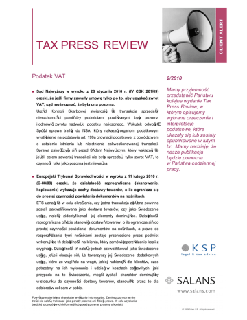 TAX PRESS REVIEW Podatek VAT n 2/2010 Sąd Najwyższy w wyroku z 28 stycznia 2010 r. (IV CSK 261/09) orzekł, że jeśli firmy zawarły umowę tylko po to, aby uzyskać zwrot VAT, sąd może uznać, że była ona pozorna. Urząd Kontroli nieruchomości Skarbowej pomiędzy stwierdził, podmiotami że transakcja powiązanymi była sprzedaży pozorna i odmówił zwrotu nadwyżki podatku naliczonego. Wskutek odwołań Spółki sprawa trafiła do NSA, który nakazał organom podatkowym wystąpienie na podstawie art. 199a ordynacji podatkowej z powództwem o ustalenie istnienia lub nieistnienia zakwestionowanej transakcji. Sprawa zakończyła się przed Sądem Najwyższym, który wskazał, że jeżeli celem zawartej transakcji nie była sprzedaż, tylko zwrot VAT, to czynność taka jako pozorna jest nieważna. n Europejski Trybunał Sprawiedliwości w wyroku z 11 lutego 2010 r. (C-88/09) orzekł, że działalność reprograficzna (skanowanie, kopiowanie) wykazuje cechy dostawy towarów, o ile ogranicza się do prostej czynności powielania dokumentów na nośnikach. ETS uznał, że w celu określenia, czy jedna transakcja złożona powinna zostać zakwalifikowana jako dostawa towarów, czy jako świadczenie usług, należy zidentyfikować jej elementy dominujące. Działalność reprograficzna będzie stanowiła dostawę towarów, o ile ogranicza się do prostej czynności powielania dokumentów na nośnikach, a prawo do rozporządzania tymi nośnikami zostaje przeniesione przez podmiot wykonujące tę działalność na klienta, który zamówił sporządzenie kopii z oryginału. Działalność tę należy jednak zakwalifikować jako świadczenie usług, jeżeli okazuje się, że towarzyszy jej świadczenie dodatkowych usług, które ze względu na wagę, jakiej nabierają dla klientów, czas potrzebny na ich wykonanie i udział w kosztach całkowitych, jaki przypada na te świadczenia, mogą zyskać charakter dominujący w stosunku do czynności dostawy towarów, stanowiąc przez to dla odbiorców cel sam w sobie. Powyższy materiał ma charekater wyłącznie informacyjny. Zamieszczonych w nim treści nie należy traktować jako porady prawnej ani źródła prawa. W celu uzyskania bardziej szczegółowych informacji lub porady prawnej prosimy o kontakt. Warsaw 5062026.1 Mamy przyjemność przedstawić Państwu kolejne wydanie Tax Press Review, w którym opisujemy wybrane orzeczenia i interpretacje podatkowe, które ukazały się lub zostały opublikowane w lutym br. Mamy nadzieję, że nasza publikacja będzie pomocna w Państwa codziennej pracy. n Europejski Trybunał Sprawiedliwości w wyroku z 19 listopada 2009 r. (C-461/08) orzekł, że dostawa działki ze starym budynkiem, który ma być rozebrany w celu wzniesienia na jego miejscu nowej konstrukcji i którego rozbiórka rozpoczęła się przed tą dostawą, nie jest objęta zwolnieniem z VAT. Spółka zakupiła działkę, na której stały dwa stare budynki. Sprzedający zobowiązał się do wykonania robót rozbiórkowych na własny koszt. Koszty tej rozbiórki zostały pokryte przez Spółkę przez podwyższenie ceny zakupu nieruchomości. Część prac została wykonana jeszcze przed sprzedażą nieruchomości. ETS stwierdził, że dostawa i rozbiórka są w tym wypadku dla celów VAT jednolitą transakcją mającą na celu dostawę niezabudowanej działki, niezależnie od stanu zaawansowania robót rozbiórkowych w momencie dostawy działki. Tym samym, sprzedaż takiej nieruchomości nie jest objęta zwolnieniem z VAT. n NSA w wyroku z 16 lutego 2010 r. (I FSK 2104/08) orzekł, że każdy przypadek, gdy przejęcie długu następuje w celu jego wyegzekwowania, podlega opodatkow aniu VAT. We wniosku o wydanie interpretacji indywidualnej, Spółka wyjaśniła, że ma zamiar nabyć na podstawie umowy przelewu wierzytelność za cenę niższą od wartości tej wierzytelności. Umowa przelewu wierzytelności miała być definitywna, a Spółka zamierzała dokonywać jej egzekucji we własnym imieniu i na swój rachunek. NSA uznał, że podatnik, który kupuje wierzytelność w celu jej wyegzekwowania świadczy usługę ściągania długu opodatkowaną 22% VAT, bez względu na fakt, że podatnik ściąga dług dla siebie, a nie dla zbywcy. Podatek CIT n NSA w wyroku z 21 stycznia 2010 r. (II FSK 1446/08) orzekł, że wydatki związane z powiększeniem kapitału zakładowego, takie jak podatek od czynności cywilnoprawnych, opłata sądowa, taksa notarialna, koszty wypisów aktów notarialnych oraz koszty poświadczenia podpisów, nie są kosztem uzyskania przychodu, ponieważ środki finansowe otrzymane bezpośrednio na utworzenie lub powiększenie kapitału zakładowego nie są przychodem podatkowym. W związku z podwyższeniem kapitału zakładowego i otrzymaniem majątku służącego do prowadzenia działalności gospodarczej, Spółka poniosła koszty z tytułu podatku od czynności cywilnoprawnych, opłat Powyższy materiał ma charekater wyłącznie informacyjny. Zamieszczonych w nim treści nie należy traktować jako porady prawnej ani źródła prawa. W celu uzyskania bardziej szczegółowych informacji lub porady prawnej prosimy o kontakt. Warsaw 5062026.1 sądowych i taksy notarialnej. We wniosku o wydanie interpretacji indywidualnej Spółka stwierdziła, że powyższe wydatki można zaliczyć do kosztów uzyskania przychodu w dacie ich poniesienia, ponieważ związane są z rozszerzeniem działalności gospodarczej. Organy podatkowe uznały jednak stanowisko Spółki za nieprawidłowe i stwierdziły, że wydatki te związane są z podwyższeniem kapitału zakładowego, a więc pozyskaniem przychodu, który nie jest zaliczany do przychodów podatkowych. Stanowisko organów podatkowych potwierdził NSA i wskazał, że skoro środki finansowe otrzymane na podwyższenie kapitału zakładowego nie są kwalifikowane jako przychody, to również wydatków poniesionych bezpośrednio na ten cel nie można uznać za koszty uzyskania prz
