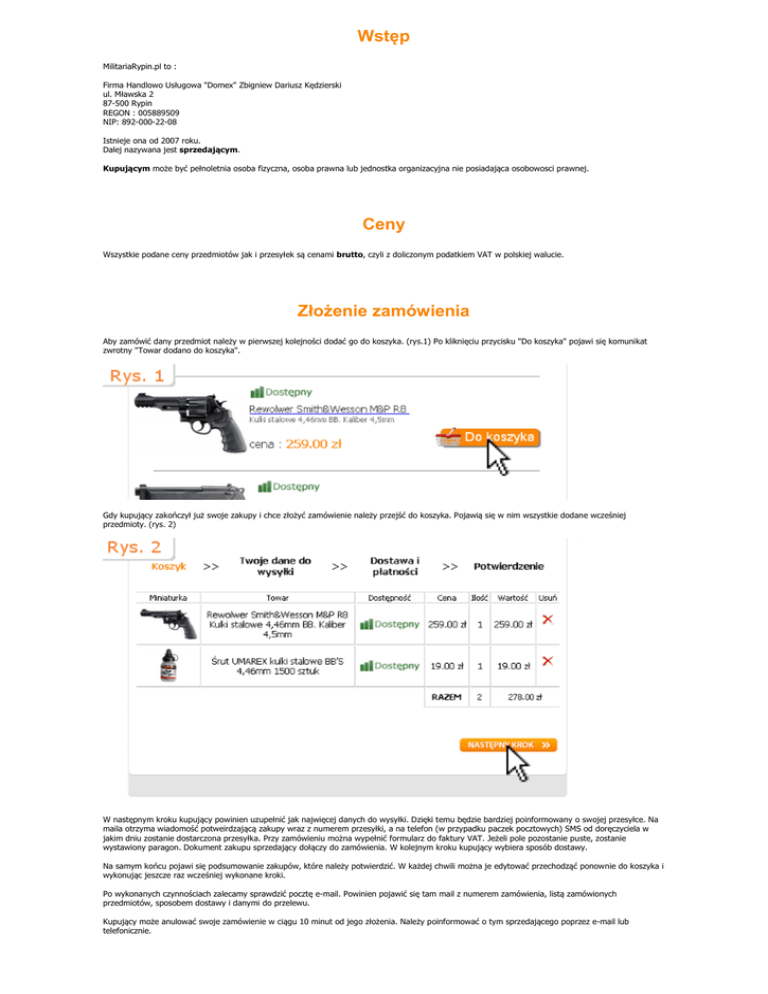Wstęp MilitariaRypin.pl to : Firma Handlowo Usługowa "Domex" Zbigniew Dariusz Kędzierski ul. Mławska 2 87-500 Rypin REGON : 005889509 NIP: 892-000-22-08 Istnieje ona od 2007 roku. Dalej nazywana jest sprzedającym. Kupującym może być pełnoletnia osoba fizyczna, osoba prawna lub jednostka organizacyjna nie posiadająca osobowosci prawnej. Ceny Wszystkie podane ceny przedmiotów jak i przesyłek są cenami brutto, czyli z doliczonym podatkiem VAT w polskiej walucie. Złożenie zamówienia Aby zamówić dany przedmiot należy w pierwszej kolejności dodać go do koszyka. (rys.1) Po kliknięciu przycisku "Do koszyka" pojawi się komunikat zwrotny "Towar dodano do koszyka". Gdy kupujący zakończył już swoje zakupy i chce złożyć zamówienie należy przejść do koszyka. Pojawią się w nim wszystkie dodane wcześniej przedmioty. (rys. 2) W następnym kroku kupujący powinien uzupełnić jak najwięcej danych do wysyłki. Dzięki temu będzie bardziej poinformowany o swojej przesyłce. Na maila otrzyma wiadomość potweirdzającą zakupy wraz z numerem przesyłki, a na telefon (w przypadku paczek pocztowych) SMS od doręczyciela w jakim dniu zostanie dostarczona przesyłka. Przy zamówieniu można wypełnić formularz do faktury VAT. Jeżeli pole pozostanie puste, zostanie wystawiony paragon. Dokument zakupu sprzedający dołączy do zamówienia. W kolejnym kroku kupujący wybiera sposób dostawy. Na samym końcu pojawi się podsumowanie zakupów, które należy potwierdzić. W każdej chwili można je edytować przechodząć ponownie do koszyka i wykonując jeszcze raz wcześniej wykonane kroki. Po wykonanych czynnościach zalecamy sprawdzić pocztę e-mail. Powinien pojawić się tam mail z numerem zamówienia, listą zamówionych przedmiotów, sposobem dostawy i danymi do przelewu. Kupujący może anulować swoje zamówienie w ciągu 10 minut od jego złożenia. Należy poinformować o tym sprzedającego poprzez e-mail lub telefonicznie. Formy płatności Za zakupy kupujący może zapłacić przelewem. Płatność tą należy wykonywać przy listach poleconych lub paczkach pocztowych. Dane do jego wykonania znajdują się w zakładce "kontakt" oraz zostaną one dołączone do wiadomości e-mail. W przypadku paczek pobraniowych opłata zostanie pobrana przez doręczyciela przy odbiorze. Realizacja zamówienia i dostawa Zamówienia na ogół są realizowane w ciągu 24h. Jeżeli czas ten miałby się przedłużyć, kupujący zostanie natychmiast o tym poinformowany. Podana zostanie również przyczyna opóźnienia. Realizacja zamówienia zostaje rozpoczęta w momencie zaksięgowania wpłaty na koncie. W przypadku paczek pobraniowych od momentu złożenia zamówienia. Paczki i listy wysyłamy pocztą polską. Wersje ekonomiczne realizowane są przez dostawcę przesyłki od 3 do 4 dni roboczych, zaś priorytetowe od 1 do 2 dni roboczych co się rzadko zdarza. Każdy przedmiot ma indywidualny cennik. Brane pod uwagę są gabaryty i masa przedmiotu. Przykład : Przedmiot Przedmiot Przedmiot Przedmiot a ma małą masę i gabaryty dzięki czemu można wysłać go w liście. b ma małą masę i duże gabaryty mieszczące się w wymogach listu c ma małą masę i duże gabaryty niemieszczące się w wymogach listu d ma małe gabaryty i dużą masę przekraczającą wymogi listu Jeżeli klient zamówił tylko Jeżeli klient zamówił tylko gabaryty przedmiotu. Jeżeli klient zamówił tylko Jeżeli klient zamówił tylko przedmiot a to przy zamówieniu pojawią się opcje wysyłki - listy i paczki. przedmiot b to przy zamówieniu pojawią się opcje wysyłki - listy i paczki, jednakże list będzie doroższy ze względu na przedmiot c to przy zamówieniu pojawią się opcje wysyłki - paczki przedmiot d to przy zamówieniu pojawią się opcje wysyłki - paczki Jeżeli klient zamówił przedmioty a i d to przy zamówieniu pojawią się opcje wysyłki - paczki Nasz system przy zamówieniu wybierze cennik największej paczki. Śrut można spakować do listu, lecz wiatrówka przekracza dozwolone gabaryty i masę. Wobec tego zostanie wybrany cennik dostawy wiatrówki. Niektóre przedmioty posiadają opcję darmowej wysyłki. Jeżeli kupicie Państwo kilka przedmiotów, a w koszyku znajdzie się przedmiot z darmową wysyłką to całe zamówienie zostanie dostarczone bezpłatnie. Wszystkie zamówienia wysyłamy tylko na terenie Polski. Gwarancja Sprzedający ponosi odpowiedzialność przez dwa lata od daty zakupu w przypadku niezgodności towaru z umową zgodnie z art.10 Ustawy o szczególnych warunkach sprzedaży konsumenckiej z 27 lipca 2002 roku i pozostałymi stosownymi przepisami prawa. W przypadku niezgodności towaru z umową, pismo określające niezgodność oraz oczekiwania dotyczące sposobu realizacji zobowązania, należy przesłać na adres sprzedającego wraz z dołączonym dowodem zakupu oraz kartą gwarancyjną. Pismo reklamacji towaru, który należy wypełnić i dołączyć do reklamowanego przedmiotu znajduje się w zakładce "Do pobrania". Zwrot W okresie dziesięciu dni od dostarczenia zamówionego towaru, Klient ma prawo do odstąpienia od umowy bez podania przyczyn, według ogólnych zasad wynikających z przepisów dotyczących zawierania umów na odległość. Zgodnie z ustawą zwrotowi nie podlegają produkty audialne i wizualne oraz zapisane na informatycznych nośnikach danych po usunięciu przez konsumenta ich oryginalnego opakowania. Sprzedający w ciągu 14 dni dokona zwrotu pieniędzy za zakupiony towar. Koszty odesłania towaru ponosi kupujący. Ochrona danych osobowych Sprzedający zobowiązuje się do ochrony danych osobowych zgodnie z ustawą o ochronie danych osobowych z 29.08.1997 r (Dz. U. Nr 133, poz. 883) oraz Ustawą o świadczeniu usług drogą elektroniczną (Dz. U. Nr 133, poz. 1204). Klient podając przy składaniu zamówienia swoje dane osobowe Sprzedającemu wyraża zgodę na ich przetwarzanie przez Sprzedającego w celu realizacji złożonego za