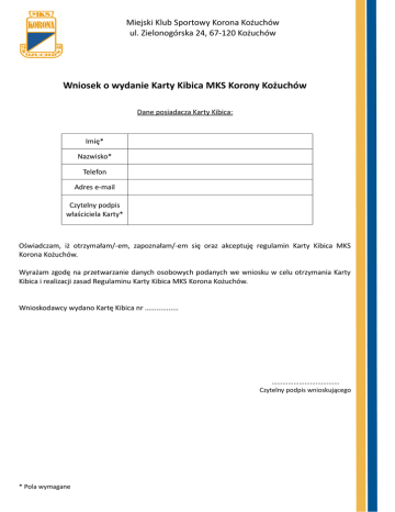 Miejski Klub Sportowy Korona Kożuchów ul. Zielonogórska 24, 67-120 Kożuchów Wniosek o wydanie Karty Kibica MKS Korony Kożuchów Dane posiadacza Karty Kibica: Imię* Nazwisko* Telefon Adres e-mail Czytelny podpis właściciela Karty* Oświadczam, iż otrzymałam/-em, zapoznałam/-em się oraz akceptuję regulamin Karty Kibica MKS Korona Kożuchów. Wyrażam zgodę na przetwarzanie danych osobowych podanych we wniosku w celu otrzymania Karty Kibica i realizacji zasad Regulaminu Karty Kibica MKS Korona Kożuchów. Wnioskodawcy wydano Kartę Kibica nr ….............. ….................................. Czytelny podpis wnioskującego * Pola wymagane