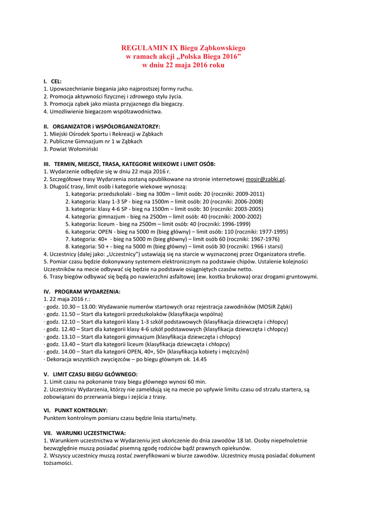 REGULAMIN IX Biegu Ząbkowskiego w ramach akcji „Polska Biega 2016” w dniu 22 maja 2016 roku I. CEL: 1. Upowszechnianie biegania jako najprostszej formy ruchu. 2. Promocja aktywności fizycznej i zdrowego stylu życia. 3. Promocja ząbek jako miasta przyjaznego dla biegaczy. 4. Umożliwienie biegaczom współzawodnictwa. II. ORGANIZATOR i WSPÓŁORGANIZATORZY: 1. Miejski Ośrodek Sportu i Rekreacji w Ząbkach 2. Publiczne Gimnazjum nr 1 w Ząbkach 3. Powiat Wołomioski III. TERMIN, MIEJSCE, TRASA, KATEGORIE WIEKOWE i LIMIT OSÓB: 1. Wydarzenie odbędzie się w dniu 22 maja 2016 r. 2. Szczegółowe trasy Wydarzenia zostaną opublikowane na stronie internetowej [email protected]. 3. Długośd trasy, limit osób i kategorie wiekowe wynoszą: 1. kategoria: przedszkolaki - bieg na 300m – limit osób: 20 (roczniki: 2009-2011) 2. kategoria: klasy 1-3 SP - bieg na 1500m – limit osób: 20 (roczniki: 2006-2008) 3. kategoria: klasy 4-6 SP - bieg na 1500m – limit osób: 30 (roczniki: 2003-2005) 4. kategoria: gimnazjum - bieg na 2500m – limit osób: 40 (roczniki: 2000-2002) 5. kategoria: liceum - bieg na 2500m – limit osób: 40 (roczniki: 1996-1999) 6. kategoria: OPEN - bieg na 5000 m (bieg główny) – limit osób: 110 (roczniki: 1977-1995) 7. kategoria: 40+ - bieg na 5000 m (bieg główny) – limit osób 60 (roczniki: 1967-1976) 8. kategoria: 50 + - bieg na 5000 m (bieg główny) – limit osób 30 (roczniki: 1966 i starsi) 4. Uczestnicy (dalej jako: „Uczestnicy”) ustawiają się na starcie w wyznaczonej przez Organizatora strefie. 5. Pomiar czasu będzie dokonywany systemem elektronicznym na podstawie chipów. Ustalenie kolejności Uczestników na mecie odbywad się będzie na podstawie osiągniętych czasów netto. 6. Trasy biegów odbywad się będą po nawierzchni asfaltowej (ew. kostka brukowa) oraz drogami gruntowymi. IV. PROGRAM WYDARZENIA: 1. 22 maja 2016 r.: · godz. 10.30 – 13.00: Wydawanie numerów startowych oraz rejestracja zawodników (MOSiR Ząbki) · godz. 11.50 – Start dla kategorii przedszkolaków (klasyfikacja wspólna) · godz. 12.10 – Start dla kategorii klasy 1-3 szkół podstawowych (klasyfikacja dziewczęta i chłopcy) · godz. 12.40 – Start dla kategorii klasy 4-6 szkół podstawowych (klasyfikacja dziewczęta i chłopcy) · godz. 13.10 – Start dla kategorii gimnazjum (klasyfikacja dziewczęta i chłopcy) · godz. 13.40 – Start dla kategorii liceum (klasyfikacja dziewczęta i chłopcy) · godz. 14.00 – Start dla kategorii OPEN, 40+, 50+ (klasyfikacja kobiety i mężczyźni) · Dekoracja wszystkich zwycięzców – po biegu głównym ok. 14.45 V. LIMIT CZASU BIEGU GŁÓWNEGO: 1. Limit czasu na pokonanie trasy biegu głównego wynosi 60 min. 2. Uczestnicy Wydarzenia, którzy nie zameldują się na mecie po upływie limitu czasu od strzału startera, są zobowiązani do przerwania biegu i zejścia z trasy. VI. PUNKT KONTROLNY: Punktem kontrolnym pomiaru czasu będzie linia startu/mety. VII. WARUNKI UCZESTNICTWA: 1. Warunkiem uczestnictwa w Wydarzeniu jest ukooczenie do dnia zawodów 18 lat. Osoby niepełnoletnie bezwzględnie muszą posiadad pisemną zgodę rodziców bądź prawnych opiekunów. 2. Wszyscy uczestnicy muszą zostad zweryfikowani w biurze zawodów. Uczestnicy muszą posiadad dokument tożsamości. 3. Warunkiem udziału w biegach jest własnoręczne złożenie podpisu pod oświadczeniem o zdolności do uczestnictwa w biegach na własną odpowiedzialnośd lub przedstawienie aktualnego zaświadczenia lekarskiego stwierdzającego brak przeciwwskazao do udziału w biegach. Podpisując deklarację uczestnictwa Uczestnik jednocześnie zaświadcza, że stan jego zdrowia umożliwia mu udział w biegu. 4. Uczestnicy biorą udział w zawodach na własną odpowiedzialnośd i w razie poniesienia uszczerbku na zdrowiu lub strat materialnych nie będą dochodzid roszczeo od organizatorów. 5. Uczestnicy biegów zobowiązani są zachowywad szczególną ostrożnośd i poruszad się zgodnie z przepisami ustawy Prawo o ruchu drogowym. 6. Podczas zawodów wszyscy uczestnicy muszą mied numery startowe przypięte do koszulek sportowych na piersiach. Zasłanianie numeru startowego w części lub w całości lub jego modyfikacja jest zabroniona pod karą dyskwalifikacji. 7. Uczestnicy biegów zobowiązani są bezwzględnego podporządkowania się służbom, łącznie z decyzją o przerwaniu biegu i zejściu z trasy. 8. Organizator zastrzega sobie prawo do zmiany niniejszego Regulaminu. VIII. ZGŁOSZENIE I REJESTRACJA DO WYDARZENIA: 1. Zgłoszenia do Wydarzenia przyjmowane są poprzez Formularz Rejestracyjny dostępny pod linkiem „Zapisy” znajdującym się na stronie www.protempo.pl/ix-bieg-zabkowski/, zawierający dane osobowe oraz kontaktowe. Zgłoszenia do Wydarzenia przyjmowane są indywidualnie. Organizator nie przewiduje innych klasyfikacji w biegu. Zgłoszenia do Wydarzenia przyjmowane są drogą elektroniczną na stronie www.protempo.pl/ix-bieg-zabkowski/ do godziny 20.00 dnia 20.05.2016 r. oraz w dniu biegu 22.05.2016 r. w godzinach 10.30 – 13.00, ale nie później niż na 60 minut przed rozpoczęciem biegu w danej kategorii wiekowej. 2. Po wypełnieniu Formularza Rejestracyjnego na podany adres e-mail zostanie wysłane potwierdzenie. Aby ukooczyd rejestrację, należy dokonad Opłaty Rejestracyjnej (zob. rozdział X ust. 1-2 Regulaminu). 3. Po dokonaniu Opłaty Rejestracyjnej status rejestracji można sprawdzid na stronie www.protempo.pl/ix-biegzabkowski/. 4. Zawodnicy zapisując się mają obowiązek wskazad wybraną przez siebie kategorię. Kategoria nie może byd niższa, niż wynika to z daty urodzenia. IX. OPŁATA REJESTRACYJNA ORAZ ODBIÓR PAKIETU STARTOWEGO: 1. Uczestnictwo w Wydarzeniu związane jest z obowiązkiem uiszczenia Opłaty Rejestracyjnej. Dotyczy to kategorii OPEN, 40+ i 50+. Osoby startujące w pozostałych kategoriach zwolnione są z Opłaty Rejestracyjnej. 2. Po dokonaniu Opłaty Rejestracyjnej jej zwrot nie jest mo