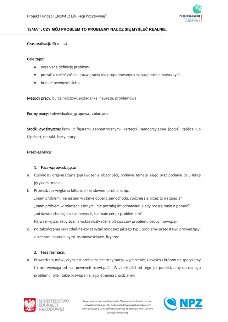 Projekt Fundacji „Instytut Edukacji Pozytywnej” TEMAT : CZY MÓJ PROBLEM TO PROBLEM? NAUCZ SIĘ MYŚLEĆ REALNIE. Czas realizacji: 45 minut Cele zajęć: • uczeń zna definicję problemu • potrafi określić źródła i rozwiązania dla proponowanych sytuacji problematycznych • buduje pewności siebie Metody pracy: burza mózgów, pogadanka, heureza, problemowa Formy pracy: indywidualna, grupowa, zbiorowa Środki dydaktyczne: kartki z figurami geometrycznymi, karteczki samoprzylepne (opcja), tablica lub flipchart, mazaki, karty pracy Przebieg lekcji: 1. Faza wprowadzająca: a. Czynności organizacyjne (sprawdzenie obecności, podanie tematu zajęć oraz podanie celu lekcji językiem ucznia). b. Prowadzący wygłasza kilka zdań ze słowem problem, np.: „mam problem, nie jestem w stanie odpalić samochodu, spóźnię się przez to na zajęcia” „mam problem w relacjach z innymi, nie potrafię im odmawiać, kiedy proszą mnie o pomoc” „od dawna chodzę do kosmetyczki, bo mam cerę z problemami” Najważniejsze, żeby zdania wskazywały różne płaszczyzny problemu osoby mówiącej. c. Po zakończeniu serii zdań należy zapytać młodzież jakiego typu problemy przedstawił prowadzący: z rzeczami materialnymi, osobowościowe, fizyczne. 2. Faza realizacji: a. Prowadzący mówi, czym jest problem: jest to sytuacja, wydarzenie, zjawisko z którym się spotykamy i które wymaga od nas pewnych rozwiązań. W zależności od tego jak podejdziemy do danego problemu, tyle i takie rozwiązania jego istnienia znajdziemy. Skrypt powstał w ramach projektu “Prowadzenie działań na rzecz upowszechniania wiedzy na temat zdrowia psychicznego i jego uwarunkowań (…)”współfinansowanego ze środków Ministerstwa Edukacji Narodowej. Projekt Fundacji „Instytut Edukacji Pozytywnej” "Problem albo problemat w znaczeniu potocznym lub naukowym oznacza przeszkodę, trudność, poważne zagadnienie, zadanie wymagające rozwiązania, sytuację wymagającą rozstrzygnięcia. Problem to nie rozwiązane zagadnienie, o którym często nie wiemy, z czego się składa, jak je zdefiniować i rozwiązać". (Penc, 1995) b. Prowadzący rysuje na tablicy lub przykleja wcześniej przygotowane kartki z figurami geometrycznymi. Wszystkie figury nie są poprowadzone jedną linią tylko składają się z kropek ułożonych w dane figury, np. Kartki z przygotowanymi kształtami (minimum 5) możemy też puścić w kółeczko jeśli w grupie jest mniej niż 10 osób (ze względu na czas obiegu kartek). Po zaprezentowaniu figur prowadzący prosi, by uczestnicy wypisali na karteczkach nazwy figur, jakie widzieli na demonstrowanych ilustracjach. Prowadzący analizuje odpowiedzi młodzieży zebrane na karteczkach, może zapisywać je na tablicy, po odczytaniu ostatniej z kartek pyta, czy wszyscy się z tym zgadzają? Po chwili milczenia pokazując na linię prowadzoną z kropek podkreśla, że na prezentowanych ilustracjach były tylko kropki (punkty), nie były narysowane żadne figury. Były to zbiory kropek ułożone w różny sposób, które schematycznie mogły nam przypominać dane figury. Takie postrzeganie powoduje, że nie możemy wyjść poza tzw. schemat myśli. Tak samo dzieje się z problemami, może one wcale nie są takie, jak nam się wydaje? c. Rozdajemy uczestnikom kartę pracy nr 3, na której mają połączyć w pary wyrazy z kolumn i dopisać, dlaczego mieli takie skojarzenie. d. Cykl zagadek. Zagadki na logiczne myślenie i wyjście poza schematyczne rozwiązywanie problemów są bardzo popularne i często pojawiają się w sieci. Przed przystąpieniem do ćwiczenia ustalamy z uczniami, ze jeśli ktoś zna treść, a tym samym odpowiedź na jaka zagadkę to nie zabiera głosu w dyskusji tylko pełni rolę obserwatora: Skrypt powstał w ramach projektu “Prowadzenie działań na rzecz upowszechniania wiedzy na temat zdrowia psychicznego i jego uwarunkowań (…)”współfinansowanego ze środków Ministerstwa Edukacji Narodowej. Projekt Fundacji „Instytut Edukacji Pozytywnej” Przykładowe zagadki: Kierowca fiata ma brata, lecz brat kierowcy fiata nie ma brata. Kim kierowca fiata jest dla brata? (siostrą) Dlaczego magowie arabscy, wędrujący na wielbłądach po pustyni, nosili szelki plecione z wielbłądziego włosia? (żeby im spodnie nie spadły) Ojciec i jego syn mieli wypadek samochodowy. Ojciec zmarł, a syna przewieziono karetką do szpitala. Gdy chirurg go zobaczył, krzyknął: "Nie mogę operować tego chłopca, on jest moim synem!". Jak to możliwe? (chirurg to matka) Dwoje ludzi zagrało pięć partii szachów i każdy z nich wygrał trzy razy. Wyjaśnij to! (nie musieli grać razem) Jaki znak należy postawić między cyframi 2 i 3, aby otrzymać w wyniku liczbę większą niż 2, a mniejszą niż 3? (2,3) Pewien człowiek mieszka na ostatnim piętrze bardzo wysokiego budynku. Każdego dnia idąc do pracy jedzie windą aż na parter, jednak wracając z pracy wyjeżdża windą tylko do pewnego piętra, a dalej idzie po schodach. Chyba, że jest zła pogoda - wtedy wyjeżdża windą na samą górę! Jak to możliwe? Człowiek jest bardzo niski, Normanie nie może dosięgnąć umieszczonego na samej górze przycisku ostatniego piętra, a gdy pada, to może to zrobić parasolem. 3. Faza podsumowująca: a. Prowadzący wraca do zagadnień postawionych we wprowadzeniu. Czym tak naprawdę jest problem i czy nie ma na niego sposobu? Należy podkreślić, że walkę z problemami może nam rozwiązać kreatywne myślenie i wychodzenie poza utarte schematy. b. Pożegnanie i podziękowanie za zajęcia. Skrypt powstał w ramach projektu “Prowadzenie działań na rzecz upowszechniania wiedzy na temat zdrowia psychicznego i jego uwarunkowań (…)”współfinansowanego ze środków Ministerstwa Edukacji Narodowej. Projekt Fundacji „Instytut Edukacji Pozytywnej” Karta pracy nr 3 Połącz w pracy wyrazy, które uważasz, że do siebie pasują: I II Jest jak ponieważ Kawa Dom