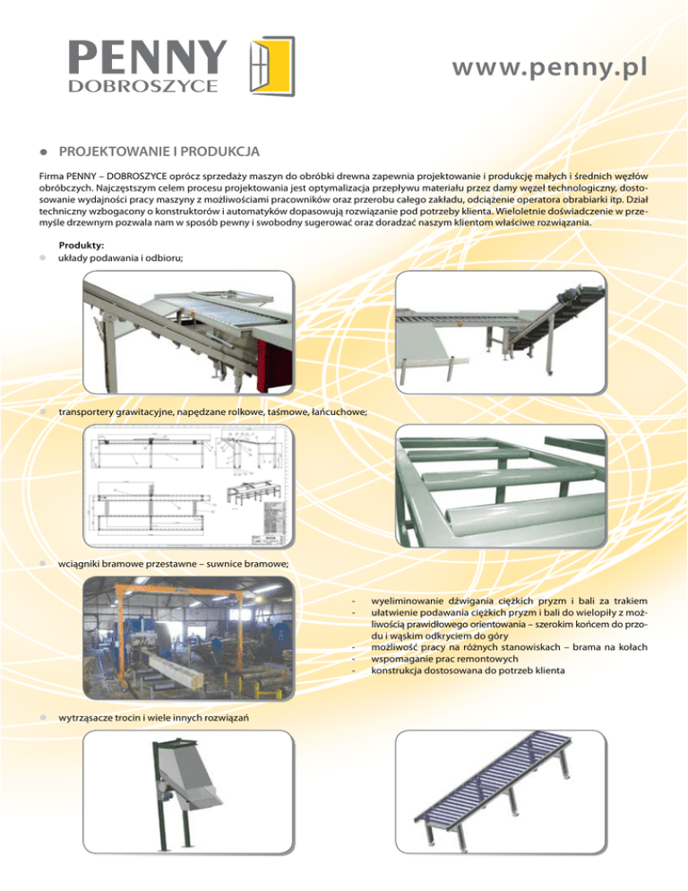 www.penny.pl lPROJEKTOWANIE I PRODUKCJA Firma PENNY – DOBROSZYCE oprócz sprzedaży maszyn do obróbki drewna zapewnia projektowanie i produkcję małych i średnich węzłów obróbczych. Najczęstszym celem procesu projektowania jest optymalizacja przepływu materiału przez damy węzeł technologiczny, dostosowanie wydajności pracy maszyny z możliwościami pracowników oraz przerobu całego zakładu, odciążenie operatora obrabiarki itp. Dział techniczny wzbogacony o konstruktorów i automatyków dopasowują rozwiązanie pod potrzeby klienta. Wieloletnie doświadczenie w przemyśle drzewnym pozwala nam w sposób pewny i swobodny sugerować oraz doradzać naszym klientom właściwe rozwiązania. l Produkty: układy podawania i odbioru; transportery grawitacyjne, napędzane rolkowe, taśmowe, łańcuchowe; l wciągniki bramowe przestawne – suwnice bramowe; l - - - - - wytrząsacze trocin i wiele innych rozwiązań l wyeliminowanie dźwigania ciężkich pryzm i bali za trakiem ułatwienie podawania ciężkich pryzm i bali do wielopiły z możliwością prawidłowego orientowania – szerokim końcem do przodu i wąskim odkryciem do góry możliwość pracy na różnych stanowiskach – brama na kołach wspomaganie prac remontowych konstrukcja dostosowana do potrzeb klienta www.penny.pl l CZĘŚCI ZAMIENNE I REMONTY MASZYN Nasza oferta skierowana jest dla tych klientów, którzy cenią swój czas i pieniądze. Oferujemy oryginalne części zamienne maszyn do obróbki drewna: części do wielopił i strugarek firmy TOS SVITAVY (wrzecienniki, gąsienice, prowadnice, koła łańcuchowe itp.) części do minitraków firmy NEVA (ślizgi, wałki, prowadzenia, przekładki, piłki itp.) części do maszyn firmy STÖERI MANTEL części do maszyn firmy KINEMATIC części do wariatorów TOS Znojmo (łańcuchy lamelowe, koła l l l l l stożkowe, obudowy łożysk itp.). Dostawa zamówionych części odbywa się bezpośrednio pod wskazany adres. Realizujemy dostawy na terenie całego kraju po przez firmy kurierskie lub Pocztę Polską. Oferujemy kilka możliwości uregulowania zapłaty za zamówione części. W przypadku wymiany części przez nasz serwis udzielamy 3 miesięcznej gwarancji na wykonane prace. Gdy chcesz zasięgnąć dokładniejszych informacji, to w każdej chwili możesz zadać nam pytanie. Jesteśmy również profesjonalnym wykonawcą remontów oferowanych maszyn do obróbki drewna oraz wariatorów. Oferujemy maszyny używane po remontach kapitalnych lub w stanie “z ostatniej chwili pracy”. Maszyny są zawsze weryfikowane technicznie i oceniane pod względem bhp. Potwierdzone jest to “deklaracją zgodności”. Zespoły serwisowe świadczą prace na rzecz maszyn - obrabiarek objętych gwarancją a także pogwarancyjne; wykonują również naprawy awaryjne. Zakresy remontu: bieżące, średnie, kapitalne. Zapewniamy przewozy maszyn wg uzgodnień z kontrahentem. Realizacje remontu wg ustaleń umownych i harmonogramu robót remontowych. PENNY-DOBROSZYCE Sp. z o.o. n ul. Trzebnicka 20, 56-410 Dobroszyce, tel.: +48 71 / 314 12 11, fax: +48 71 / 314 15 60, e-mail: [email protected] oddział w Gdańsku n ul. Szybowcowa 1, 80-298 Gdańsk, tel.: +48 58 / 348 12 01, fax: +48 58 / 348 12 13, e-mail: [email protected]