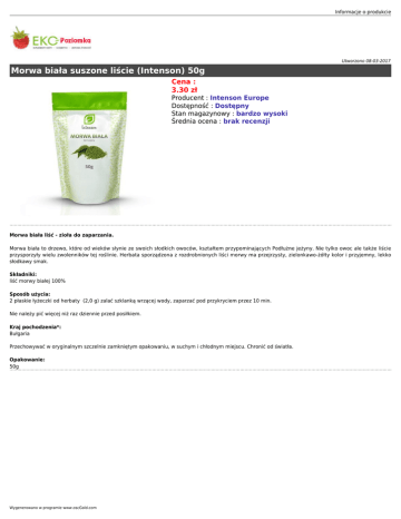 Informacje o produkcie Utworzono 08-03-2017 Morwa biała suszone liście (Intenson) 50g Cena : 3.30 zł Producent : Intenson Europe Dostępność : Dostępny Stan magazynowy : bardzo wysoki Średnia ocena : brak recenzji Morwa biała liść - zioła do zaparzania. Morwa biała to drzewo, które od wieków słynie ze swoich słodkich owoców, kształtem przypominających Podłużne jeżyny. Nie tylko owoc ale także liście przysporzyły wielu zwolenników tej roślinie. Herbata sporządzona z rozdrobnionych liści morwy ma przejrzysty, zielonkawo-żółty kolor i przyjemny, lekko słodkawy smak. Składniki: liść morwy białej 100% Sposób użycia: 2 płaskie łyżeczki od herbaty (2,0 g) zalać szklanką wrzącej wody, zaparzać pod przykryciem przez 10 min. Nie należy pić więcej niż raz dziennie przed posiłkiem. Kraj pochodzenia*: Bułgaria Przechowywać w oryginalnym szczelnie zamkniętym opakowaniu, w suchym i chłodnym miejscu. Chronić od światła. Opakowanie: 50g Wygenerowano w programie www.oscGold.com