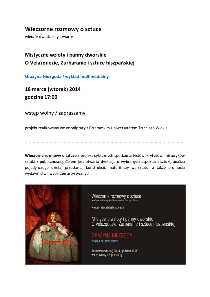 Wieczorne rozmowy o sztuce wieczór dwudziesty czwarty Mistyczne wzloty i panny dworskie O Velazquezie, Zurbaranie i sztuce hiszpańskiej Grażyna Niezgoda / wykład multimedialny 18 marca (wtorek) 2014 godzina 17:00 wstęp wolny / zapraszamy projekt realizowany we współpracy z Przemyskim Uniwersytetem Trzeciego Wieku …………………………………………………………………………………………………………… Wieczorne rozmowy o sztuce / projekt cyklicznych spotkań artystów, krytyków i historyków sztuki z publicznością. Celem jest otwarta dyskusja o wybranych aspektach sztuki, analiza pojedynczego dzieła, przesłania, konstrukcji, materii czy warsztatu, a także promocja wydawnictw i wydarzeń artystycznych. Grażyna Niezgoda / fotografka, antykwariuszka, galerzystka, krytyczka sztuki, rzeczoznawczyni Ministra Kultury w specjalizacji: ocena i wycena dzieła sztuki; biegła sądowa z zakresu sztuki i antyków. Zorganizowała 22 wystawy indywidualne fotografii. W 2007 roku odbyła się wystawa "Twarze między wierszami, książki ilustrowane fotografiami Grażyny Niezgody". W roku 2010 wraz z Kazimierzem Wiśniakiem opublikowała album "Narodziny obrazu". Jej prace prezentowano m.in. w albumach "Sztuka fotografii", "Fotografowie", "Mistrzowie polskiego pejzażu".