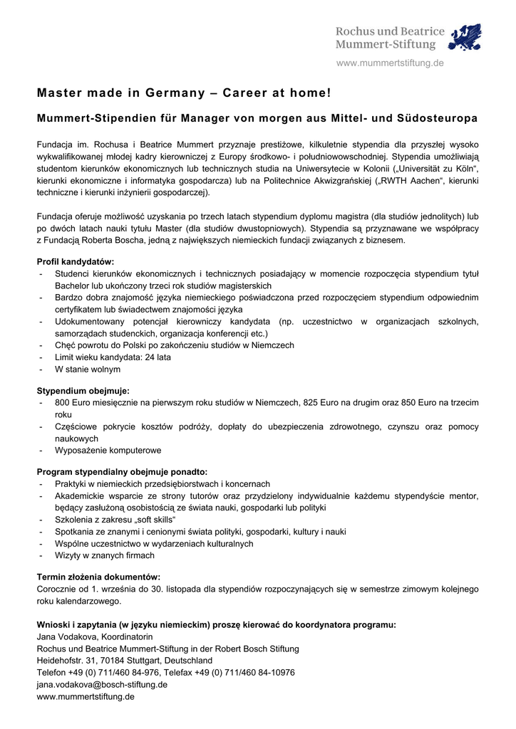 www.mummertstiftung.de Master made in German y – Career at home! Mummert-Stipendien für Manager von morgen aus Mittel- und Südosteuropa Fundacja im. Rochusa i Beatrice Mummert przyznaje prestiżowe, kilkuletnie stypendia dla przyszłej wysoko wykwalifikowanej młodej kadry kierowniczej z Europy środkowo- i południowowschodniej. Stypendia umożliwiają studentom kierunków ekonomicznych lub technicznych studia na Uniwersytecie w Kolonii („Universität zu Köln“, kierunki ekonomiczne i informatyka gospodarcza) lub na Politechnice Akwizgrańskiej („RWTH Aachen“, kierunki techniczne i kierunki inżynierii gospodarczej). Fundacja oferuje możliwość uzyskania po trzech latach stypendium dyplomu magistra (dla studiów jednolitych) lub po dwóch latach nauki tytułu Master (dla studiów dwustopniowych). Stypendia są przyznawane we współpracy z Fundacją Roberta Boscha, jedną z największych niemieckich fundacji związanych z biznesem. Profil kandydatów: - Studenci kierunków ekonomicznych i technicznych posiadający w momencie rozpoczęcia stypendium tytuł Bachelor lub ukończony trzeci rok studiów magisterskich - Bardzo dobra znajomość języka niemieckiego poświadczona przed rozpoczęciem stypendium odpowiednim certyfikatem lub świadectwem znajomości języka - Udokumentowany potencjał kierowniczy kandydata (np. uczestnictwo w organizacjach szkolnych, samorządach studenckich, organizacja konferencji etc.) - Chęć powrotu do Polski po zakończeniu studiów w Niemczech - Limit wieku kandydata: 24 lata - W stanie wolnym Stypendium obejmuje: - 800 Euro miesięcznie na pierwszym roku studiów w Niemczech, 825 Euro na drugim oraz 850 Euro na trzecim roku - Częściowe pokrycie kosztów podróży, dopłaty do ubezpieczenia zdrowotnego, czynszu oraz pomocy naukowych - Wyposażenie komputerowe Program stypendialny obejmuje ponadto: - Praktyki w niemieckich przedsiębiorstwach i koncernach - Akademickie wsparcie ze strony tutorów oraz przydzielony indywidualnie każdemu stypendyście mentor, będący zasłużoną osobistością ze świata nauki, gospodarki lub polityki - Szkolenia z zakresu „soft skills“ - Spotkania ze znanymi i cenionymi świata polityki, gospodarki, kultury i nauki - Wspólne uczestnictwo w wydarzeniach kulturalnych - Wizyty w znanych firmach Termin złożenia dokumentów: Corocznie od 1. września do 30. listopada dla stypendiów rozpoczynających się w semestrze zimowym kolejnego roku kalendarzowego. Wnioski i zapytania (w języku niemieckim) proszę kierować do koordynatora programu: Jana Vodakova, Koordinatorin Rochus und Beatrice Mummert-Stiftung in der Robert Bosch Stiftung Heidehofstr. 31, 70184 Stuttgart, Deutschland Telefon +49 (0) 711/460 84-976, Telefax +49 (0) 711/460 84-10976 [email protected] www.mummertstiftung.de