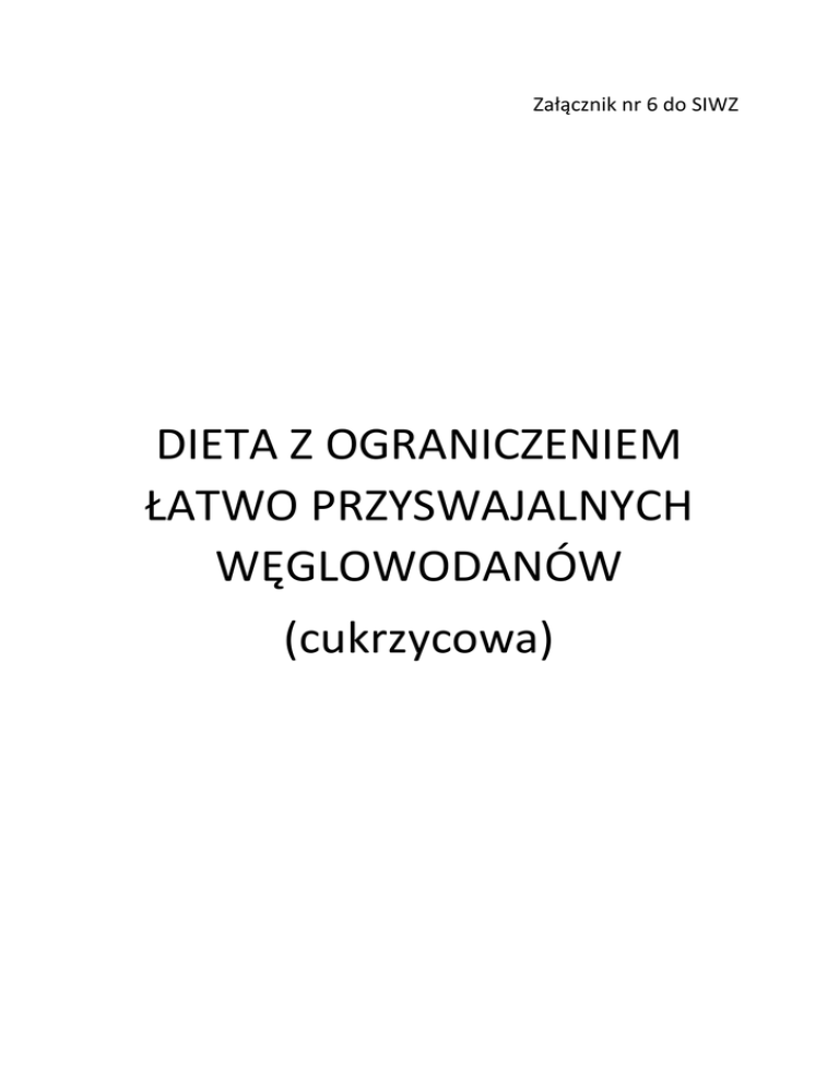 Załącznik nr 6 do SIWZ DIETA Z OGRANICZENIEM ŁATWO PRZYSWAJALNYCH WĘGLOWODANÓW (cukrzycowa) Dzień Posiłek Składniki Makaron na mleku Chleb razowy Śniadanie Masło śmietankowe 26,8% Szynka kanapkowa Papryka czerwona Herbata napar bez cukru II Kisiel waniliowy bez śniadanie dodatku cukru 8,7% Zupa ryżowa zabielana Ziemniaki, z tłuszczem roślinnym Bitki wołowe w Obiad jarzynach, duszone Poniedziałek 36,6% Surówka z kwaszonych 2073,1 kcal ogórków Kompot owocowy bez cukru Chleb razowy Masło śmietankowe Kolacja Cykoria 19,0% Ogórek Szynka z piersi kurczaka Herbata napar bez cukru Chleb razowy Posiłek Masło śmietankowe przed Pasta z sera snem twarogowego 8,7% Pomidor Chleb razowy Masło śmietankowe Śniadanie Ser twarogowy chudy 26,5% Rzodkiewka Wtorek Kawa INKA na mleku 204,8 kcal 1,5% tłuszczu II Grejpfrut zielony śniadanie Napój mleczny jogurtowy Waga (g) 300 80 10 30 60 250 150 Miary gospodarcze 1 talerz 2 kromki 2 łyżeczki 3 plastry ¼ małej 1 szklanka Średnia porcja 400 250 1 talerz ½ płaskiego talerza 1 bitka (80 g)+ warzywa (70 g) 1 średnia porcja 150 100 200 120 15 30 80 30 250 40 5 60 niepełna szklanka 3 kromki 3 łyżeczki ½ małej 1 średni 3 plastry 1 szklanka 1 kromka 1 łyżeczka 4 łyżki 15 80 10 70 50 250 1 plaster 2 kromki 2 łyżeczki 3 plastry 2 duże 1 szklanka 175 200 ½ małego Niepełna 10,1% Środa 2181,1 kcal Zupa jarzynowa zabielana Makaron z serem Obiad twarogowym chudym i 31,6% masłem Kompot z owoców bez cukru Chleb razowy Kolacja Masło śmietankowe 22,4% Pasta z ryby gotowanej Szczypiorek Posiłek Chleb razowy przed Masło śmietankowe snem Sałatka z pomidora z 9,2% jogurtem naturalnym Płatki owsiane na mleku 1,5% Chleb razowy Śniadanie Masło śmietankowe 26,4% Kiełbasa kanapkowa z kurczaka Ogórek Herbata napar bez cukru II Herbatniki śniadanie Serek twarogowy, 9,7% homogenizowany, chudy Krupnik z kaszy gryczanej Ziemniaki z tłuszczem roślinnym Surówka z kwaszonej Obiad kapusty 38,2% Gulasz drobiowy, duszony Kompot z owoców bez cukru Chleb razowy Kolacja Masło śmietankowe 19,6% Serek termizowany naturalny, półtłusty 400 szklanka 1 talerz 300 niepełny talerz 200 niepełna szklanka 3 kromki 3 łyżeczki 5 łyżek 2 łyżki 1 kromka 1 łyżeczka 4 łyżki 120 15 60 12 40 5 100 300 Niepełny talerz 80 10 40 2 kromki 2 łyżeczki 4 plastry 80 1 średni 1 szklanka 6 małych 5 łyżek 30 50 400 200 120 1 talerz ½ płaskiego talerza Średnia porcja 130 Średnia porcja 200 120 15 niepełna szklanka 3 kromki 3 łyżeczki 60 4 łyżki Czwartek 1984,8 kcal Piątek 1894,3 kcal Pomidor Herbata napar bez cukru Posiłek Chleb razowy przed Masło śmietankowe snem Szynka z indyka 5,8% Sałata Kasza manna na mleku 1,5% Chleb razowy Śniadanie Masło śmietankowe 28,5% Szynka wieprzowa, gotowana Ogórek Herbata, napar bez cukru II Biszkopty śniadanie Jogurt naturalny, 2% 8,2% tłuszczu Barszcz czerwony zabielany Kasza gryczana na sypko Obiad z tłuszczem roślinnym 35,8% Potrawka z kurczaka Surówka z marchwi Kompot z owoców bez cukru Chleb razowy Masło śmietankowe Kolacja Szynka z piersi kurczaka 19,7% Pomidor Szczypiorek Herbata napar bez cukru Posiłek Chleb razowy przed Masło śmietankowe snem Ser twarogowy chudy 7,5% Rzodkiewka Chleb razowy Masło śmietankowe Śniadanie Pasta z sera 24,0% twarogowego Pomidor 50 250 40 5 10 10 300 1 mały 1 szklanka 1 kromka 1 łyżeczka 1 plaster 1 liść 1 talerz 80 10 40 2 kromki 2 łyżeczki 4 plastry 80 250 20 150 400 1 średni 1 szklanka 6 małych Małe opakowanie 1 talerz 200 1 talerz 120 70 200 120 15 30 50 12 250 40 5 30 25 80 10 Średnia porcja mała porcja niepełna szklanka 3 kromki 3 łyżeczki 3 plasterki 1 mały 2 łyżki 1 szklanka 1 kromka 1 łyżeczka 1 plaster 1 duża 2 kromki 2 łyżeczki 60 50 4 łyżki 3 plastry Kawa INKA na mleku 1,5 % tłuszczu Jabłka pieczone 250 1 szklanka 150 1 średnie Zupa pomidorowa zabielana Ryż na sypko z tłuszczem roślinnym Szpinak, gotowany Dorsz w jarzynach Kompot z owoców bez cukru Chleb razowy Masło śmietankowe Serek twarogowy, ziarnisty Rzodkiewka Herbata napar bez cukru Chleb razowy Masło śmietankowe Papryka czerwona 400 1 talerz 170 ½ talerza 100 150 205 120 15 150 1 porcja Średnia porcja niepełna szklanka 3 kromki 3 łyżeczki 7 ½ łyżki 50 250 40 5 60 2 duże 1 szklanka 1 kromka 1 łyżeczka ¼ małej Ryż na mleku 1,5% Chleb razowy Masło śmietankowe Śniadanie Polędwica sopocka 27,9% Ogórek kwaszony Kawa INKA na mleku 1,5% tłuszczu Herbata napar bez cukru II Herbatniki bezcukrowe śniadanie 5,9% 300 80 10 30 80 250 1 talerz 2kromki 2 łyżeczki 3 plastry 1 średni 1 szklanka 250 30 1 szklanka 6 małych Zupa ogórkowa Ziemniaki, z tłuszczem roślinnym Kotlety z kurczaka saute, duszone Sałata z jogurtem 400 250 1 talerz ½ talerza 100 100 Średnia porcja duża porcja II śniadanie 7,3% Obiad 34,6% Kolacja 26,9% Posiłek przed snem 6,9% Sobota 2220,1 kcal Obiad 35,6% Niedziela 2125,7% Kompot z owoców bez cukru Chleb razowy Masło śmietankowe Kolacja Szynka kanapkowa 20,7% Surówka z pomidorów Herbata napar bez cukru Chleb razowy Posiłek Masło śmietankowe przed Szynka wołowa, snem gotowana 9,7% Rzodkiewka Kasza jęczmienna na mleku Chleb razowy Śniadanie Masło śmietankowe 23,7% Szynka z piersi kurczaka Papryka czerwona Herbata napar bez cukru II Grejpfrut zielony śniadanie Napój mleczny jogurtowy 9,6% Rosół z makaronem Ziemniaki z tłuszczem roślinnym Klopsiki mielone z mięsa Obiad mieszanego, duszone 39,2% Mizeria z jogurtem naturalnym Kompot z owoców bez cukru Chleb razowy Masło śmietankowe Kolacja Ser twarogowy chudy 20,2% Ogórek Herbata napar bez cukru Posiłek Chleb razowy przed Masło śmietankowe snem Pasta z twarogu i ryby 7,1% Szczypiorek 200 120 15 30 125 250 80 5 10 niepełna szklanka 3 kromki 3 łyżeczki 3 plastry Średnia porcja 1 szklanka 1 kromka 1 łyżeczka 1 plaster 25 300 1 duża 1 talerz 80 10 30 60 250 175 200 400 250 2 kromki 2 łyżeczki 3 plastry ¼ małej 1 szk