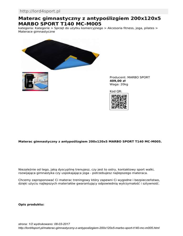 http://lord4sport.pl Materac gimnastyczny z antypoślizgiem 200x120x5 MARBO SPORT T140 MC-M005 kategoria: Kategorie > Sprzęt do użytku komercyjnego > Akcesoria fitness, joga, pilates > Materace gimnastyczne Producent: MARBO SPORT 409,00 zł Waga: 20kg Kod QR: Materac gimnastyczny z antypoślizgiem 200x120x5 MARBO SPORT T140 MC-M005. Niezależnie od tego, jaką dyscyplinę trenujesz, czy jest to ostry, kontaktowy sport walki, rozwijająca gimnastyka czy uspokajająca joga - potrzebujesz najlepszego materaca. Chcemy zaproponować Ci materac treningowy który zapewni Ci wygodne i bezpieczeństwo, dzięki użyciu najlepszych materiałów gwarantujący odpowiednią wytrzymałość i sztywność. Opis produktu: strona: 1/2 wydrukowano: 08-03-2017 http://lord4sport.pl/materac-gimnastyczny-z-antyposlizgiem-200x120x5-marbo-sport-t140-mc-m005.html Wymiary: 200 x 120 x 10 cm Materiał: plawil wzmocniony Antypoślizg: warstwa lateksowa Nici: rdzeniowe Coats Epic Suwak: gr. 8 milimetrów Pianka: wtórnie spieniana Sztywność pianki: t 140 Dodatkowe informacje: Towar na zamówienie - przed zakupem prosimy o kontakt Koszt transportu i montażu ustalamy indywidualnie Czas realizacji 21 dni roboczych Gwarancja 24 miesiące Nie znalazłeś produktu który Cię interesuje ? Skontaktuj się z nami tel. 32-270-77-22 - postaramy się rozwiązać ten problem strona: 2/2 wydrukowano: 08-03-2017 http://lord4sport.pl/materac-gimnastyczny-z-antyposlizgiem-200x120x5-marbo-sport-t140-mc-m005.html