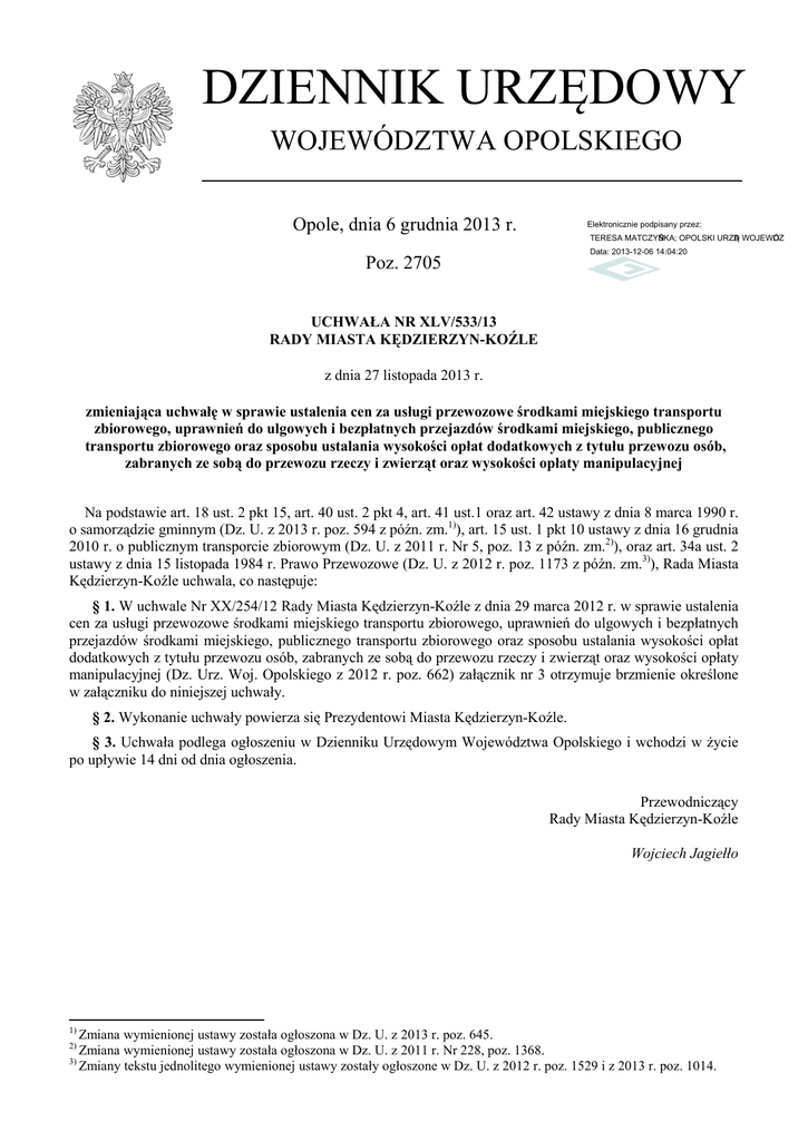 DZIENNIK URZĘDOWY WOJEWÓDZTWA OPOLSKIEGO Opole, dnia 6 grudnia 2013 r. Elektronicznie podpisany przez: TERESA MATCZYŃSKA; OPOLSKI URZĄD WOJEWÓDZKI Data: 2013-12-06 14:04:20 Poz. 2705 UCHWAŁA NR XLV/533/13 RADY MIASTA KĘDZIERZYN-KOŹLE z dnia 27 listopada 2013 r. zmieniająca uchwałę w sprawie ustalenia cen za usługi przewozowe środkami miejskiego transportu zbiorowego, uprawnień do ulgowych i bezpłatnych przejazdów środkami miejskiego, publicznego transportu zbiorowego oraz sposobu ustalania wysokości opłat dodatkowych z tytułu przewozu osób, zabranych ze sobą do przewozu rzeczy i zwierząt oraz wysokości opłaty manipulacyjnej Na podstawie art. 18 ust. 2 pkt 15, art. 40 ust. 2 pkt 4, art. 41 ust.1 oraz art. 42 ustawy z dnia 8 marca 1990 r. o samorządzie gminnym (Dz. U. z 2013 r. poz. 594 z późn. zm.1)), art. 15 ust. 1 pkt 10 ustawy z dnia 16 grudnia 2010 r. o publicznym transporcie zbiorowym (Dz. U. z 2011 r. Nr 5, poz. 13 z późn. zm.2)), oraz art. 34a ust. 2 ustawy z dnia 15 listopada 1984 r. Prawo Przewozowe (Dz. U. z 2012 r. poz. 1173 z późn. zm.3)), Rada Miasta Kędzierzyn-Koźle uchwala, co następuje: § 1. W uchwale Nr XX/254/12 Rady Miasta Kędzierzyn-Koźle z dnia 29 marca 2012 r. w sprawie ustalenia cen za usługi przewozowe środkami miejskiego transportu zbiorowego, uprawnień do ulgowych i bezpłatnych przejazdów środkami miejskiego, publicznego transportu zbiorowego oraz sposobu ustalania wysokości opłat dodatkowych z tytułu przewozu osób, zabranych ze sobą do przewozu rzeczy i zwierząt oraz wysokości opłaty manipulacyjnej (Dz. Urz. Woj. Opolskiego z 2012 r. poz. 662) załącznik nr 3 otrzymuje brzmienie określone w załączniku do niniejszej uchwały. § 2. Wykonanie uchwały powierza się Prezydentowi Miasta Kędzierzyn-Koźle. § 3. Uchwała podlega ogłoszeniu w Dzienniku Urzędowym Województwa Opolskiego i wchodzi w życie po upływie 14 dni od dnia ogłoszenia. Przewodniczący Rady Miasta Kędzierzyn-Koźle Wojciech Jagiełło 1) Zmiana wymienionej ustawy została ogłoszona w Dz. U. z 2013 r. poz. 645. Zmiana wymienionej ustawy została ogłoszona w Dz. U. z 2011 r. Nr 228, poz. 1368. 3) Zmiany tekstu jednolitego wymienionej ustawy zostały ogłoszone w Dz. U. z 2012 r. poz. 1529 i z 2013 r. poz. 1014. 2) Dziennik Urzędowy Województwa Opolskiego –2– Poz. 2705 Załącznik do Uchwały Nr XLV/533/13 Rady Miasta Kędzierzyn-Koźle z dnia 27 listopada 2013 r. Uprawnienia gminne do przejazdów bezpłatnych środkami lokalnego transportu zbiorowego w granicach administracyjnych Miasta Kędzierzyn-Koźle Lp. 1. 2. Osoby uprawnione do przejazdów bezpłatnych Dzieci w wieku do 3 lat Osoby, które ukończyły 70 rok życia Podstawa uprawnienia, dokument poświadczający uprawnienie Oświadczenie opiekuna lub dokument stwierdzający wiek dziecka Dokument potwierdzający wiek i tożsamość, a w przypadku obywateli państw członkowskich Unii Europejskiej – odpowiedni dokument wystawiony przez uprawniony organ 3. Osoby całkowicie niezdolne do pracy i samodzielnej egzystencji (dawna I grupa inwalidzka) oraz osoby o znacznym stopniu niepełnosprawności wraz z opiekunem towarzyszącym im w pojeździe Wypis z orzeczenia właściwej komisji lekarskiej do spraw inwalidztwa i zatrudnienia, stwierdzający zaliczenie do I grupy inwalidzkiej, wypis z orzeczenia lekarza orzecznika ZUS (rzeczoznawcy KRUS) stwierdzającego całkowitą niezdolność do pracy i samodzielnej egzystencji, wypis z orzeczenia właściwego organu stwierdzający znaczny stopień niepełnosprawności, zaświadczenie ZUS stwierdzające zaliczenie wyrokiem sądu do I grupy inwalidzkiej bądź uznanie w tym samym trybie niezdolności do samodzielnej egzystencji, względnie legitymacje: rencisty wojskowego, Polskiego Związku Niewidomych, Związku Ociemniałych Żołnierzy Rzeczypospolitej Polskiej, lub osoby niepełnosprawnej – wystawione przez uprawniony organ, zawierające adnotacje o zaliczeniu do I grupy inwalidzkiej, uznaniu niezdolności do samodzielnej egzystencji lub zaliczeniu do znacznego stopnia niepełnosprawności, a w przypadku obywateli państw członkowskich Unii Europejskiej – odpowiedni dokument wystawiony przez uprawniony organ. W przypadku widocznego inwalidztwa lub niepełnosprawności nie jest wymagane posiadanie i okazywanie przez osobę uprawnioną dokumentów poświadczających uprawnienie do korzystania z przejazdów na warunkach określonych w niniejszej uchwale. 4. Osoby niewidome, ociemniałe oraz niedowidzące, wraz z opiekunem towarzyszącym im w pojeździe lub psem przewodnikiem Wypis z orzeczenia właściwej komisji lekarskiej do spraw inwalidztwa i zatrudnienia, wypis z orzeczenia lekarza orzecznika ZUS, legitymacje:, Związku Ociemniałych Żołnierzy Rzeczypospolitej Polskiej, Polskiego Związku Niewidomych a w przypadku obywateli państw członkowskich Unii Europejskiej - odpowiedni dokument wystawiony przez uprawniony organ. W przypadku widocznego inwalidztwa lub niepełnosprawności nie jest wymagane posiadanie i okazywanie przez osobę uprawnioną dokumentów poświadczających uprawnienie do korzystania z przejazdów na warunkach określonych w niniejszej uchwale. Dziennik Urzędowy Województwa Opolskiego –3– Poz. 2705 5. Osoby głuche i głuchonieme Wypis z orzeczenia właściwej komisji lekarskiej do spraw inwalidztwa i zatrudnienia, wypis z orzeczenia lekarza orzecznika ZUS, legitymacje: Polskiego Związku Głuchych, a w przypadku obywateli państw członkowskich Unii Europejskiej - odpowiedni dokument wystawiony przez uprawniony organ. 6. Osoby niepełnosprawne, inne niż wymienione w pkt 3, 4 i 5 uczęszczające do dziennych ośrodków rehabilitacyjnych lub ośrodków terapii zajęciowej z tym, że uprawnienie obejmuje wyłącznie przejazd na odcinku linii autobusowej od miejsca zamieszkania lub pobytu do ośrodka i z powrotem Wypis z orzeczenia komisji lekarskiej do spraw inwalidztwa i zatrudnienia, stwierdzający 