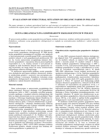 Jan KUŚ, Krzysztof JOŃCZYK Instytut Uprawy NawoŜenia i Gleboznawstwa - Państwowy Instytut Badawczy w Puławach Zakład Systemów i Ekonomiki Produkcji Roślinnej e-mail: [email protected] EVALUATION OF STRUCTURAL SITUATION OF ORGANIC FARMS IN POLAND Summary The paper attempts to evaluate agricultural land use and structure of cropland in organic farms. The additional analysis evaluated the organic farms with regard to habitat conditions and the quote of protected areas. OCENA ORGANIZACYJNA GOSPODARSTW EKOLOGICZNYCH W POLSCE Streszczenie W opracowaniu poddano ocenie gospodarstwa pod kątem struktury obszarowej, struktury uŜytkowania gruntów i zasiewów. Dodatkowo wykonano ocenę gospodarstw ekologicznych ze względu na uwarunkowania siedliskowe i udział obszarów chronionych. Wprowadzenie Omówienie wyników W ostatnich latach w Polsce obserwuje się dynamiczny wzrost liczby gospodarstw ekologicznych. W 2006 łączna liczba gospodarstw posiadających certyfikat oraz będących w fazie przestawiania wynosiła ponad 9100, a powierzchnia uŜytków rolnych w tych gospodarstwach przekroczyła 220 tys. ha. Liczne opracowania uwzględniają mniejsze zbiorowości gospodarstw i najczęściej dotyczą poszczególnych województw [2, 3, 4]. Analizy zawarte w tych pracach ze względu na małe liczebności danych oraz ograniczony zasięg terytorialny nie mogą słuŜyć do oceny zróŜnicowania regionalnego rolnictwa ekologicznego. W niniejszym opracowaniu poddano ocenie gospodarstwa ekologiczne pod kątem struktury obszarowej, struktury uŜytkowania gruntów i zasiewów oraz powiązania produkcji roślinnej i zwierzęcej. Dodatkowo wykonano ocenę gospodarstw ekologicznych ze względu na uwarunkowania siedliskowe i udział obszarów chronionych. Charakterystyka organizacyjna gospodarstw ekologicznych W roku 2005 systemem kontroli rolnictwa ekologicznego objętych było 7183 gospodarstwa, które posiadały 167 tys. ha uŜytków rolnych, co stanowi 0,4% ogółu gospodarstw i niewiele ponad 1% uŜytków rolnych w Polsce. Średnia wielkość gospodarstwa ekologicznego w 2005 r. wynosiła 27,6 ha, czyli przewyŜszała ponad 3-krotnie areał średniego gospodarstwa w kraju, a prawidłowość ta występuje we wszystkich województwach (tab.1). W latach 2001-2005 odnotowano wzrost średniej powierzchni gospodarstwa ekologicznego o 2,6 ha. Najwięcej gospodarstw zlokalizowanych jest w województwach: małopolskim, podkarpackim, świętokrzyskim, mazowieckim i lubelskim. Stanową one łącznie około 62% ogółu gospodarstw ekologicznych w Polsce. W rejonach tych funkcjonują jednak mniejsze obszarowo gospodarstwa, z których od 50 do 80% w zaleŜności od województwa nie przekracza 10 ha, a w województwie małopolskim ponad 50% gospodarstw ekologicznych posiada poniŜej 5 ha UR. Większe obszarowo gospodarstwa ekologiczne, bo o powierzchni 20-50 ha UR dominują w Polsce zachodniej (zachodniopomorskie, wielkopolskie, lubuskie). W rejonie tym zlokalizowane są ponadto największe gospodarstwa, których powierzchnia przekracza 100 ha, a ich udział w ogólnej liczbie gospodarstw ekologicznych w tych województwach wynosi 13-17%. W strukturze uŜytkowania gruntów gospodarstw ekologicznych grunty orne stanowią niespełna 52% przy średniej dla Polski 77% (tab. 2). Gospodarstwa ekologiczne posiadają natomiast 2-krotnie więcej trwałych uŜytków zielonych, odpowiednio 42,3% oraz 21,3%. RównieŜ udział sadów w gospodarstwach ekologicznych jest 3-krotnie większy niŜ średnio w kraju. Informacje te wskazują, Ŝe w gospodarstwach ekologicznych struktura uŜytkowania gruntów jest typowa dla tego sposobu gospodarowania. Jednak występuje w nich bardzo mała obsada zwierząt, bo wynosząca 0,26 przy średniej dla kraju 0,44 DJP/ha UR. Charakterystyczne jest równieŜ to, Ŝe wraz ze wzrostem powierzchni gospodarstwa ekologicznego zwiększa się udział trwałych uŜytków zielonych i spada obsada zwierząt. Informacje te wskazują na ekstensywny sposób wykorzysta- Materiał i metody Dane wykorzystane w opracowaniu uwzględniają dwa zbiory informacji. Pierwszy obejmuje 7183 gospodarstwa ekologiczne, które w 2005 r. posiadały certyfikat gospodarowania zgodnego z zasadami rolnictwa ekologicznego lub były na etapie przestawiania na ten system produkcji. Dane uzyskano z Głównego Inspektoratu Jakości Handlowej Artykułów Rolno-SpoŜywczych (GIJHARS). Druga część informacji dotyczy gmin, w których zlokalizowane są gospodarstwa ekologiczne i obejmuje charakterystykę rolniczej przestrzeni produkcyjnej oraz wybrane wskaźniki opisujące podstawowe czynniki produkcji [5, 9]. Charakterystykę gospodarstw ekologicznych oraz ich rozmieszczenie w kraju określono wykorzystując metodę skupień, która umoŜliwia wydzielenie podzbiorów o wzajemnie podobnych elementach [7, 8]. Źródłem tych informacji były bazy danych zgromadzone: w IUNG – PIB (charakterystyki warunków glebowych i innych elementów środowiska przyrodniczego, a takŜe udział obszarów chronionych w gminach) oraz informacje uzyskane z Powszechnego Spisu Rolnego z 2002 r. (GUS 2003) opisujące strukturę uŜytkowania gruntów, obsadę zwierząt oraz strukturę obszarową gospodarstw w gminach [6, 9]. J. Kuś, K. Jończyk 95 „Journal of Research and Applications in Agricultural Engineering” 2007, Vol. 52(3) wchodzą np.: pastewne, w tym motylkowe wieloletnie, rośliny przemysłowe, materiał wegetatywny. Kategorie te trudno zidentyfikować i precyzyjnie określić uprawiane rośliny oraz porównać je z informacjami zawartymi w materiałach GUS (tab. 3). ZboŜami w gospodarstwach ekologicznych, średnio w kraju, obsiewa się 50% GO, podczas gdy w całym naszym rolnictwie udział tej grupy roślin w strukturze zasiewów wynosi 68%. Udział roślin okopowych w gospodarstwach ekologicznych jest bardzo mały i wynosi tylko 2,2%, czyli jest znacznie mniejszy niŜ ogólnie w kraju. WiąŜe się to z trudnościami w zwalczaniu zarazy 