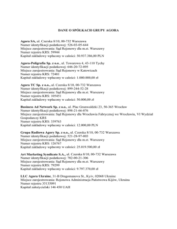 DANE O SPÓŁKACH GRUPY AGORA Agora SA, ul. Czerska 8/10, 00-732 Warszawa Numer identyfikacji podatkowej: 526-03-05-644 Miejsce zarejestrowania: Sąd Rejonowy dla m.st. Warszawy Numer rejestru KRS: 59944 Kapitał zakładowy wpłacony w całości: 50.937.386,00 PLN Agora-Poligrafia Sp. z o.o., ul. Towarowa 4, 43-110 Tychy Numer identyfikacji podatkowej: 646-20-72-095 Miejsce zarejestrowania: Sąd Rejonowy w Katowicach Numer rejestru KRS: 72481 Kapitał zakładowy wpłacony w całości: 1.000.000,00 zł Agora TC Sp. z o.o., ul. Czerska 8/10, 00-732 Warszawa Numer identyfikacji podatkowej: 899-244-52-28 Miejsce zarejestrowania: Sąd Rejonowy dla m.st. Warszawy Numer rejestru KRS: 105451 Kapitał zakładowy wpłacony w całości: 50.000,00 zł Business Ad Network Sp. z o.o., ul. Plac Grunwaldzki 23, 50-365 Wrocław Numer identyfikacji podatkowej: 898-21-66-076 Miejsce zarejestrowania: Sąd Rejonowy dla Wrocławia Fabrycznej we Wrocławiu, VI Wydział Gospodarczy KRS Numer rejestru KRS: 339763 Kapitał zakładowy wpłacony w całości: 12.000,00 PLN Grupa Radiowa Agory Sp. z o.o., ul. Czerska 8/10, 00-732 Warszawa Numer identyfikacji podatkowej: 521-28-97-003 Miejsce zarejestrowania: Sąd Rejonowy dla m.st. Warszawy Numer rejestru KRS: 126767 Kapitał zakładowy wpłacony w całości: 25.019.500,00 zł Art Marketing Syndicate S.A., ul. Czerska 8/10, 00-732 Warszawa Numer identyfikacji podatkowej: 782-00-21-306 Miejsce zarejestrowania: Sąd Rejonowy dla m.st. Warszawy Numer rejestru KRS: 79299 Kapitał zakładowy wpłacony w całości: 9.797.370,00 zł LLC Agora Ukraine, 31-B Dragomanova St., Kyiv, 02068 Ukraine Miejsce zarejestrowania: Rejonowa Administracja Państwowa Kijów, Ukraina Numer rejestru 35135091 Kapitał założycielski 146 450 UAH Agora Press Ltd., 19 Dragomanova St., Kyiv, 02068 Ukraine Miejsce zarejestrowania: Rejonowa Administracja Państwowa Kijów, Ukraina Numer rejestru 36058610 Kapitał założycielski 63 928,25 UAH A2 Multimedia Sp. z o.o., ul. Biały Kamień 3, 02-593 Warszawa Numer identyfikacji podatkowej: 108-00-04-301 Miejsce zarejestrowania: Sąd Rejonowy dla m.st. Warszawy Numer rejestru KRS: 298851 Kapitał zakładowy wpłacony w całości: 4.000.000,00 zł Trader.com (Polska) Sp. z o.o., ul. Czerska 8/10, 00-732 Warszawa Numer identyfikacji podatkowej: 522-010-28-63 Miejsce zarejestrowania: Sąd Rejonowy dla m.st. Warszawy Numer rejestru KRS: 87256 Kapitał zakładowy wpłacony w całości: 35.637.000,00 zł Projekt Inwestycyjny Sp. z o.o., ul. Czerska 8/10, 00-732 Warszawa Numer identyfikacji podatkowej: 521-31-97-897 Miejsce zarejestrowania: Sąd Rejonowy dla m. st. Warszawy Numer rejestru KRS: 113703 Kapitał zakładowy wpłacony w całości: 50.000,00 zł Adtaily Sp. z o.o., ul. Józefińska 22/9, 30-529 Kraków Numer identyfikacji podatkowej: 679-29-96-939 Miejsce zarejestrowania: Sąd Rejonowy dla Krakowa Śródmieścia Numer rejestru KRS: 324436 Kapitał zakładowy wpłacony w całości: 30.950,00 zł Polskie Badania Internetu Sp. z o.o., Al. Jerozolimskie 65/79, 00-697 Warszawa Numer identyfikacji podatkowej: 525-21-89-123 Miejsce zarejestrowania: Sąd Rejonowy dla m. st. Warszawy Numer rejestru KRS: 26069 Kapitał zakładowy wpłacony w całości: 416.000,00 zł